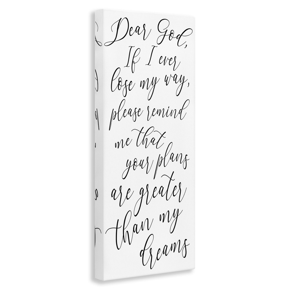 Proudly made in the USA, Our stretched canvas is created with the highest standards. We use only the highest quality inks and canvas on our in house Mimaki printers, and then hand cut and stretch each piece over a 1.5 inch thick wooden frame for hanging. The art comes ready to hang with no installation required.Features:Wall Art is Ready to Hang - No Installation or Hardware Needed. For Easy Set Up Lean or Layer Artwork on Shelf or Against Wall.Our stretched canvas is created with the highest standards. We use only the highest quality inks and canvas on our in house Mimaki printers, and then hand cut and stretch each piece over a 1.5 inch thick wooden frame for hanging. Made In USA.Artwork Ideal for any Living Room, Den, Entryway, Bedroom, Office, Kitchen or Bathroom.Design by Anna Quach Free Shipping Over $49.99* Details Stupell Dear God Your Plans Are Greater Motivational Phrase Canvas Wall Art - Product Description: Proudly made in the USA, Our stretched canvas is created with the highest standards. We use only the highest quality inks and canvas on our in house Mimaki printers, and then hand cut and stretch each piece over a 1.5 inch thick wooden frame for hanging. The art comes ready to hang with no installation required. Features: Wall Art is Ready to Hang - No Installation or Hardware Needed. For Easy Set Up Lean or Layer Artwork on Shelf or Against Wall. Our stretched canvas is created with the highest standards. We use only the highest quality inks and canvas on our in house Mimaki printers, and then hand cut and stretch each piece over a 1.5 inch thick wooden frame for hanging. Made In USA. Artwork Ideal for any Living Room, Den, Entryway, Bedroom, Office, Kitchen or Bathroom. Design by Anna Quach