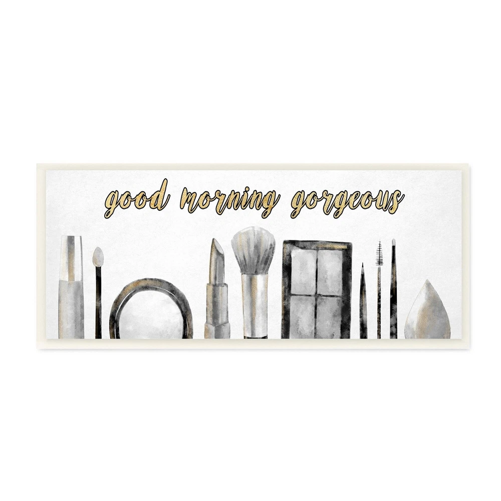 Proudly made in the USA, all of our wall plaques start off as high quality lithograph prints that are then mounted on durable MDF wood. Each piece is hand finished and comes with a fresh layer of foil on the sides to give it a crisp clean look. It arrives ready to hang with no installation required, and comes with sturdy clear corners to keep it from damaging in transit.Features:Wall Art is Ready to Hang - No Installation or Hardware Needed. For Easy Set Up Lean or Layer Artwork on Shelf or Against Wall.All of our wall plaques start off as high quality lithograph prints that are then mounted on durable 0.5 inch thick MDF wood. Each piece is hand finished and comes with a fresh layer of foil on the sides to give it a crisp clean look. Made In USA.Artwork Ideal for any Living Room, Den, Free Shipping Over $49.99* Details Stupell Good Morning Gorgeous Black Gold Watercolor Fashion Word Design Wood Product Description: Proudly made in the USA, all of our wall plaques start off as high quality lithograph prints that are then mounted on durable MDF wood. Each piece is hand finished and comes with a fresh layer of foil on the sides to give it a crisp clean look. It arrives ready to hang with no installation required, and comes with sturdy clear corners to keep it from damaging in transit. Features: Wall Art is Ready to Hang - No Installation or Hardware Needed. For Easy Set Up Lean or Layer Artwork on Shelf or Against Wall. All of our wall plaques start off as high quality lithograph prints that are then mounted on durable 0.5 inch thick MDF wood. Each piece is hand finished and comes with a fresh layer of foil on the sides to give it a crisp clean look. Made In USA. Artwork Ideal for any Living Room, Den, Entryway, Bedroom, Office, Kitchen or Bathroom. Design by Ziwei Li