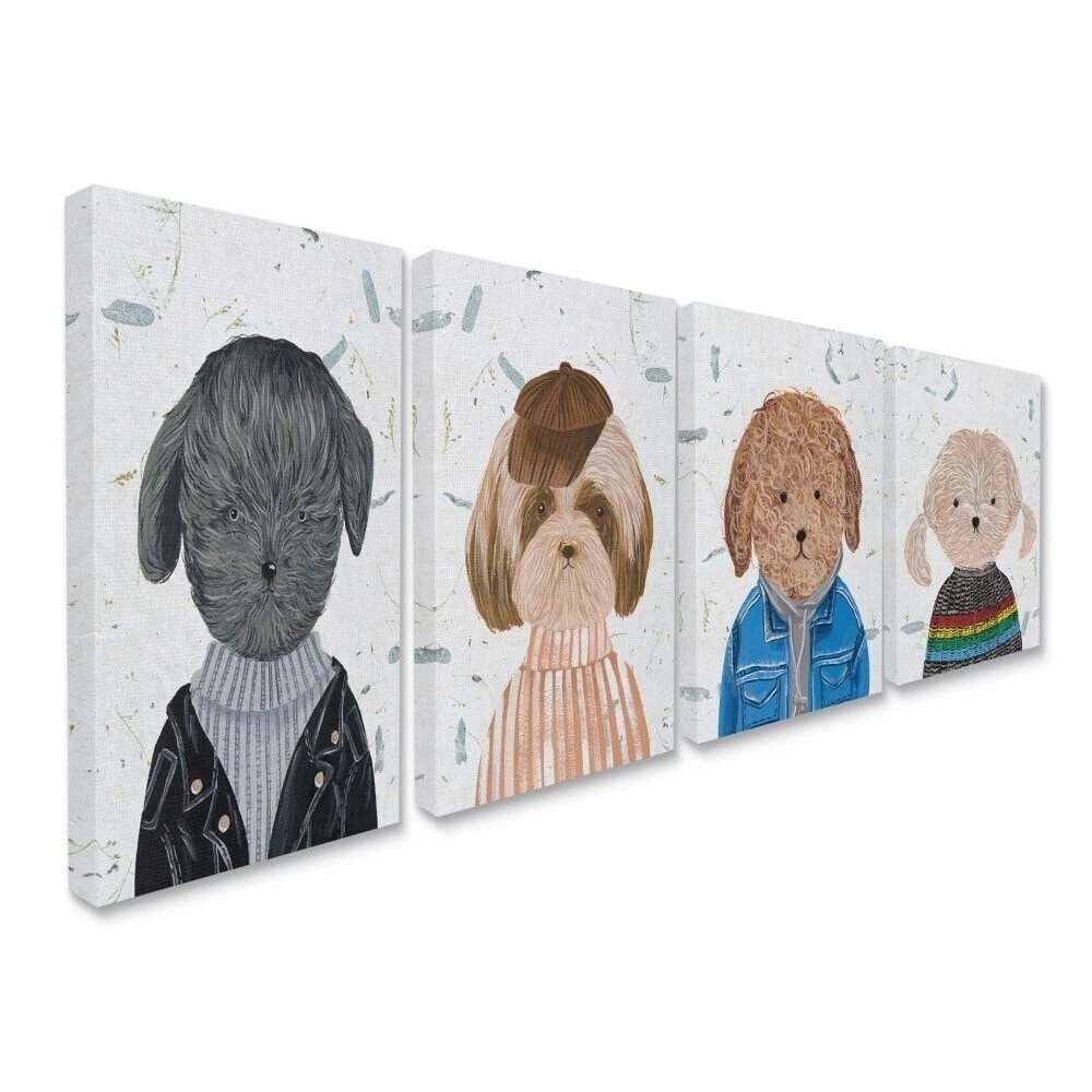 The more the better, right? Four piece sets of canvas help to fill up the entire wall with excitement. Proudly made in the USA, our stretched canvas is created with only the highest standards. We print with high quality inks and canvas, and then hand cut and stretch it over a 1.5 inch thick wooden frame. The art comes ready to hang with no installation required.Features:Wall Art is Ready to Hang - No Installation or Hardware Needed. For Easy Set Up Lean or Layer Artwork on Shelf or Against Wall.Our stretched canvas is created with the highest standards. We use only the highest quality inks and canvas on our in house Mimaki printers, and then hand cut and stretch each piece over a 1.5 inch thick wooden frame for hanging. Made In USA.Artwork Ideal for any Living Room, Den, Entryway, Bedroom, Free Shipping Over $49.99* Details Stupell Hipster Dogs Funny Animal Paintings, 4pc Multi Piece Canvas Wall Art Product Description: The more the better, right? Four piece sets of canvas help to fill up the entire wall with excitement. Proudly made in the USA, our stretched canvas is created with only the highest standards. We print with high quality inks and canvas, and then hand cut and stretch it over a 1.5 inch thick wooden frame. The art comes ready to hang with no installation required. Features: Wall Art is Ready to Hang - No Installation or Hardware Needed. For Easy Set Up Lean or Layer Artwork on Shelf or Against Wall. Our stretched canvas is created with the highest standards. We use only the highest quality inks and canvas on our in house Mimaki printers, and then hand cut and stretch each piece over a 1.5 inch thick wooden frame for hanging. Made In USA. Artwork Ideal for any Living Room, Den, Entryway, Bedroom, Office, Kitchen or Bathroom. Design by Melissa Wang