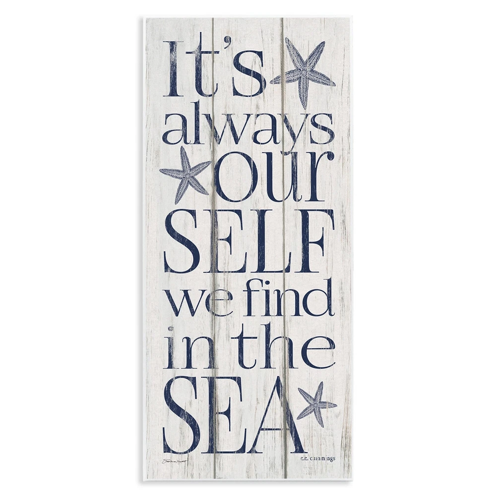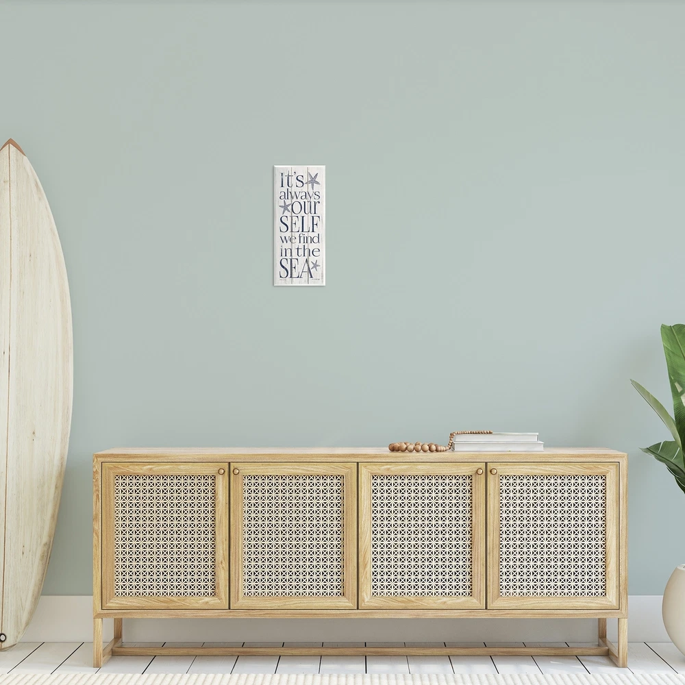 Proudly made in the USA, all of our wall plaques start off as high quality lithograph prints that are then mounted on durable MDF wood. Each piece is hand finished and comes with a fresh layer of foil on the sides to give it a crisp clean look. It arrives ready to hang with no installation required, and comes with sturdy clear corners to keep it from damaging in transit.Features:Wall Art is Ready to Hang - No Installation or Hardware Needed. For Easy Set Up Lean or Layer Artwork on Shelf or Against Wall.All of our wall plaques start off as high quality lithograph prints that are then mounted on durable 0.5 inch thick MDF wood. Each piece is hand finished and comes with a fresh layer of foil on the sides to give it a crisp clean look. Made In USA.Artwork Ideal for any Living Room, Den, Free Shipping Over $49.99* Details Stupell Our Self We Find In The Sea Planked Look, Wall Plaque, 7 x 0.5 x 17, Product Description: Proudly made in the USA, all of our wall plaques start off as high quality lithograph prints that are then mounted on durable MDF wood. Each piece is hand finished and comes with a fresh layer of foil on the sides to give it a crisp clean look. It arrives ready to hang with no installation required, and comes with sturdy clear corners to keep it from damaging in transit. Features: Wall Art is Ready to Hang - No Installation or Hardware Needed. For Easy Set Up Lean or Layer Artwork on Shelf or Against Wall. All of our wall plaques start off as high quality lithograph prints that are then mounted on durable 0.5 inch thick MDF wood. Each piece is hand finished and comes with a fresh layer of foil on the sides to give it a crisp clean look. Made In USA. Artwork Ideal for any Living Room, Den, Entryway, Bedroom, Office, Kitchen or Bathroom. Design by Stephanie Workman Marrott