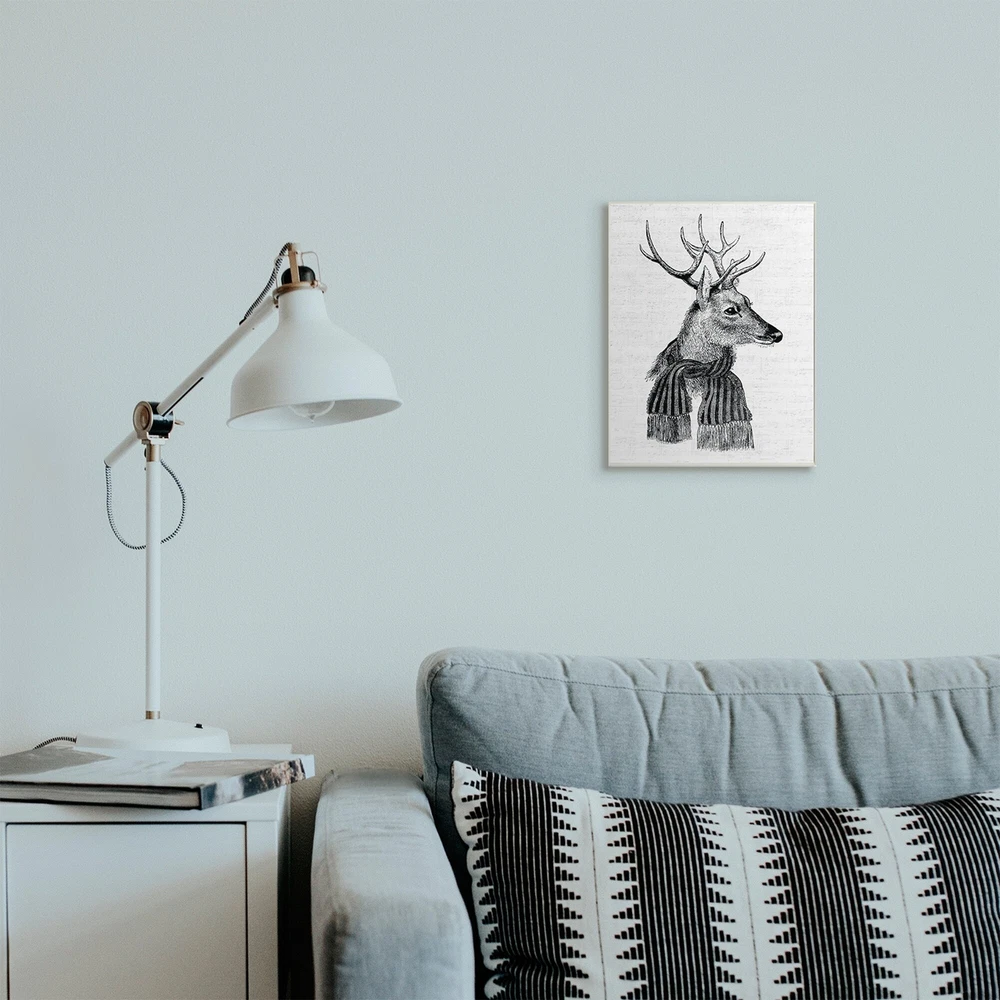Proudly made in the USA, all of our wall plaques start off as high quality lithograph prints that are then mounted on durable MDF wood. Each piece is hand finished and comes with a fresh layer of foil on the sides to give it a crisp clean look. It arrives ready to hang with no installation required, and comes with sturdy clear corners to keep it from damaging in transit.Features:Wall Art is Ready to Hang - No Installation or Hardware Needed. For Easy Set Up Lean or Layer Artwork on Shelf or Against Wall.All of our wall plaques start off as high quality lithograph prints that are then mounted on durable 0.5 inch thick MDF wood. Each piece is hand finished and comes with a fresh layer of foil on the sides to give it a crisp clean look. Made In USA.Artwork Ideal for any Living Room, Den, Free Shipping Over $49.99* Details Stupell Reindeer in Scarf Minimal Vintage Portrait Wood Wall Art Product Description: Proudly made in the USA, all of our wall plaques start off as high quality lithograph prints that are then mounted on durable MDF wood. Each piece is hand finished and comes with a fresh layer of foil on the sides to give it a crisp clean look. It arrives ready to hang with no installation required, and comes with sturdy clear corners to keep it from damaging in transit. Features: Wall Art is Ready to Hang - No Installation or Hardware Needed. For Easy Set Up Lean or Layer Artwork on Shelf or Against Wall. All of our wall plaques start off as high quality lithograph prints that are then mounted on durable 0.5 inch thick MDF wood. Each piece is hand finished and comes with a fresh layer of foil on the sides to give it a crisp clean look. Made In USA. Artwork Ideal for any Living Room, Den, Entryway, Bedroom, Office, Kitchen or Bathroom. Design by Lettered and Lined