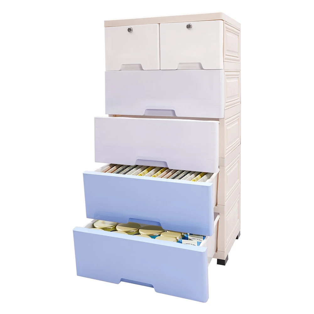 Description Cleanness and tidiness are a good attitude towards life and will put you and your family in a good mood. Our storage cabinet is made of high-quality PP with sufficient storage space and a beautiful and practical design, allowing you to neatly and efficiently organize your belongings and make you feel organized and relaxed. Say goodbye to a cluttered room and enjoy a neater, more efficient life! Details Round Corners& Edges: They can prevent your children from being injured caused by accidental collision. Convenient Handles: Each drawer has a concave handle to help you open or close drawers more easily. Small Pulleys: They are built into the bottom feet for convenient and easy moving of this cabinet. Anti-breakaway Snap: It can prevent the drawer from falling easily after pulling open to improve the safety of use. Specification Color: Gradient Blue Material: PP Process: Injection Molding Style: Modern Pattern: Solid Shape: Rectangular Assembly Required: Yes Installation Type: Floor Standing Number of Drawers: 6 Product Size: 50*35*102cm/19.69*13.78*40.16 inch Package Size: 51.5*49*40.5cm/20.28*19.29*15.94 inch Overall Load Capacity: 20-30kg/44.09-66.13 lbs Gross Weight: 7.9kg/17.42 lbs Net Weight: 6.8kg/14.99 lbs Package Included 1* Storage Cabinet 2Pairs* Keys Other Accessories for Assembly Notes Please note that this product does not include clothes and other storage items. Please allow the slight color difference caused by the shooting light and 1-3cm error due to manual measurement and make sure you do not mind before ordering. Sturdy and Durable: It is made of high-quality PP with an injection molding process, which is eco-friendly, odorless, anti-corrosion, and rust-resistant, ensuring its beauty and long-term use. Life Assistant: The lower 4 large drawers allow you to categorize clothes and other daily necessities to create a cleaner and tidier home environment. The upper 2 lockable drawers can hold important or dangerous items such as scissors and utility knives, and the top platform can hold remote control boards, alarm clocks, potted plants, and other items within reach. It's also at the right height for kids to reach easily and develop their organizing habits. Excellent Load Capacity: The high-quality materials and rectangular construction give it excellent stability and can hold 44.09-66.13 lbs, allowing you to place items with confidence. Minimalist Style: The gradient blue color scheme combines rectangular shapes with clean lines to create a minimalist aesthetic, highlighting a strong modern appeal and adding a touch of sophistication to your room. Simple Installation: With complete installation parts and a simple structure, you can assemble it yourself and enjoy the fun of the installation process. Easy to Clean: Thanks to its smooth surface and simple construction, you can wipe it clean with a damp rag. Ideal Gift: Thanks to its practicality, it will make a fine gift for family, friends, and loved ones on Christmas, housewarming, birthdays, anniversaries, and holidays. Customer Service: We aim to provide quality products and services. If you have any problems, please feel free to contact us. We will reply and solve the problem for you as soon as possible.