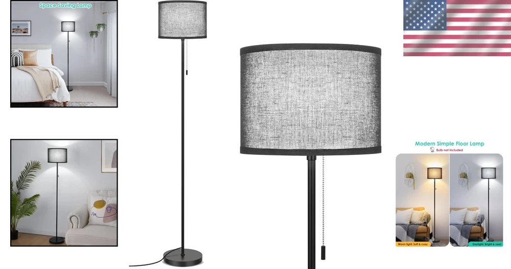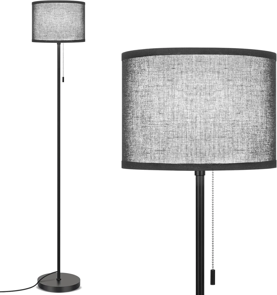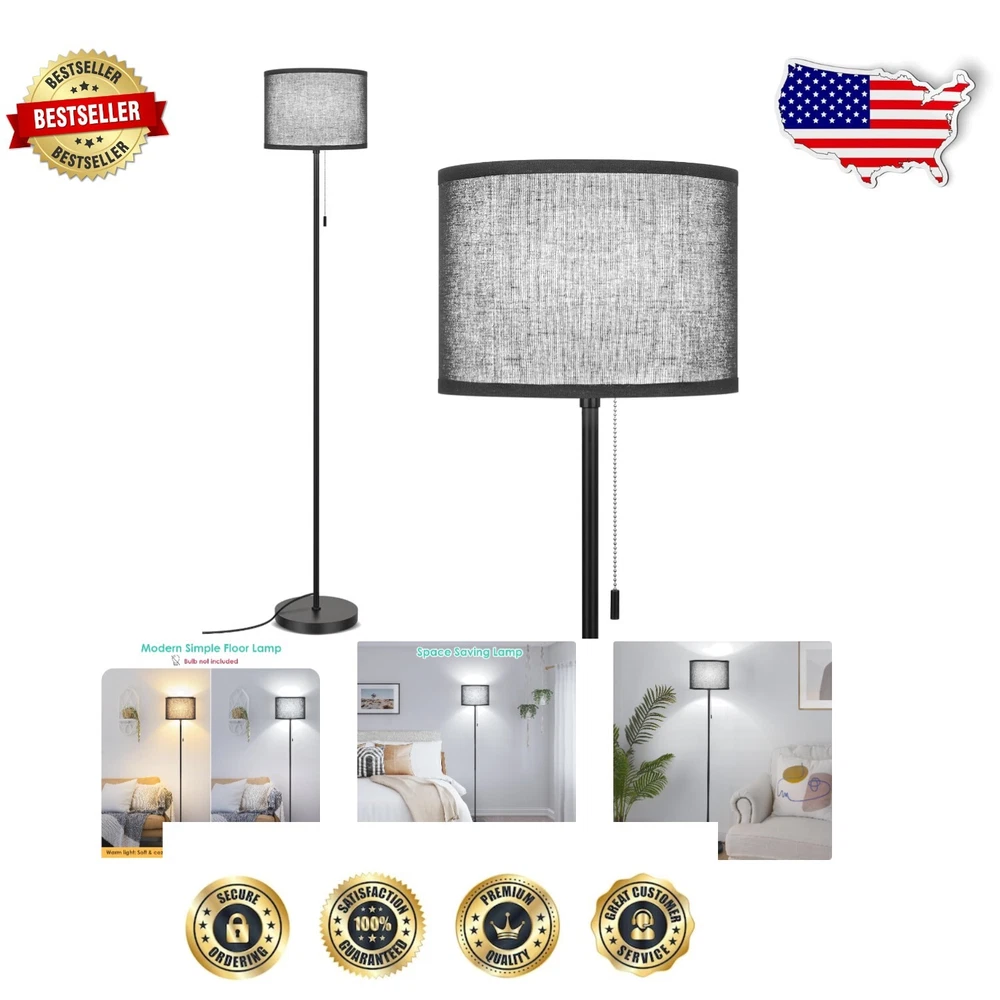 Recommended Uses For Product: Reading, Decoration Color Temperature: Not specified Shape: Cylindrical Lumens: Not specified Light Source Type: Led Amperage: Not specified Style: Modern Base Material: Metal Number of Settings: 1 UPC: Does not apply Bulb Base: E26 gtin13: Does not apply Room Type: Office, Living Room, Bedroom, Kid Room Material: Metal, Linen Features: Pull Chain, Max 60 Watt Bulbs, Compatible with Smart Devices, Energy Efficient, Eye-Caring Linen Shade IP Rating: Not specified Power Consumption: 60 watts Sensor Type: Not applicable Bulb Life Hours: Not specified Lamp Type: Floor Lamp Finish: Unfinished Type: Floor Lamp Item Weight: 6.52 pounds Room: Living Room, Bedroom, Office, Kids Room Department: Unisex Baby & Toddler, Adults, Kids, Teens Color: Black Product Dimensions: 8.66"d X 8.66"w X 60.24"h Light Color: Not specified Power Source: Corded Electric Personalize: No Item Diameter: 8.66 in Labels & Certifications: Energy Efficient Finish Type: Unfinished Control Style: Pull Chain Brand: Unbranded Voltage: Not specified Shade Color: Black Shade Shape: Cylindrical Shade Material: Linen Switch Type: Pull Chain Output Voltage: Not specified Lighting Technology: LED Bulb Shape Code: A19