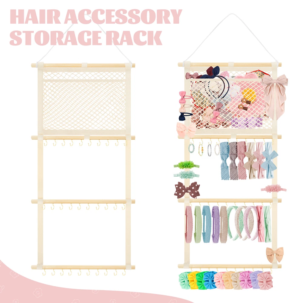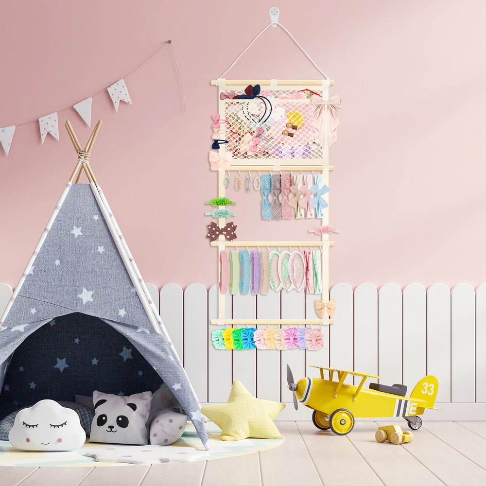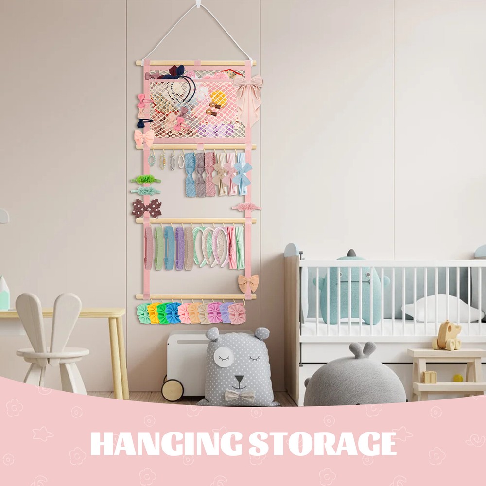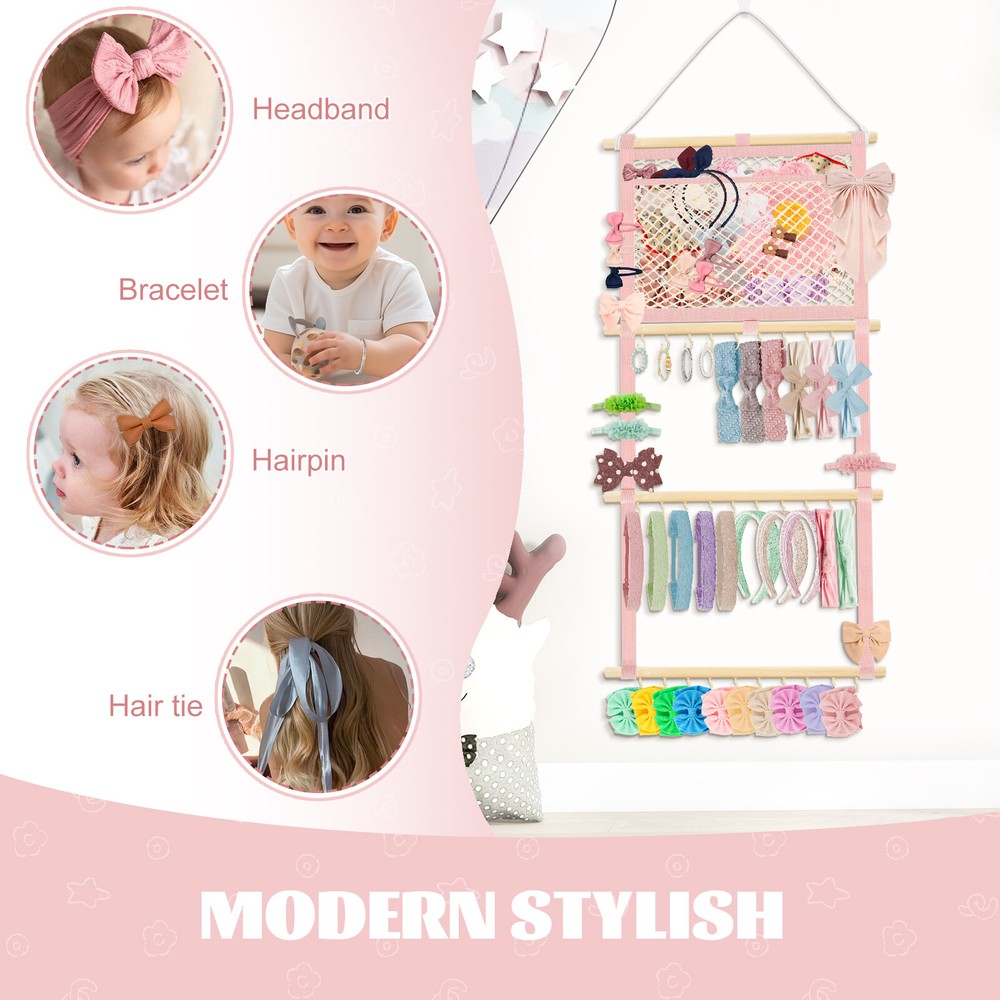 This headband display stand is a game-changer for keeping accessories organized! The sturdy metal hooks and strong cotton canvas mesh hold everything securely without slipping. The smooth wooden sticks add durability while the non-marking nails make wall mounting easy. Perfect for storing baby headbands, bows, or even scarves—saves so much space and looks neat! Highly recommend for its quality and practicality.