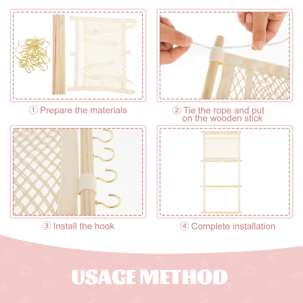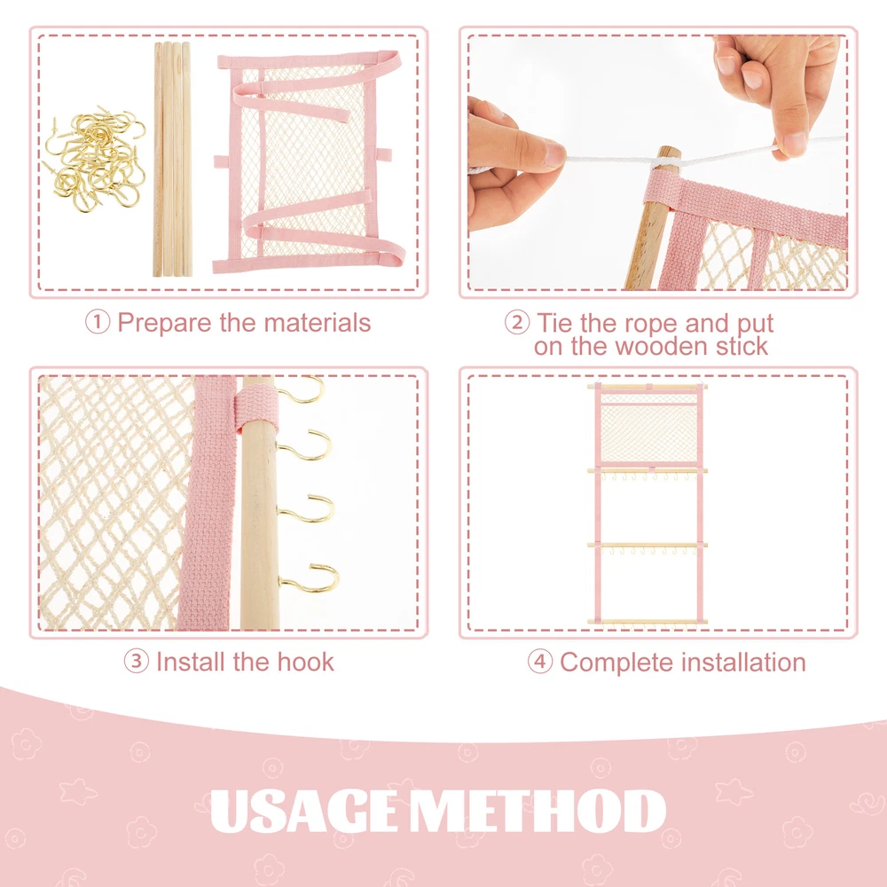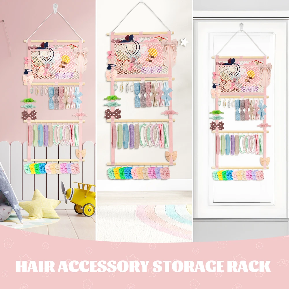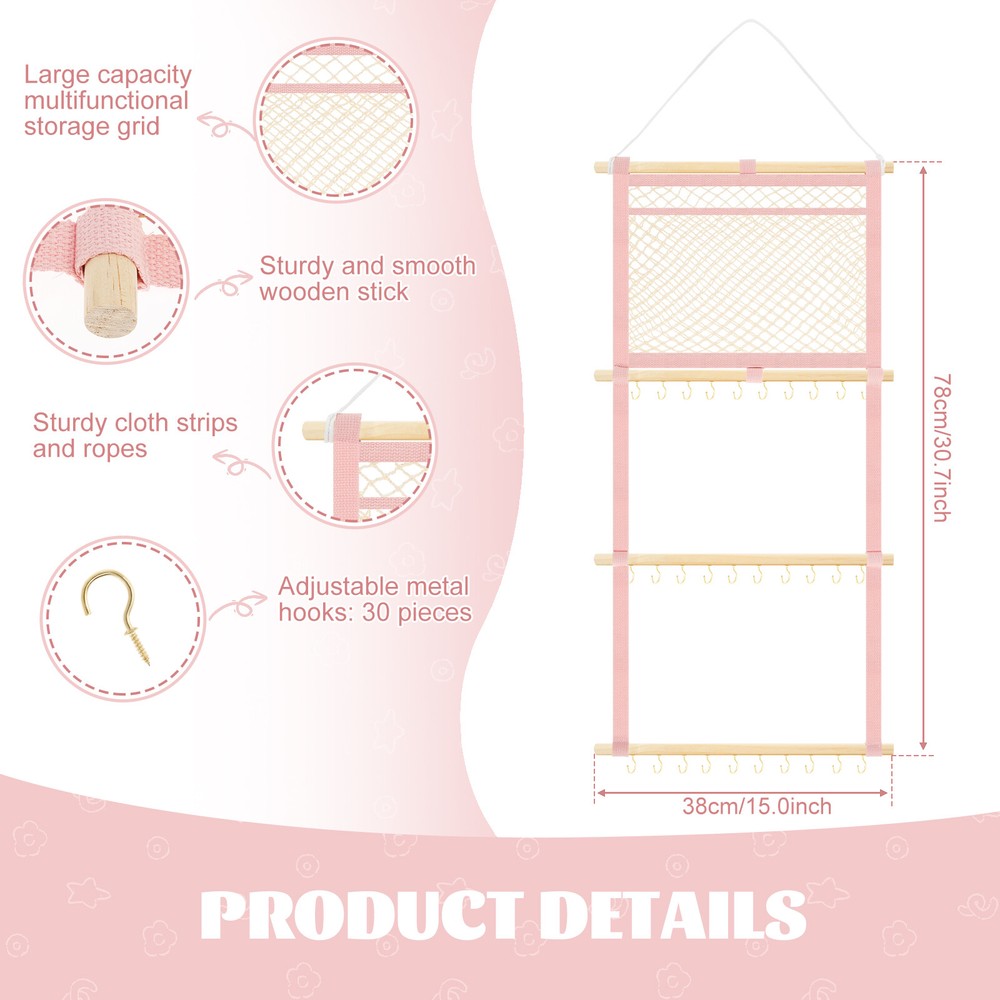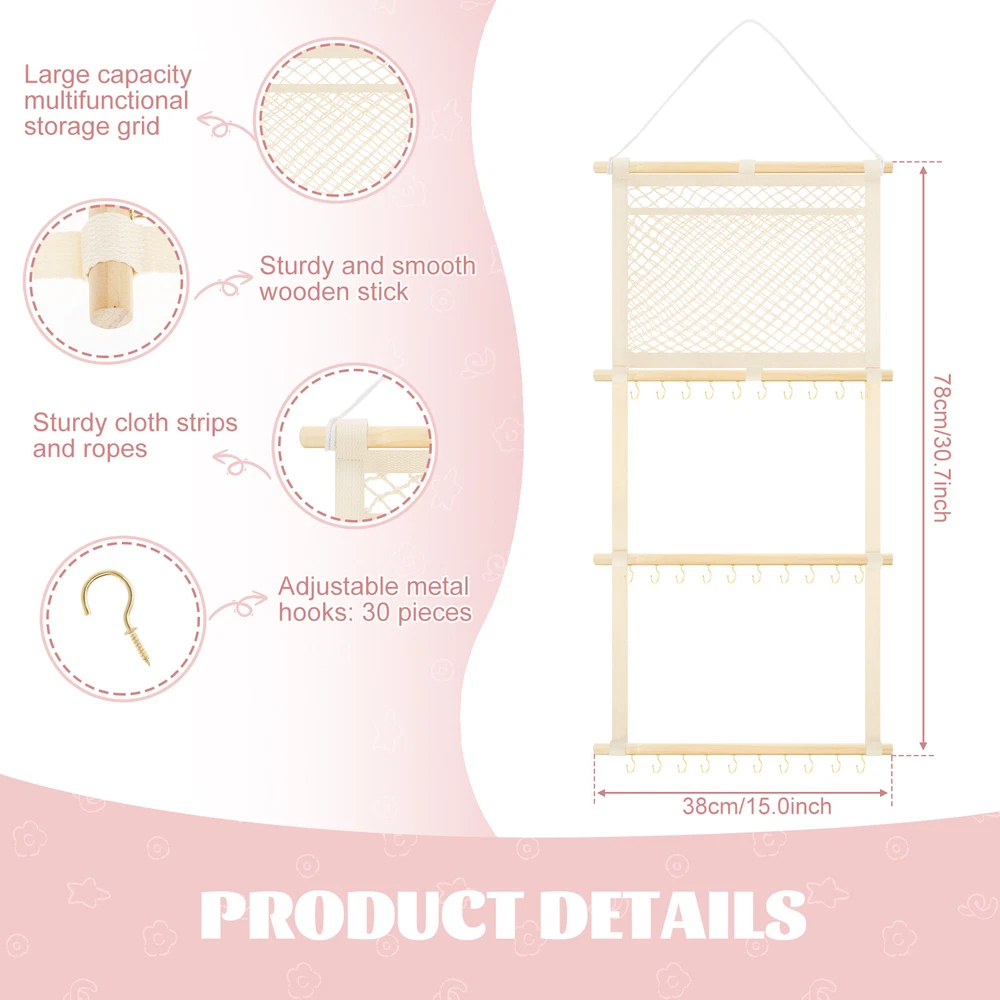 This headband display stand is a game-changer for keeping accessories organized! The sturdy metal hooks and strong cotton canvas mesh hold everything securely without slipping. The smooth wooden sticks add durability while the non-marking nails make wall mounting easy. Perfect for storing baby headbands, bows, or even scarves—saves so much space and looks neat! Highly recommend for its quality and practicality.