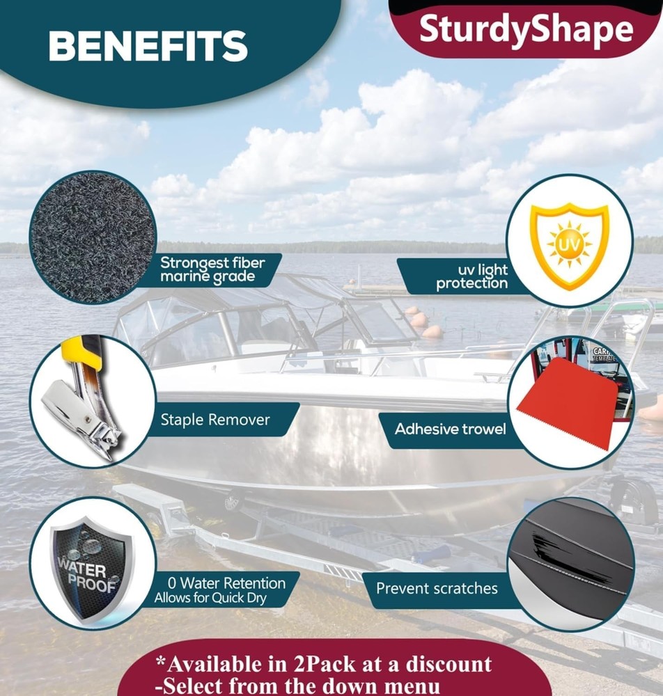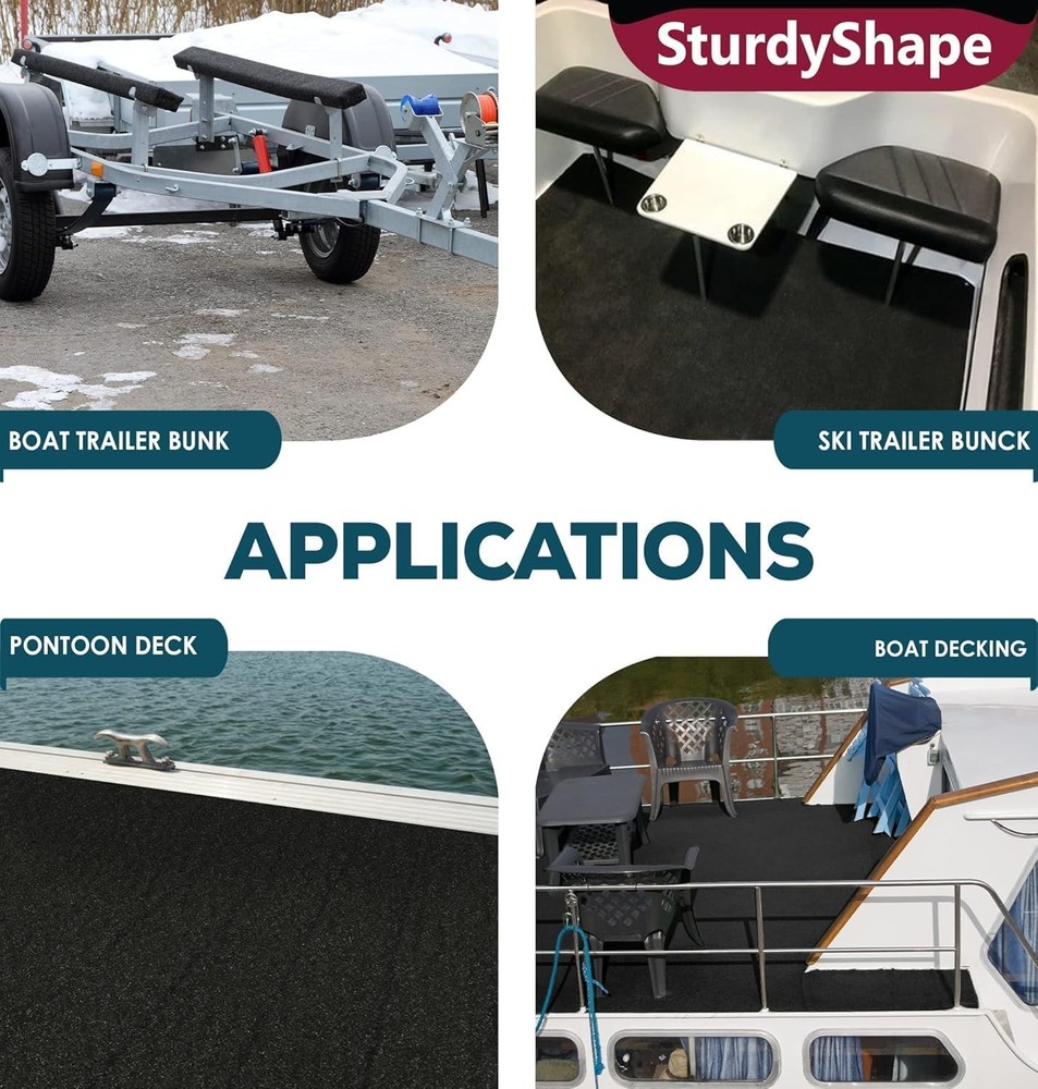 SturdyShape Boat Trailer Bunk Carpet Kit 13ftx12in 25oz- Marine 1 Black Description Elevate your boating experience with the SturdyShape Boat Trailer Bunk Carpet Kit. Measuring inches, this black marine carpet is designed for boat trailers, lift runners, and jet skis. Made from durable marine-grade materials, it protects against wear while ensuring a snug fit. The easy installation process allows for quick replacement of old carpeting, enhancing both style and function. With weather-resistant properties and enhanced grip, our bunk carpet keeps your boat secure during transport. Invest in quality with our trailer bunk protectors Features: Made to last - The boat trailer carpeting is made of contractor marine grade carpet. Bunk carpet for boat trailers is tear and UV resistant. SturdyShape marine bunk carpet will resist over time and provide protection for your boat Wide applications - Boat carpet can be used on decking, boat carpeting pontoon to reduce slips & trips. Bunk covers for boat trailers to protect your boat / ski jet. Other applications as Van Conversion marine carpeting lining & Garage floor lining Boat trailer bunk carpet kit - Marine carpet for boats kit will provide you with Extra products that you need to do the job. The bunk trailer carpet kit includes 1 bunk rail carpet - 1 Adhesive spreader - 1 Staple remover Easy to Use: Designed for simplicity, the marine carpet for trailer bunks allows you to achieve a professional finish without hassle. The included adhesive spreader ensures a neat application, saving you time and effort during installation. Right Dimensions: Measuring 13 ft by 12 inches, this boat runner carpet is great for covering 4x2 bunks. With an 8mm thickness and a strong backing made quality materials, our carpet ensures excellent durability and support. Product Details: Brand: SturdyShape Color: 1 Black Material: Polyester Product Dimensions: 12"W Installation Type: Glue Down Backing Type: Polyester Pile Height: 0.315 inches Unit Count: 1.0 Count Manufacturer: SturdyShape Item Package Dimensions L x W x H: 12.48 x 10.91 x 3.66 inches Package Weight: 1.03 Kilograms Item Dimensions LxWxH: 156 x 12 x 0.04 inches Brand Name: SturdyShape Model Name: 2023 Suggested Users: Unisex-Adult Part Number: 2023 Included Components: See Description Brand: SturdyShape Color: 1 Black Material: Polyester Product Dimensions: 12"W Installation Type: Glue Down Handling We will ship all orders within 1 business day of payment. Delivery We Do Not Ship Outside of the Continental US. Return Policy All items qualify for returns within 30 days of receipt. Buyer is responsible for return shipping on any item that is not damaged. Feedback We take our reputation seriously, we buy and sell online, so we understand the value of trust. If you are unsatisfied with your order, please contact us and we will work with you to resolve it to your satisfaction.