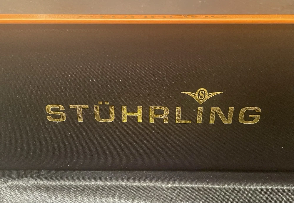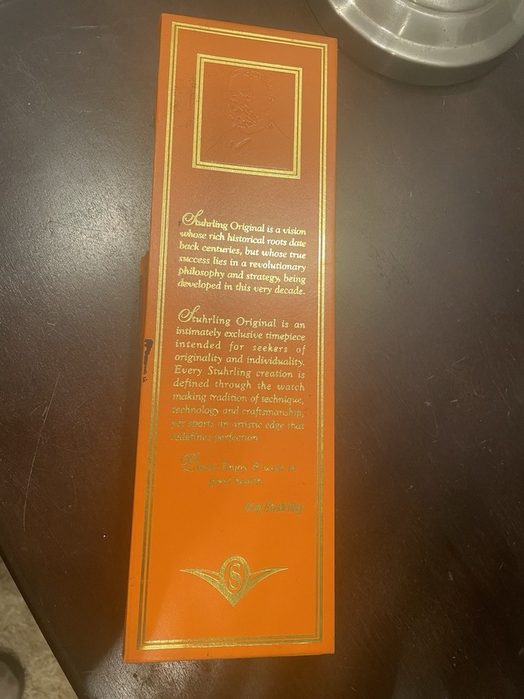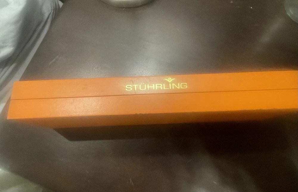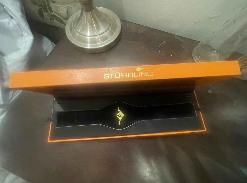 This is an empty STUHRLING watch box. There is a tear on the back side of the box (see photos). Otherwise in good used condition. 11.75” x 3.5” x 1.5”