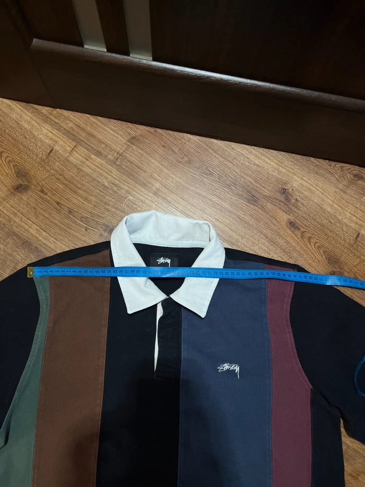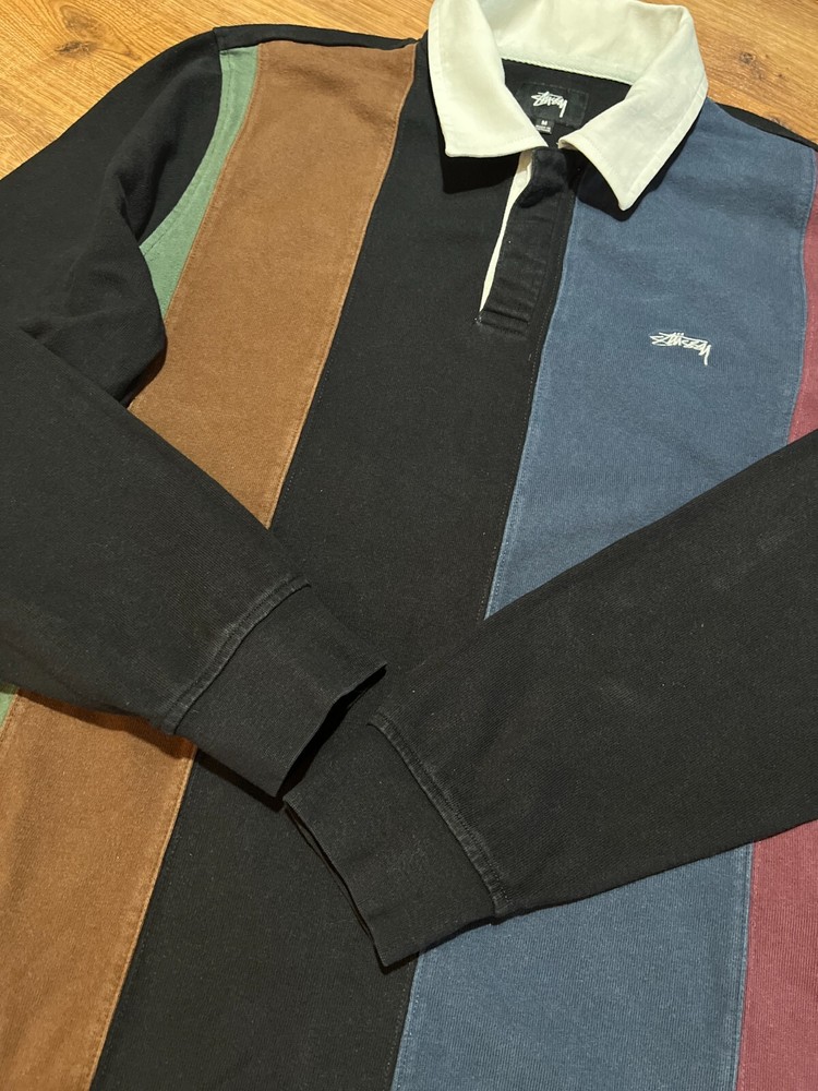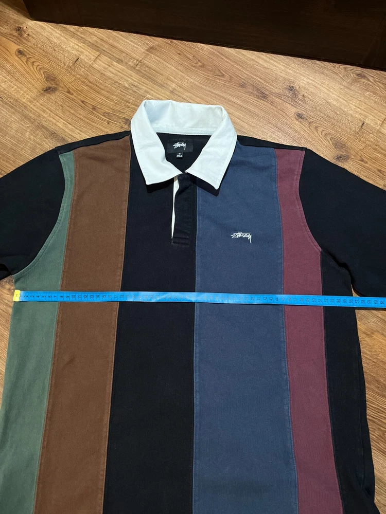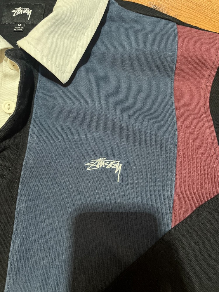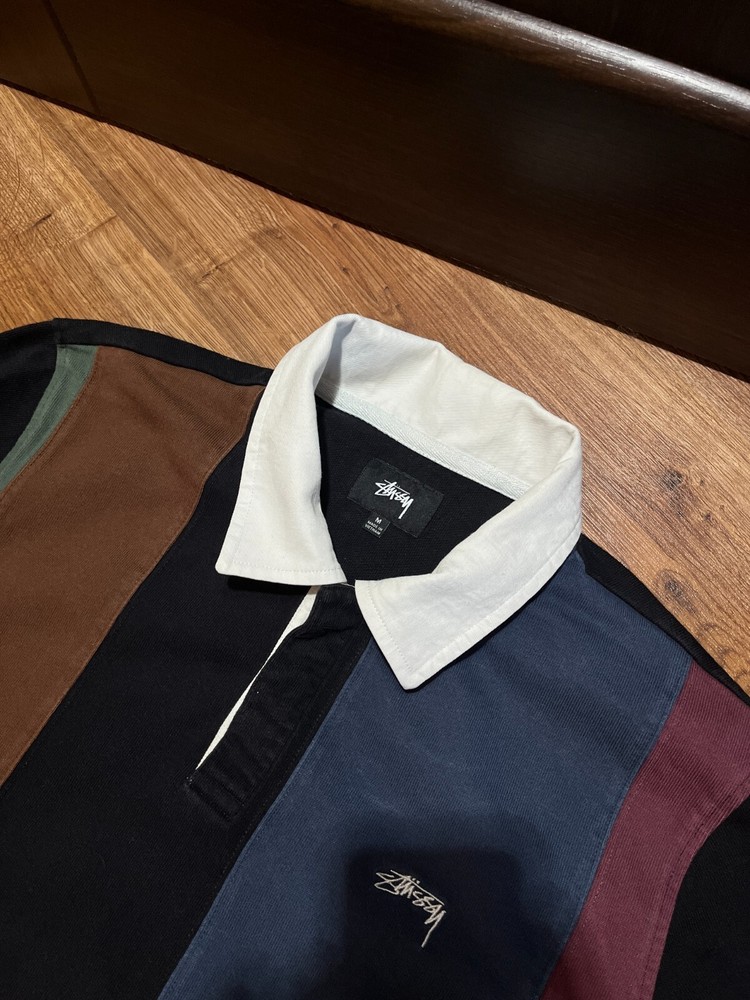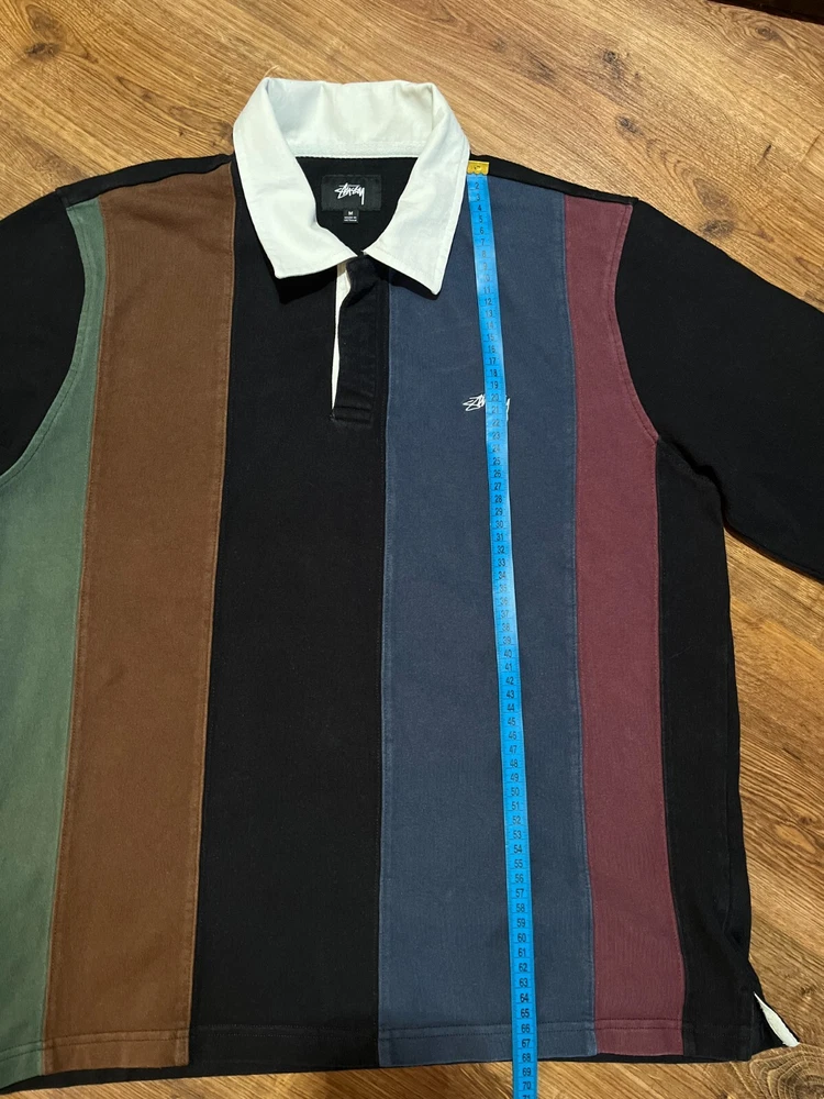 Performance/Activity: Rugby Size Type: Regular Type: Polo Sleeve Length: Long Sleeve Neckline: Collared Fit: Regular Material: Cotton Pattern: Striped Color: Black Size: M Department: Men Season: Fall, Spring, Summer Country/Region of Manufacture: Vietnam Brand: Stussy