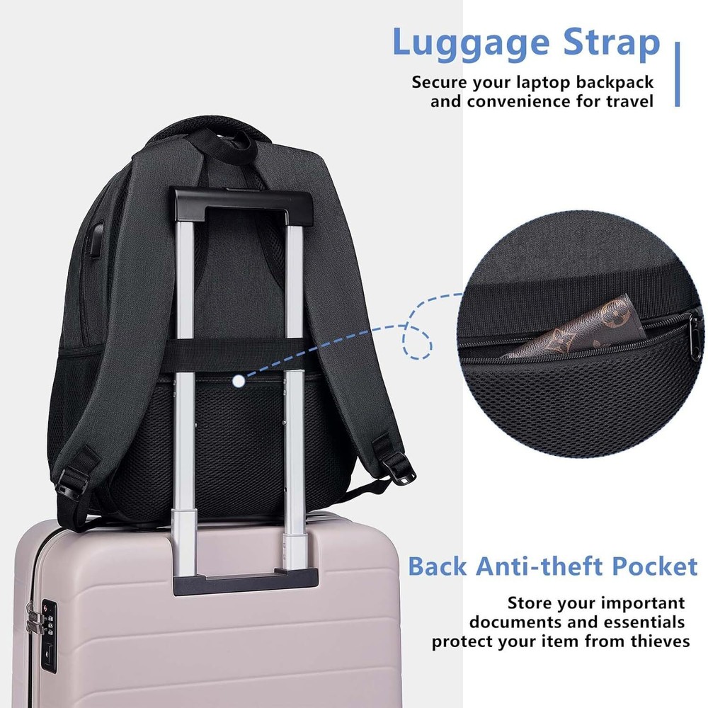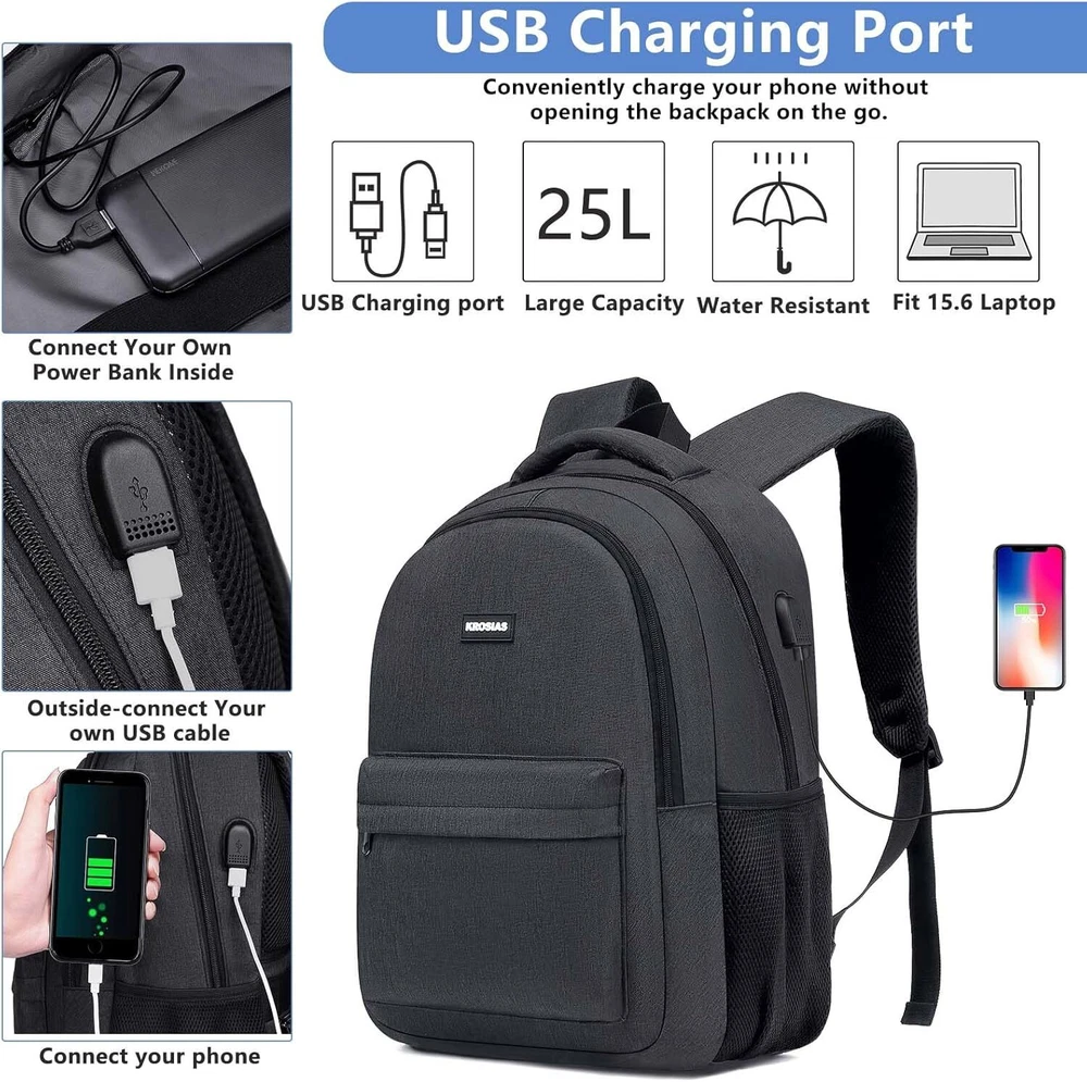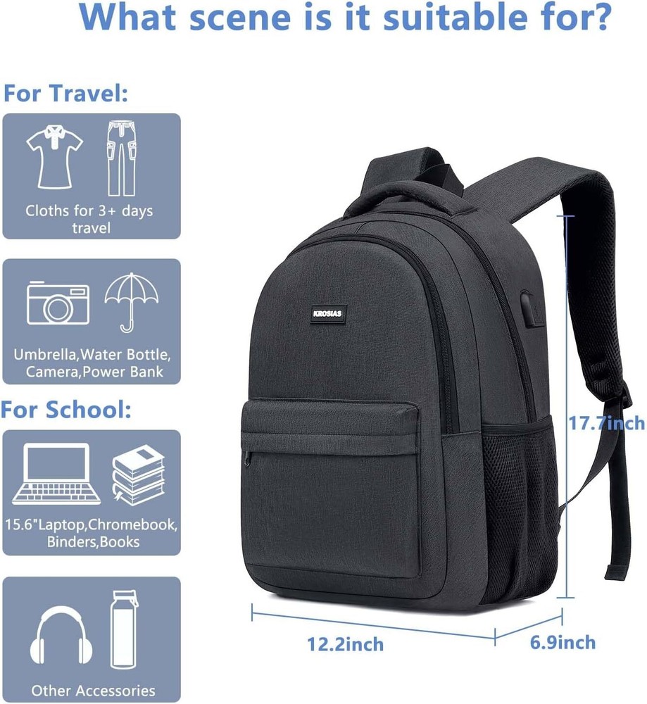 School Backpack for Teen Boys, Men and Women 15.6 inch, Black Product Details Large Capacity: This large laptop backpack is designed for both women and men, making it a perfect choice for anyone. With a spacious capacity of 20-30 liters, it provides ample storage options. It features a padded laptop sleeve and three separate compartments with lots of inside pockets, ensuring that you can keep your essentials such as 15.6 inch laptop, A4 folder, books, clothes, keys within reach and organized. Sturdy Material & Solid: Carefully crafted, this school backpack is made of water resistant and sturdy polyester fabric and features a sturdy and smooth zipper, ensuring that you can always rely on this laptop backpack for any load. Moreover, each backpack for teens is equipped with a sturdy web haul handle. Size: 17.7'' x 12.2'' x 6.9''. Comfortable to USE: This school backpack is designed for the convenience and comfort of teenage boys and girls. Each college backpack features an ergonomic back panel with multi layer sponge padding and S-curved shoulder straps with breathable mesh that can be easily adjusted to fit a student's body. Back luggage straps design allows your backpack fit on luggage or suitcase for easier transport. USB Port Design & Anti Theft: The USB laptop backpack offers the convenience of charging and connecting devices without the hassle of carrying additional chargers or cables. It allows for the charging of smartphones, tablets, or other electronic devices anytime and anywhere, enhancing convenience and flexibility (Power bank not included). ANTI THEFT back hidden zipper pocket will keep your valuable belongings. Fashion Backpack: A stylish appearance is the most popular choice among students for school backpacks. Moreover, they can also function as laptop back pack or school bookbags. Whether you are in college, high school, middle school, or even commuting to work, it is crucial to invest in a KROSIAS backpack that offers exceptional quality and functionality. (Age: over 3 years old)