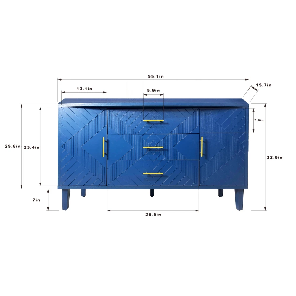 Product Features Exquisite Carving: Elevate your living space with the intricate carved surface of this cabinet, adding a touch of elegance and sophistication to any room. Craftsmanship and Durability:Made of MDF with solid wood veneer, this cabinet is not only visually appealing but also built to last.The sturdy solid wood legs provide stability and support. Curved Desktop: The curved design of the desktop, with a widened extension effect in the center section, provides additional workspace while maintaining a sleek and modern aesthetic. Quality Hardware:Enhanced with zinc alloy handles, the cabinet exudes a sense of luxury and refinement, complementing its overall design. Ample Storage Space:With two separate enclosed cabinets and three large drawers, this cabinet offers abundant storage space to keep your belongings neatly organized and easily accessible. Versatile Usage: Whether you place it in your living room, dining room, or bedroom, this versatile cabinet adds both storage and style to any space. Use it as a display case for your cherished collectibles or as a functional storage solution for everyday items. Built-in Adjustable Shelf: The cabinet is equipped with adjustable shelf that can be set at three different heights, providing you with customizable storage solutions to accommodate various items. Safe and Easy to Assemble:With simple assembly instructions and easy-to-clean surfaces, this storage cabinet is both quick and hassle-free to put together and maintain, saving you time and effort in the long run.Even after years of use, it will not fade or damage, maintaining a good appearance.The storage cabinet are equipped with anti-tipping devices to protect you and your family from potential hazards. Description Features: Experience the perfect blend of style and functionality with this exquisite cabinet, designed to enhance your home décor while offering practical storage solutions.Its exquisite craftsmanship, ample storage space, versatile functionality, and sturdy construction make it a must-have addition to any room. Whether you place it in your living room, dining room, or bedroom, this cabinet is a versatile piece of furniture. It can be used as a stylish storage solution, a display case for your treasured collectibles, or even as a media console for your entertainment devices. Specifications: Color Navy Blue Material MDF with solid wood veneer+pine legs Handle material zinc alloy Product Dimension 55.12"L x 15.75"-17.72"W x 32.68"H Weight Capacity Tabletop: 100lbs Shelf: 60lbs Drawer: 20lbs Shelf adjustable or not Yes Assembly Required Yes Package Number 1 Notice: 1. Due to lighting or display, the actual product color may differ slightly from the image. 2. Manual measurement was used, and there may be some reasonable errors. Curved Desktop: The curved design of the desktop, with a widened extension effect in the center section, provides additional workspace while maintaining a sleek and modern aesthetic.