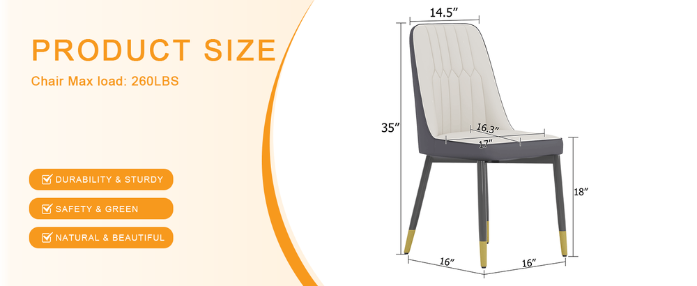 [Material and Filling]: The dining chair is made of PU material,White and dark gray splicing color, which has a soft touch and is filled with sponge, providing a comfortable sitting experience while also being easy to clean and maintain. [Backrest Design]: The backrest strap features a simple striped design, enhancing visual aesthetics. Filled with a modern atmosphere, simple yet fashionable, adding a unique charm to the home environment. [Chair Leg Design]: The black metal chair legs are paired with a gold spray decoration on the bottom, which is fashionable and stable. The black metal legs of the chair contrast sharply with the white and dark gray splic... Bathroom Elegant Dining Chairs Set of Two-piece Dining Chairs.Suitable for various places [Material and Filling]: The dining chair is made of PU material,White and dark gray splicing color, which has a soft touch and is filled with sponge, providing a comfortable sitting experience while also being easy to clean and maintain. [Backrest Design]: The backrest strap features a simple striped design, enhancing visual aesthetics. Filled with a modern atmosphere, simple yet fashionable, adding a unique charm to the home environment. [Chair Leg Design]: The black metal chair legs are paired with a gold spray decoration on the bottom, which is fashionable and stable. The black metal legs of the chair contrast sharply with the white and dark gray splicing color material, showcasing a noble and elegant temperament. [Anti slip feet]: Equipped with anti slip feet to ensure safety and stability during use. [Multiple specifications and colors]: In addition to the two-piece set, there are also four pieces per box available for selection. In addition, there are multiple colors available for the same product, all of which can be sold separately to meet personalized needs. [Applicable scenarios]: Suitable for various places such as restaurants, kitchens, living rooms, offices, etc. It can blend well into different indoor environments and add overall beauty to the space. [Weight bearing and installation]: The chair can bear a maximum weight of 260 pounds, designed ergonomically, easy to install, and does not require professional tools. It can be completed in about 15 minutes. [Color Tip]: Due to the influence of monitor parameters and lighting, the actual color of the product may differ from the picture. Please refer to the actual product color. Item Specifics Brand Unbranded Type Seating Color White,gray Material PU Item Length 17 Item Width 21.6 Item Height 35 Item Weight 15.32 Payment If you do not have a PayPal account, to get started and buy your first item with us is very easy. Simply click on the 'Buy It Now' button and follow the eBay checkout steps. Select PayPal as the payment method you then will be given the chance to enter your card details in to PayPal's secure checkout in order to pay for your order. Shipping 1. Your purchase is shipped directly to you as soon as we have received your cleared payment. 2. Normally all of parcels would be shipped within 3days(From Monday to Saturday). 3. We will send information on eBay or email if the parcel was delayed due to our holiday. 4. We provide three kinds of shipping for choice. Shipping way depend on delivery address. Returns If an unit is received defective, of course we take it back or replace it. If the unit is received as expected, we must charge for our expenses if you want to send it back. We have to charge for the work of handling, retesting and restocking. Contact Us Dear buyer, Thank you for visiting my store! Our warehouses are located in many regions around the United States. According to the customer's delivery address. Use USPS/UPS/DHL logistics transportation service. Prioritize the best quality logistics solutions to transport packages. Ensure package delivery time, At the same time. Have any after-sales problems, Feel free to contact us. At your service Bathroom DESCRIPTION PAYMENT SHIPPING RETURN POLICY CONTACT US Elegant Dining Chairs Set of Two-piece Dining Chairs.Suitable for various places [Material and Filling]: The dining chair is made of PU material,White and dark gray splicing color, which has a soft touch and is filled with sponge, providing a comfortable sitting experience while also being easy to clean and maintain. [Backrest Design]: The backrest strap features a simple striped design, enhancing visual aesthetics. Filled with a modern atmosphere, simple yet fashionable, adding a unique charm to the home environment. [Chair Leg Design]: The black metal chair legs are paired with a gold spray decoration on the bottom, which is fashionable and stable. The black metal legs of the chair contrast sharply with the white and dark gray splicing color material, showcasing a noble and elegant temperament. [Anti slip feet]: Equipped with anti slip feet to ensure safety and stability during use. [Multiple specifications and colors]: In addition to the two-piece set, there are also four pieces per box available for selection. In addition, there are multiple colors available for the same product, all of which can be sold separately to meet personalized needs. [Applicable scenarios]: Suitable for various places such as restaurants, kitchens, living rooms, offices, etc. It can blend well into different indoor environments and add overall beauty to the space. [Weight bearing and installation]: The chair can bear a maximum weight of 260 pounds, designed ergonomically, easy to install, and does not require professional tools. It can be completed in about 15 minutes. [Color Tip]: Due to the influence of monitor parameters and lighting, the actual color of the product may differ from the picture. Please refer to the actual product color. Item Specifics Brand : Unbranded Type : Seating Color : White,gray Material : PU Item Length : 17 Item Width : 21.6 Item Height : 35 Item Weight : 15.32 Payment Shipping Returns Contact Us If you do not have a PayPal account, to get started and buy your 