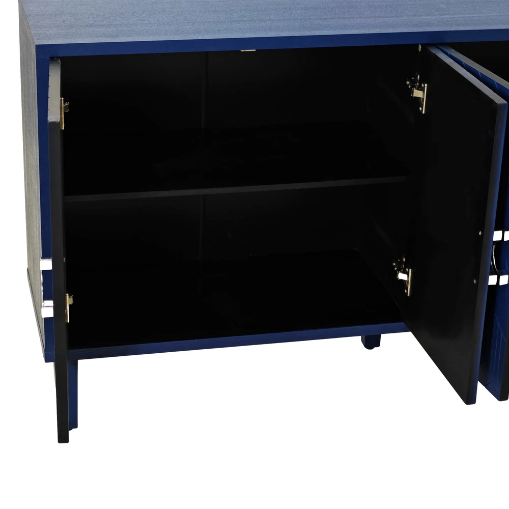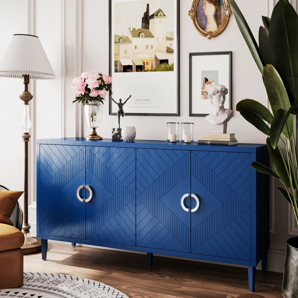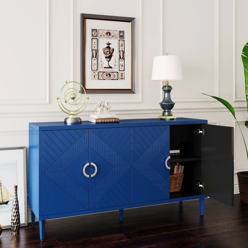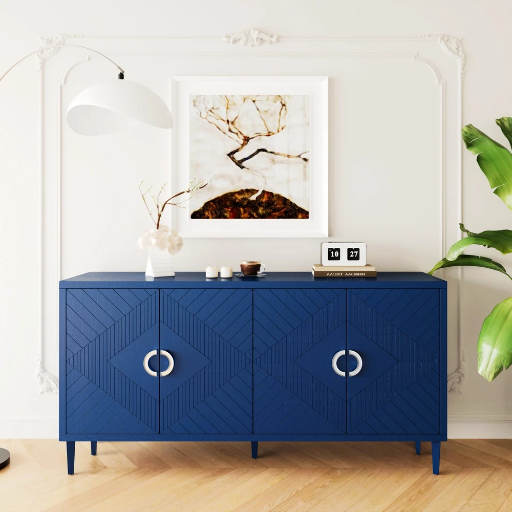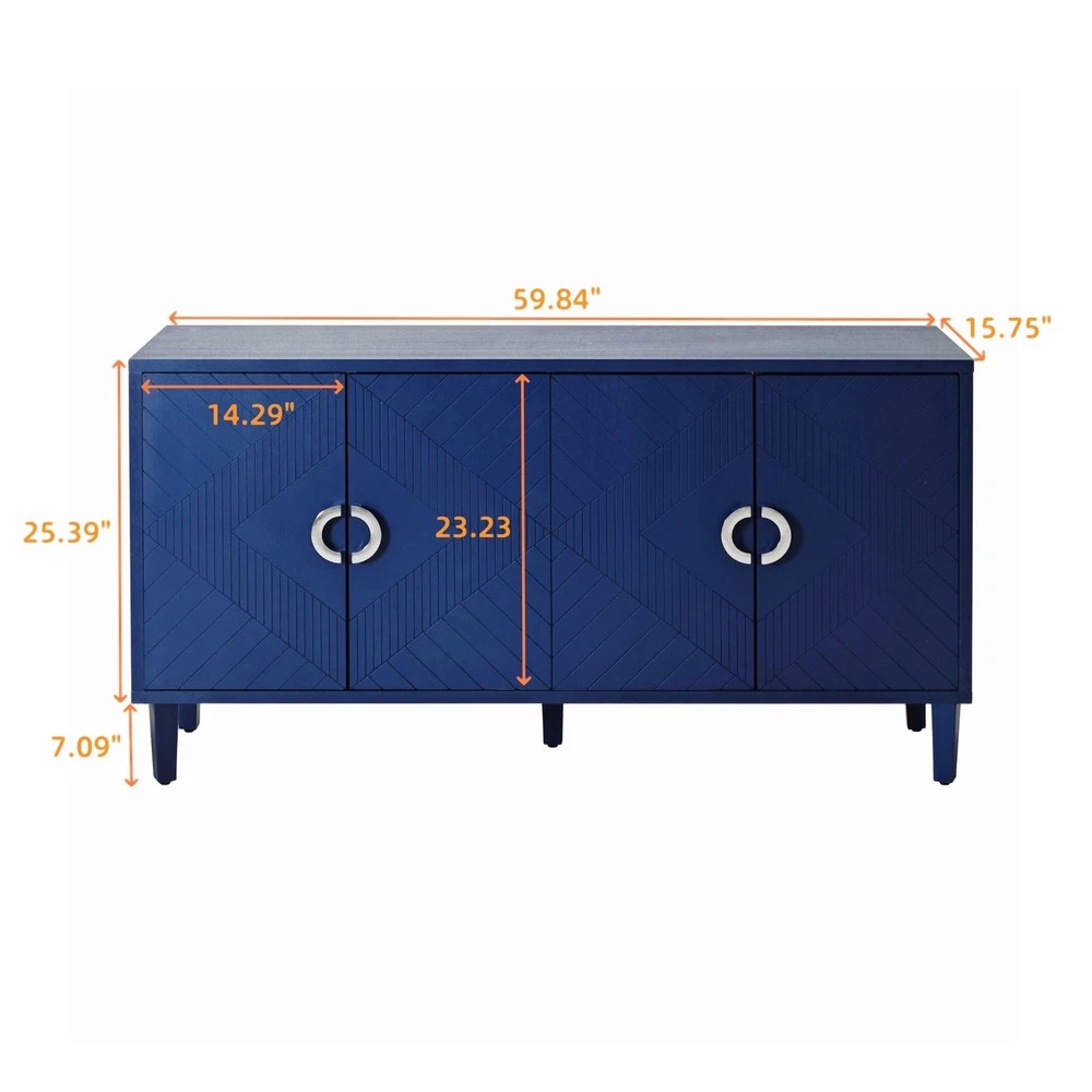 Product Features Durable Construction: Made of high quality MDF with solid wood veneer and pine legs, this cabinet is sturdy and durable, providing long-lasting use for all your storage needs. Contemporary & Concise Style: The 4 doors are accentuated by sculpted lines and zinc alloy semi-circular pulls. The champagne color scheme giving it a minimalist and stylish appearance that is perfect for your personal taste and interior decoration, perfectly matching most home decor. Versatile Use: Whether you need to store clothes, files, tools, or other items, this storage cabinet can accommodate them all, making it a versatile solution for all your storage needs. Reasonable Load-bearing Capacity:In order to meet a variety of requirements in your daily life, the load-bearing capacity setting of this cabinet is reasonable and practical. The load-bearing capacity of the tabletop is 80 pounds. In that case, you can put most of daily sundries on the tabletop without worried about the load-bearing issues. The load-bearing capacity of the cabinet layer board is 60 pounds. Description Notice 1. Due to the material the color of the product will be slightly different in different light. 2. Due to lighting or monitor display, the color of the real product may be slightly different from the image. 3. Manual measurement has been used, and there may be some reasonable errors. Specifications Color champagne/Navy Blue Material MDF with solid wood veneer+ pine legs Product Dimension 59.84"L x 15.75"W x 32.48"H Weight Capacity Tabletop: 80lbs Shelf: 60lbs Assembly Required Yes Package Number 1