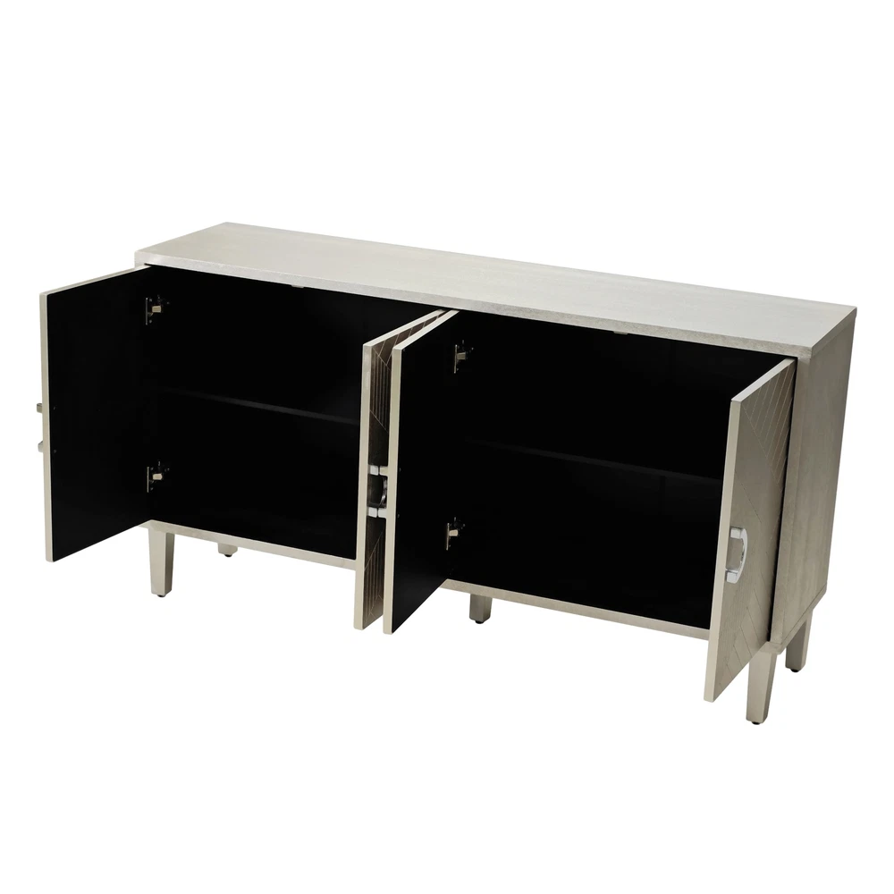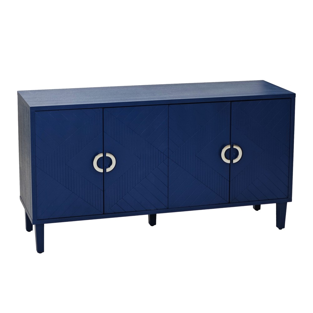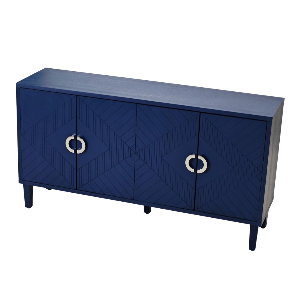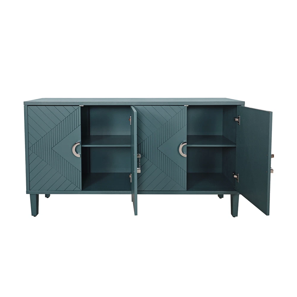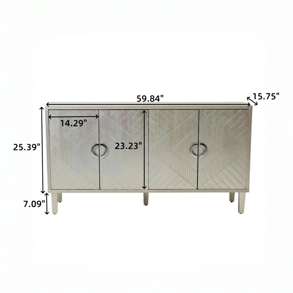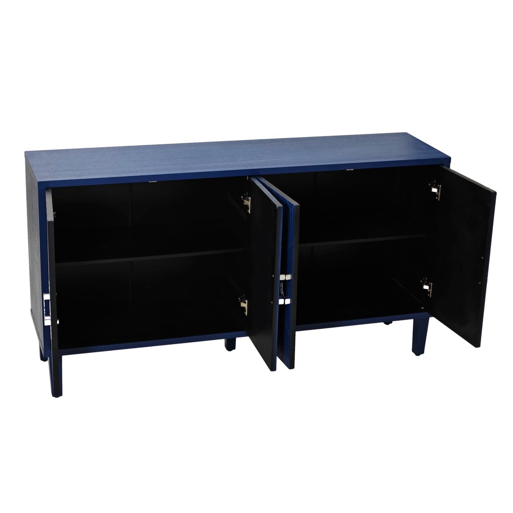 Product Features Durable Construction: Made of high quality MDF with solid wood veneer and pine legs, this cabinet is sturdy and durable, providing long-lasting use for all your storage needs. Contemporary & Concise Style: The 4 doors are accentuated by sculpted lines and zinc alloy semi-circular pulls. The champagne color scheme giving it a minimalist and stylish appearance that is perfect for your personal taste and interior decoration, perfectly matching most home decor. Versatile Use: Whether you need to store clothes, files, tools, or other items, this storage cabinet can accommodate them all, making it a versatile solution for all your storage needs. Reasonable Load-bearing Capacity:In order to meet a variety of requirements in your daily life, the load-bearing capacity setting of this cabinet is reasonable and practical. The load-bearing capacity of the tabletop is 80 pounds. In that case, you can put most of daily sundries on the tabletop without worried about the load-bearing issues. The load-bearing capacity of the cabinet layer board is 60 pounds. Description Notice 1. Due to the material the color of the product will be slightly different in different light. 2. Due to lighting or monitor display, the color of the real product may be slightly different from the image. 3. Manual measurement has been used, and there may be some reasonable errors. Specifications Color champagne/Navy Blue Material MDF with solid wood veneer+ pine legs Product Dimension 59.84"L x 15.75"W x 32.48"H Weight Capacity Tabletop: 80lbs Shelf: 60lbs Assembly Required Yes Package Number 1