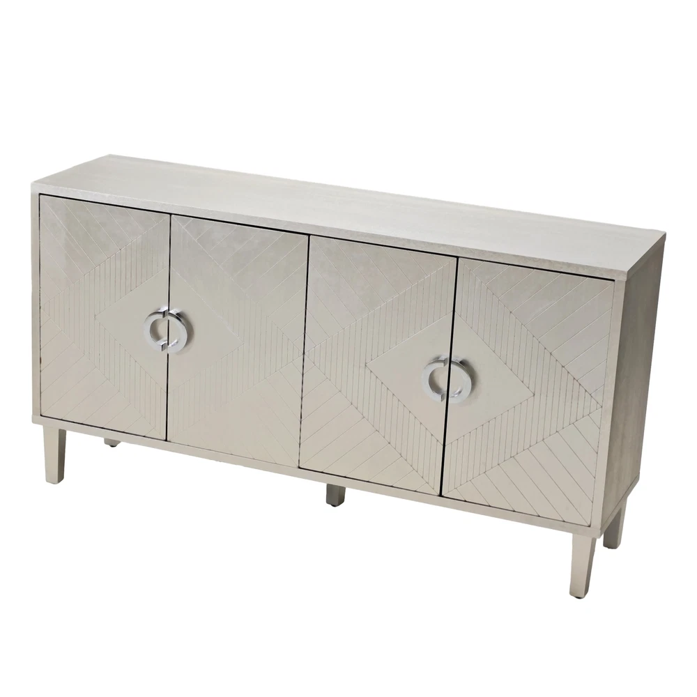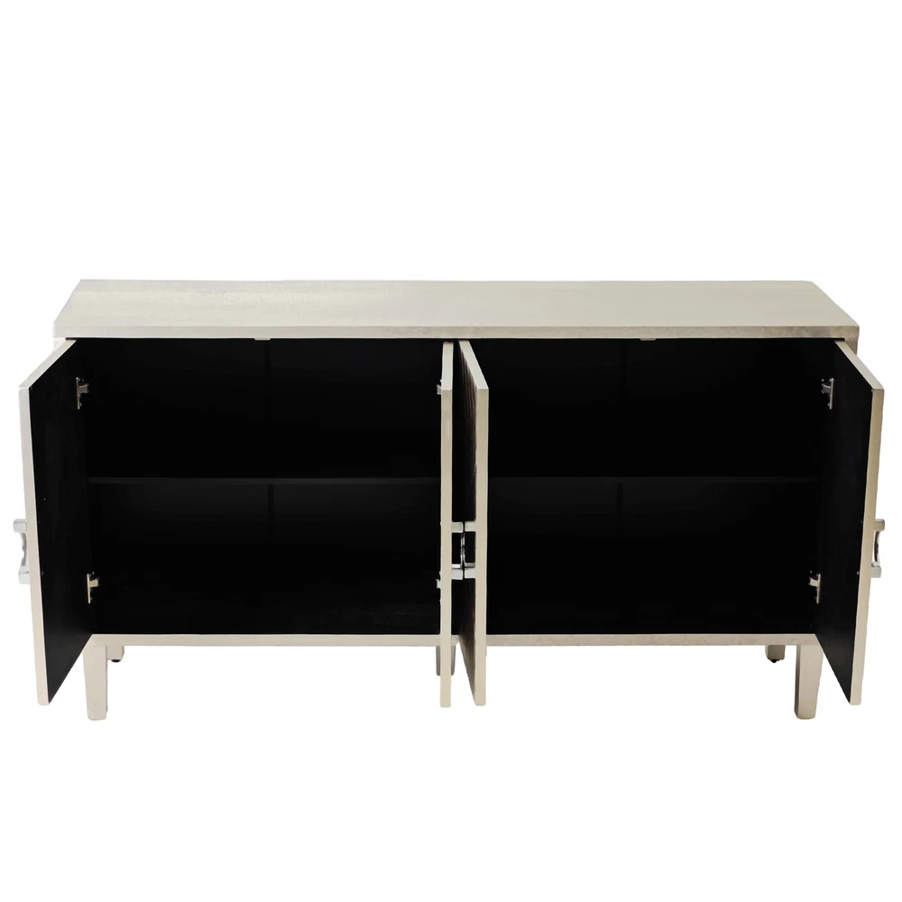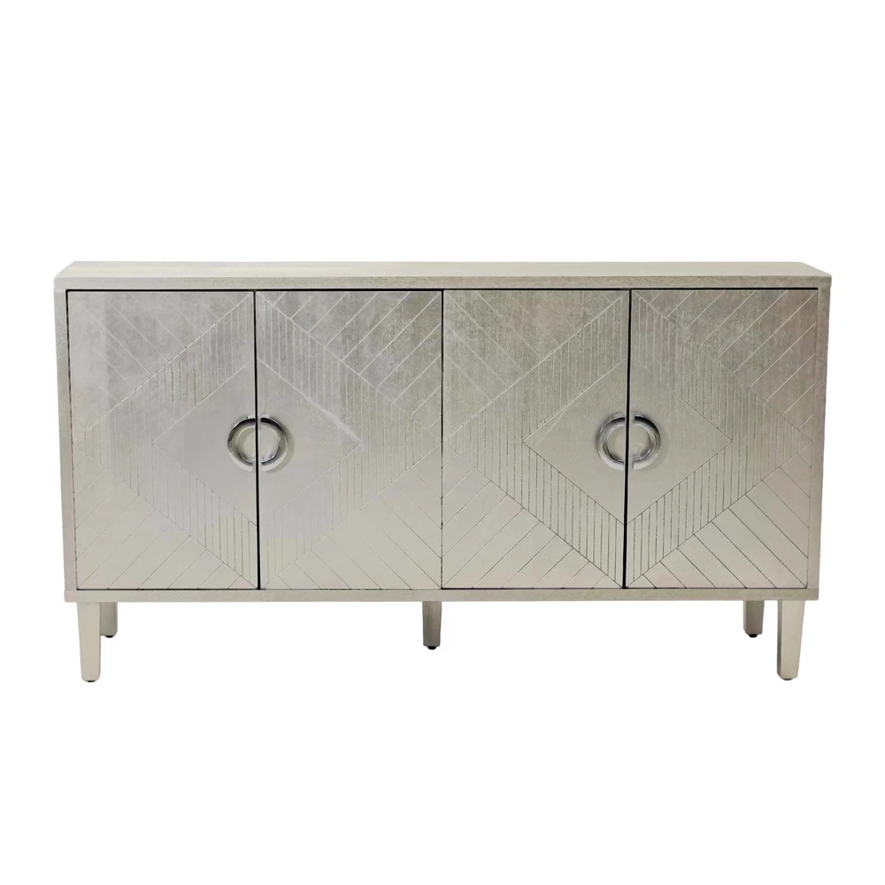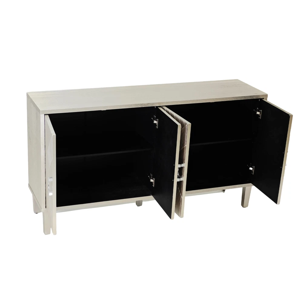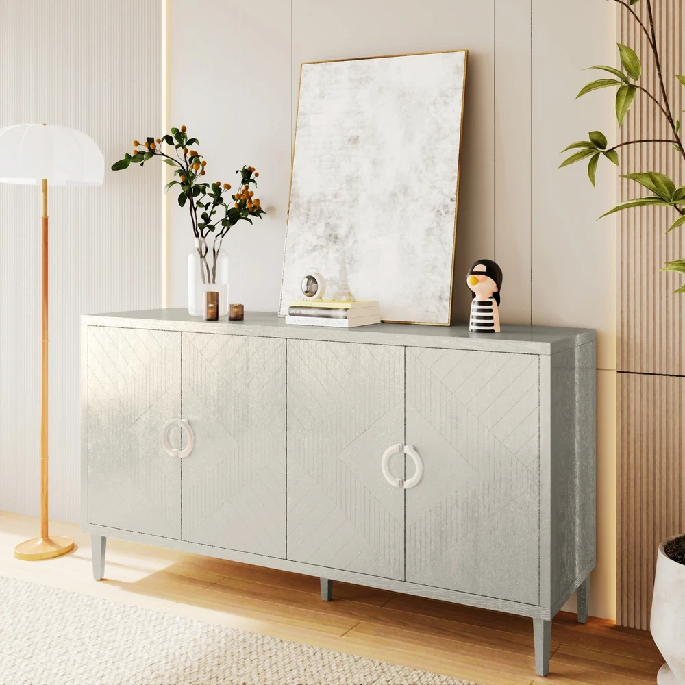 Product Features Durable Construction: Made of high quality MDF with solid wood veneer and pine legs, this cabinet is sturdy and durable, providing long-lasting use for all your storage needs. Contemporary & Concise Style: The 4 doors are accentuated by sculpted lines and zinc alloy semi-circular pulls. The champagne color scheme giving it a minimalist and stylish appearance that is perfect for your personal taste and interior decoration, perfectly matching most home decor. Versatile Use: Whether you need to store clothes, files, tools, or other items, this storage cabinet can accommodate them all, making it a versatile solution for all your storage needs. Reasonable Load-bearing Capacity:In order to meet a variety of requirements in your daily life, the load-bearing capacity setting of this cabinet is reasonable and practical. The load-bearing capacity of the tabletop is 80 pounds. In that case, you can put most of daily sundries on the tabletop without worried about the load-bearing issues. The load-bearing capacity of the cabinet layer board is 60 pounds. Description Notice 1. Due to the material the color of the product will be slightly different in different light. 2. Due to lighting or monitor display, the color of the real product may be slightly different from the image. 3. Manual measurement has been used, and there may be some reasonable errors. Specifications Color champagne/Navy Blue Material MDF with solid wood veneer+ pine legs Product Dimension 59.84"L x 15.75"W x 32.48"H Weight Capacity Tabletop: 80lbs Shelf: 60lbs Assembly Required Yes Package Number 1