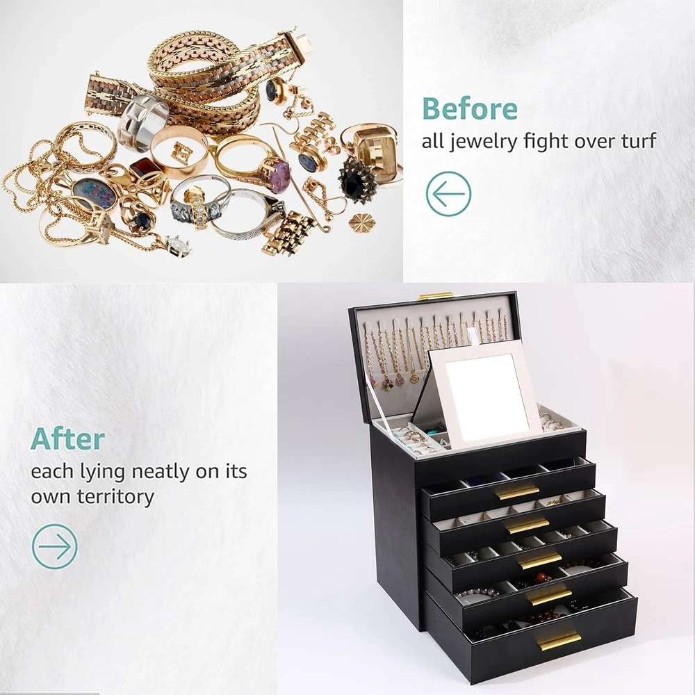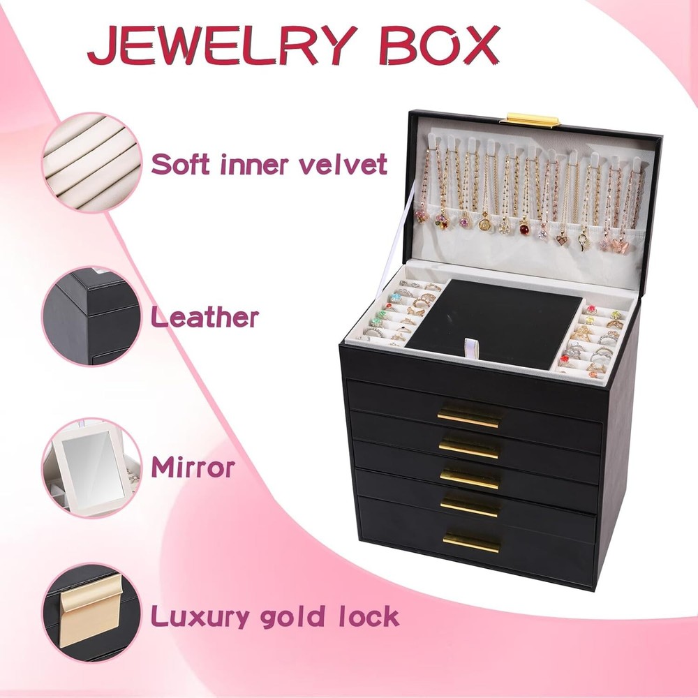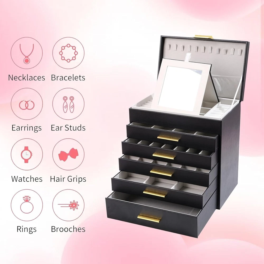 Stylish 6-Layer Jewelry Organizer with Mirror - Convenient and Lockable Design ‹ › ‹ › ‹ › ‹ › ‹ › ‹ › ‹ › ‹ › ‹ › Stylish 6-Layer Jewelry Organizer with Mirror Convenient and Lockable Design Organize Your Jewelry in Style Large jewelry box featuring 6 layers and multiple compartments. Ample storage space for earrings, rings, sunglasses, and necklaces. Say goodbye to tangled messes and misplaced items. Convenient Mirror and Lockable Design Includes built-in mirror for easy accessorizing on the go. Lockable design ensures the security of your valuables. Provides peace of mind whether at home or traveling. Elegant and Sturdy Construction First drawer with 24 earring slots for organized storage. Second drawer designed with 6 grids for bracelets, bangles and cuffs. Third drawer with four long grids, ideal for sunglasses, lipsticks, and watches. Bottom drawer offers substantial space for larger items, including cosmetics. Versatile and Practical Gift Option Perfect gift for loved ones celebrating birthdays, anniversaries, or special occasions. Combination of functionality and aesthetics appreciated by all jewelry enthusiasts. Satisfaction Guaranteed At our brand, customer satisfaction is a priority. The jewelry box meets the high expectations of jewelry enthusiasts with various sized grids and compartments, serving as a versatile storage solution. Give your jewelry a stylish home while keeping it organized and secure. Order your Stylish 6-Layer Jewelry Organizer today and transform your accessorizing experience! Shipping Free & Fast Shipping - We offer free shipping to most of the USA with a normal delivery time of 3-7 days. However, due to the current situation, additional delivery time (up to 3 weeks) may be required for some items. Alternative Carriers - We may use alternative carriers (e.g. USPS, FedEx, UPS, etc.) to ensure your package arrives safely and on time. Due to the use of multiple carriers, we are unable to provide a tracking number automatically. Handling Time - Orders are processed and shipped within 1-2 business days of receiving cleared payment. Shipping Restrictions - Shipping to Alaska, Hawaii, Puerto Rico, Guam, and other US territories may incur shipping charges or delivery restrictions. Please contact us before ordering, or your order can be refunded/cancelled. State Restrictions - There may be restrictions based on your state of purchase. For example, certain items may not be shipped to California due to state regulations. Contact for Tracking Updates - If you require tracking updates or have any concerns about the delivery of your order, please feel free to contact us, and we will be happy to assist you. Return Please see our eBay Return Policy. Thank you. Payment We accept all major credit cards, PayPal, and Apple Pay for your convenience. Your payment information is secure and encrypted to ensure a safe and seamless transaction. Please complete your payment within 3 days of purchase to avoid any delays in shipping. Feedback Your feedback is extremely important to us. We strive to provide the best products and customer service possible. If you are satisfied with your purchase, please take a moment to leave us a positive review. If you have any concerns or issues with your order, please contact us before leaving negative feedback. We are committed to resolving any problems and ensuring your satisfaction. Contact Us If you have any questions or concerns, please feel free to reach out to our customer support team. You can contact us through the eBay messaging system. We are available Monday to Friday, 9:00 am to 5:00 pm EST, and we will do our best to respond to your inquiry within 24 hours. Thank you for supporting our small family business! UPC: Not Set Unit Quantity: 1 Items Included: Jewelry Box Suitable For: Bracelet,Earring,Necklace,Bangle,Watch Theme: Jewelry Box Organizer Material: Faux Leather,Engineered Wood Features: Mirror,Lockable,Jewelry Organizer,Adjustable Brand: Unbranded Type: Jewelry Box Color: Black Lining Material: None Department: Women Shape: Rectangle Country/Region of Manufacture: Not Set Capacity: More Than 25 Pieces Item Depth: 10 in Item Length: Not Set Item Width: Not Set MPN: Not Set Unit Type: lb Vintage: Not Set Personalize: Not Set Handmade: Not Set Customized: Not Set