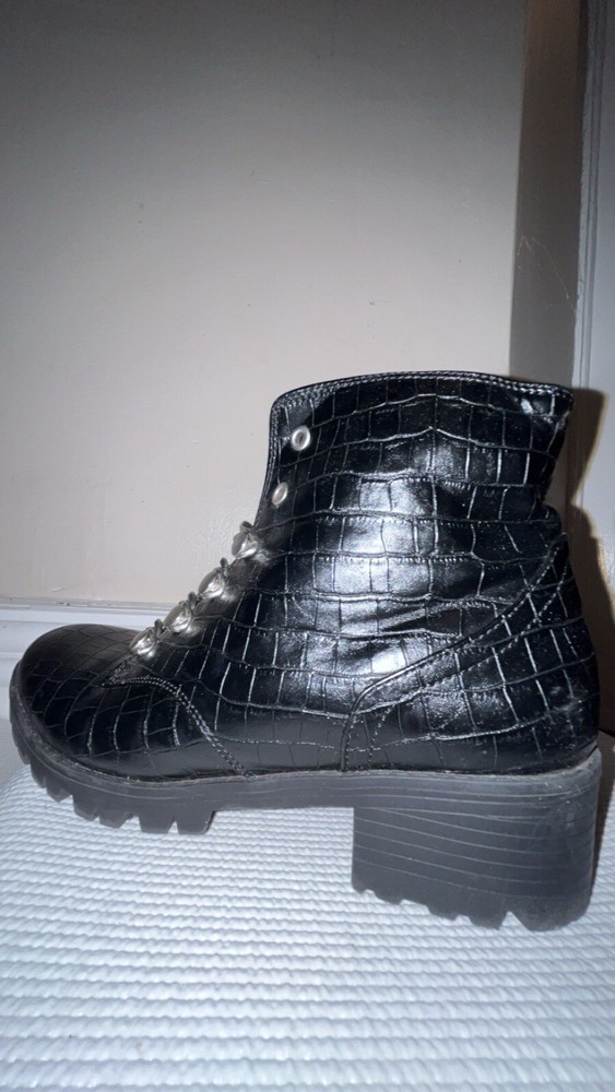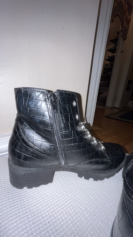 Elevate your shoe game with these stunning black ankle boots featuring silver chains and faux alligator leather. With embossed accents, these boots are the perfect addition to any wardrobe. The zip closure and block heel style make them comfortable and easy to wear for any occasion, whether it's a casual day out or a fancy event. The faux leather upper material and synthetic lining material provide durability and comfort. Don't miss out on the chance to add these stylish boots to your collection.