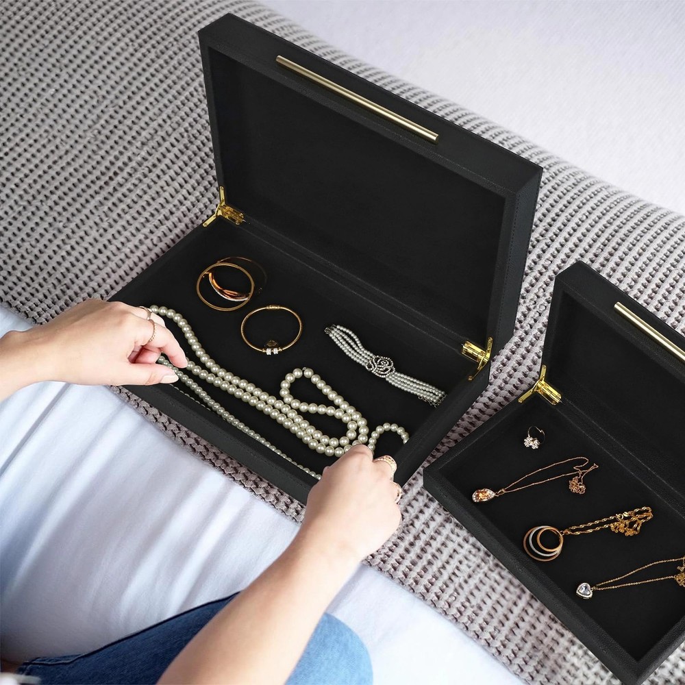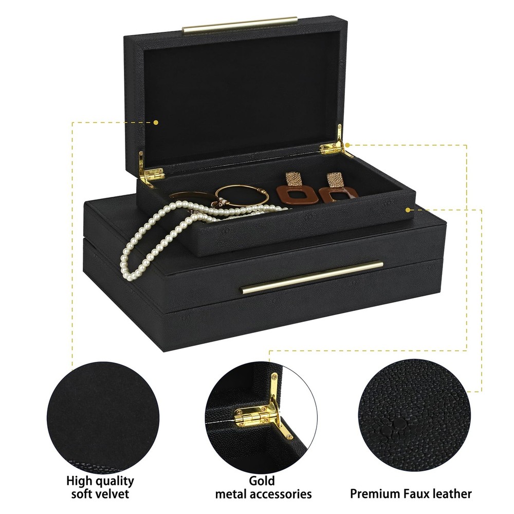 1. Love these nesting boxes—sleek faux leather with a sturdy wooden frame makes them both stylish and durable. Perfect for organizing jewelry, trinkets, or keepsakes, and the hinged lid keeps everything secure. The compartments help keep things tidy, and the neutral design fits any decor. Great value for a set of two!
