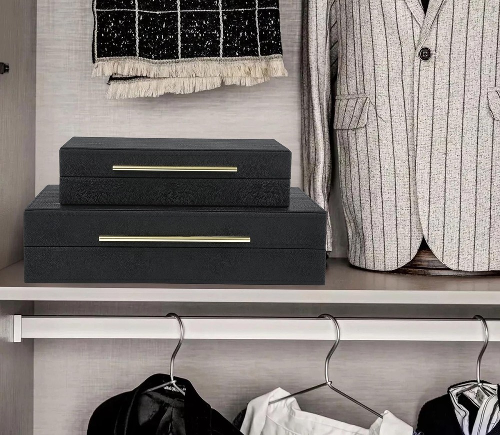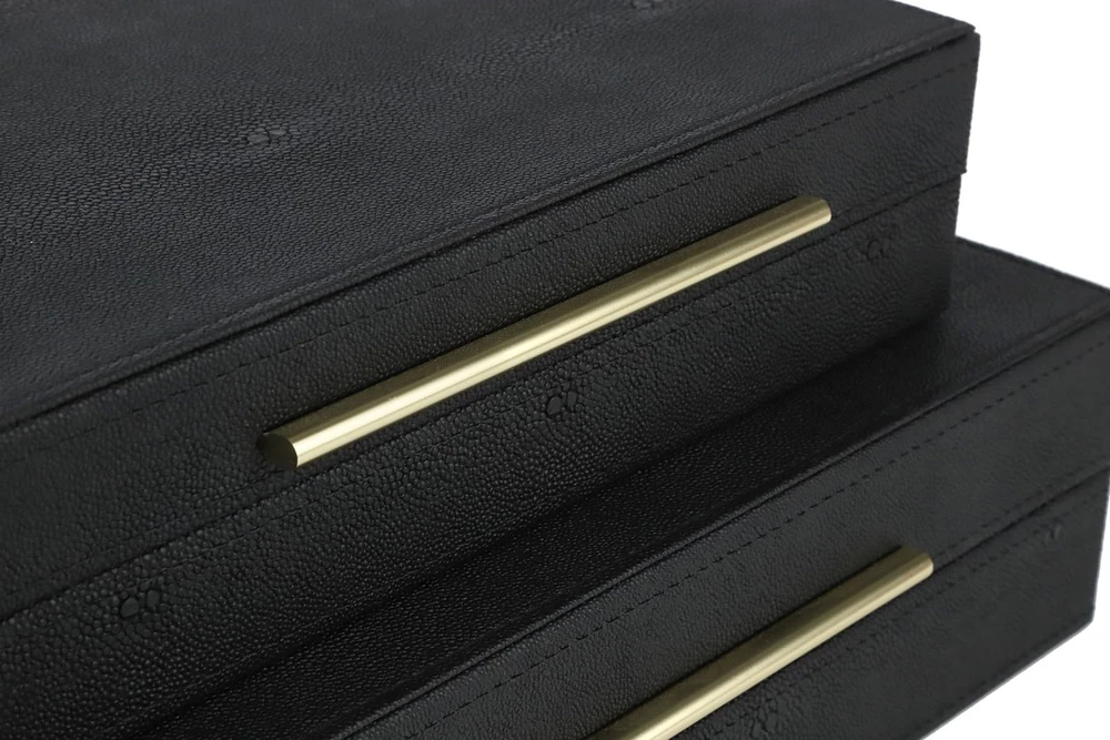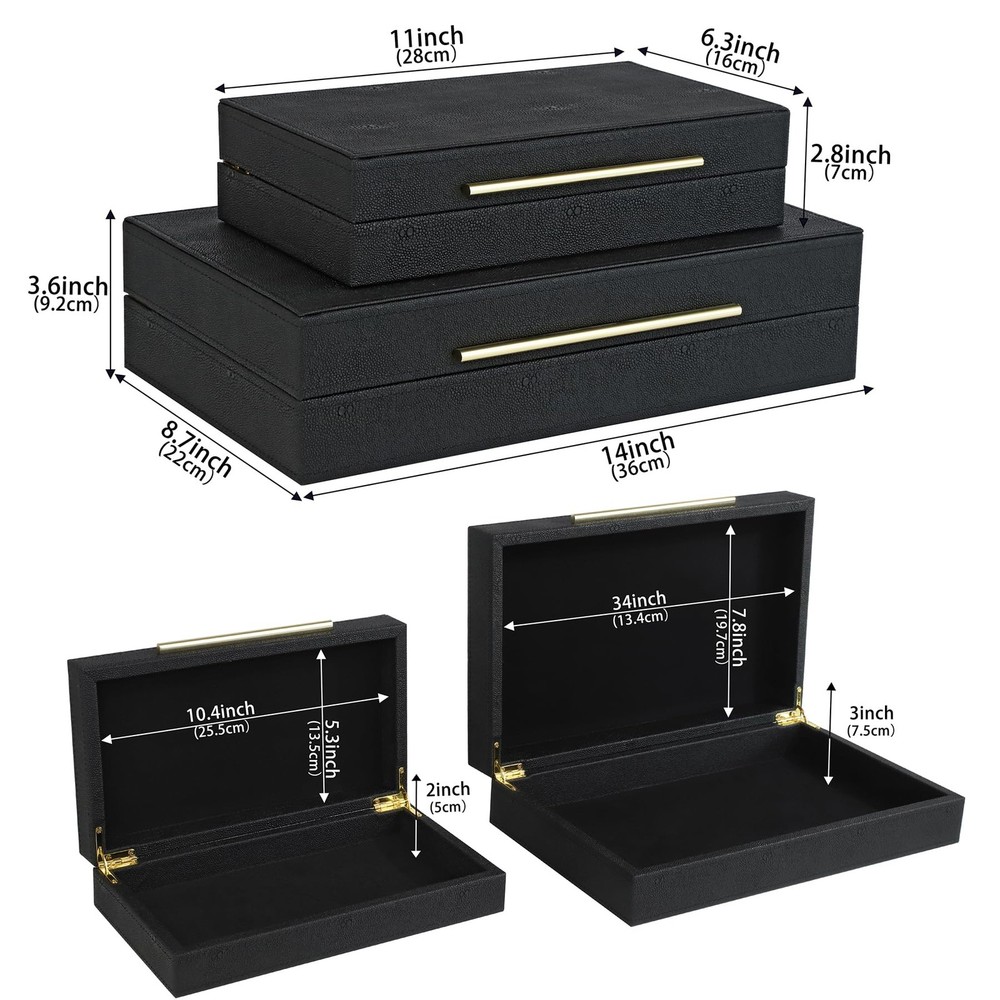Introducing the Large Wooden Structure Keepsake Box - the perfect accessory organizer for your home or office! This decorative box features a sleek and modern design, made from high-quality faux leather with a sturdy wooden structure. The hinged lid provides easy access to your belongings, while the interior is spacious and organized with multiple compartments and dividers. Whether you're looking for a jewelry organizer, a storage box for small items, or a keepsake box for precious memories, the Large Wooden Structure Keepsake Box has got you covered. With its versatile design and sturdy construction, it's a must-have accessory for anyone who values style and functionality. Multi-purpose storage: Shagreen Faux Leather Decorative Box with wooden structure can store a wide range of items, making it great for organizing your home or office space. Large Capacity: the dimensions of the decorative storage box are S: 11x6.3x2.8 inches, l: 14.2x8.7x3.6 inches (L x W x H). Timeless design: The antique style storage box with lid boasts a classic and elegant look that will blend in with any decor, making it a stylish keepsake box that complements any environment. Allowing you to organize your items neatly and easily. The hinged lid provides easy access to your belongings while keeping them securely stored. Ample storage space: The large wooden box with hinged lid is spacious enough to store all your necessities, configurations, and personal items, without taking up too much space on your desk or shelf, providing ample space for storing various items such as jewelry, cosmetics, accessories, craft supplies, office supplies, and more. Premium Material: The storage box is made of faux leather, which not only looks elegant but also feels soft and comfortable to the touch. The sturdy wooden structure ensures the long-lasting use of the box while maintaining its functional and decorative purpose. A perfect gift: Surprise your loved ones with this stylish decorative box that is a perfect keepsake box for special moments and occasions, with the recipient cherishing it for years to come.