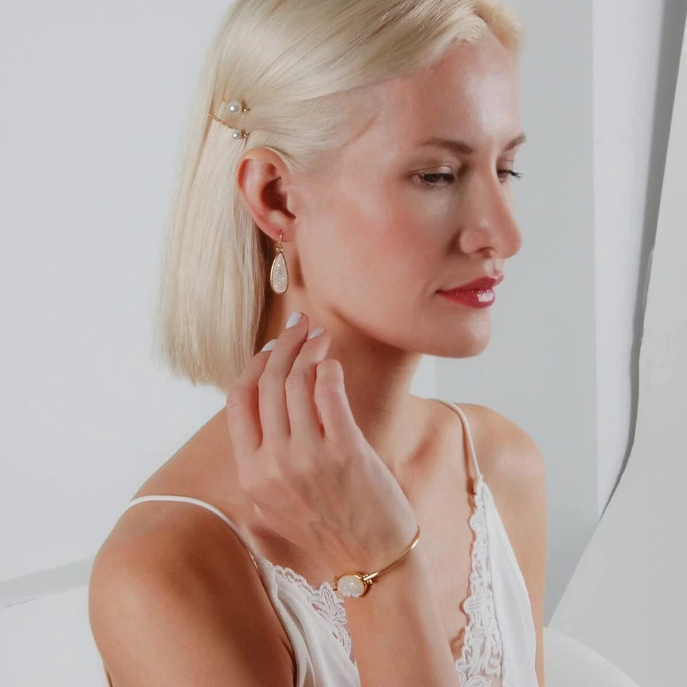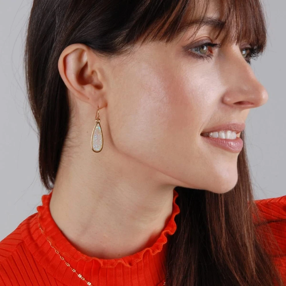 Humble Chic Teardrop Dangle Earrings for Women with Gold - White Created Opal Product Details Brand, Seller, or Collection Name: Humble Chic NY Metal stamp: Not stamped Metal: gold-plated-brass Material: Metal Gem Type: No Gemstone Setting: Bezel Length: 1.5 inches Back finding: French Wire Number of stones: 2 Package Dimensions : 3 x 3 x 0.7 inches Department : womens Manufacturer : Humble Chic NY
