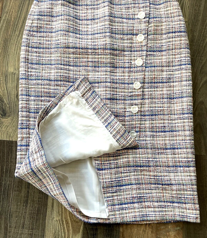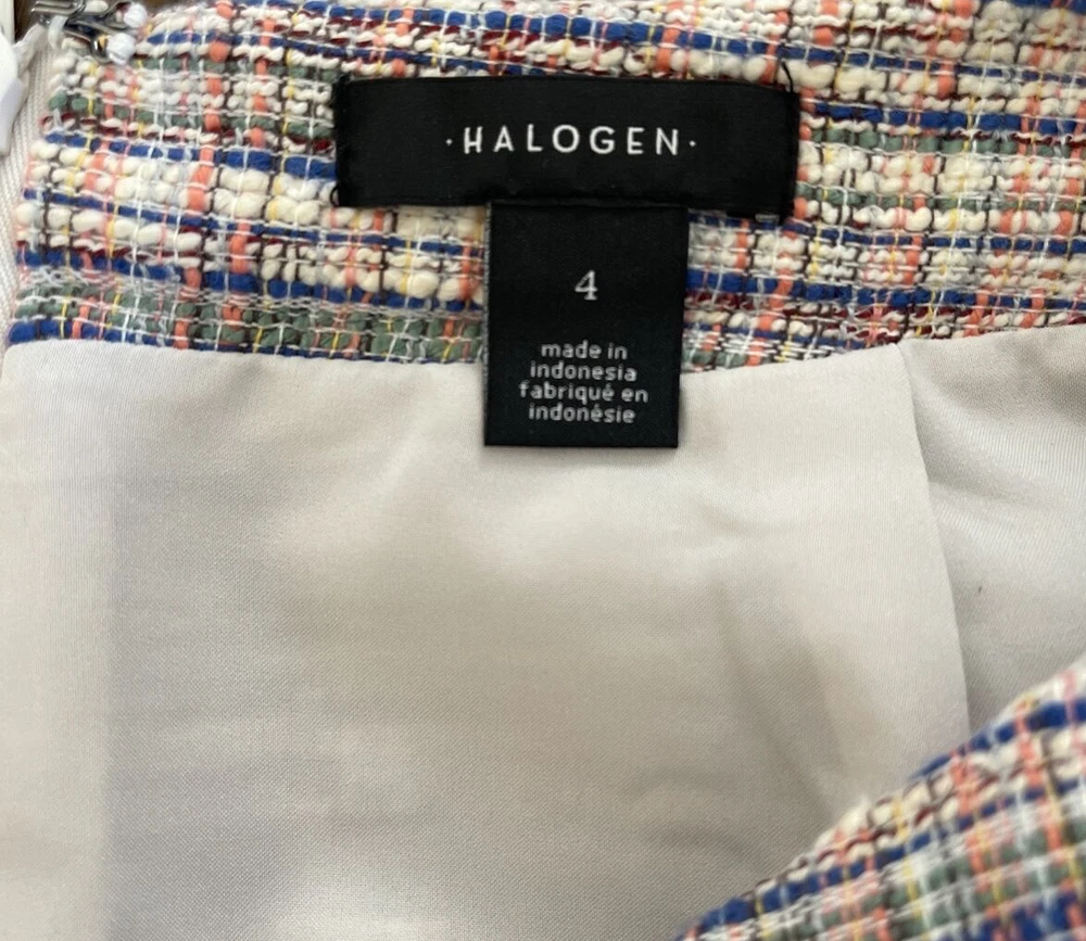 **Ivory Multi Karma Tweed Skirt by Halogen This Halogen pencil skirt is a stylish addition to any wardrobe. The skirt is made of tweed and features a plaid pattern in multicolor. It has a mid-rise waist and a button closure. The knee-length skirt has a straight and pencil style, with a faux wrap design that adds a touch of elegance. Ideal for formal occasions, business meetings, weddings, and parties, the skirt is lined and has a slit for added comfort. The skirt is a size 4 and is perfect for women who like to dress stylishly without compromising on comfort. Made in Indonesia, this skirt is a must-have for any fashion-conscious woman who wants to look and feel her best.