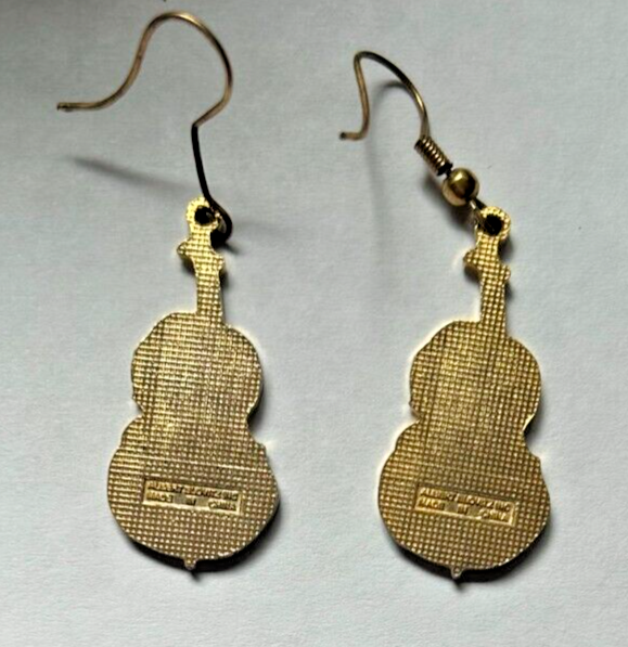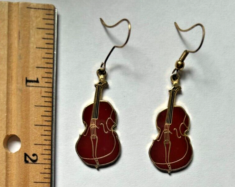Metal fashion earrings musical instrument Cello in good condition.Red-brown with gold. Dangle. Smoke free home.
