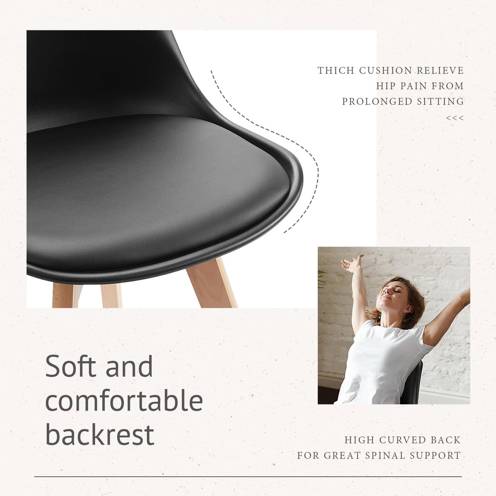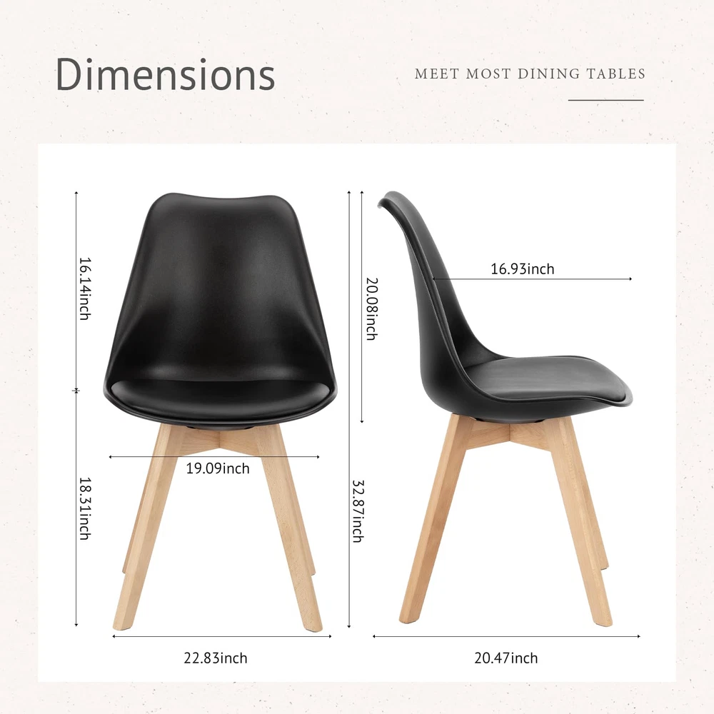 Versatile Usage: Modern style dining chairs with overall size: 22.83"W x 19.09"D x 32.87"H. The dining chairs boast a simple and modern style, suitable for various settings such as family dining, outdoor events, dining rooms, restaurants, hotels, and guest room, kitchen areas Thickened Cushion: The dining chairs are equipped with a new generation of thickened high-density sponge cushions. The high-elastic backrest design offers full back support, and promotes blood circulation for a comfortable, fatigue-free sitting experience Premium Materials: Made of high-grade PU leather, our dining room chairs is wear-resistant, scratch-resistant, waterproof, and easy to maintain. Its skin-friendly and non-irritating properties ensure a healthy dining experience Sturdy Base: Constructed with four-point support, the 2.5 cm diameter chair legs are made of solid wood material which is hard and rot-resistant. The dining chair's maximum weight capacity is 275 pounds, and non-slip pads on the legs protect your floors from scratches Easy to Assemble: The kitchen chairs come with installation instructions and all necessary hardware and tools. We also provide videos to help you get your chairs installed in 10-15 minutes