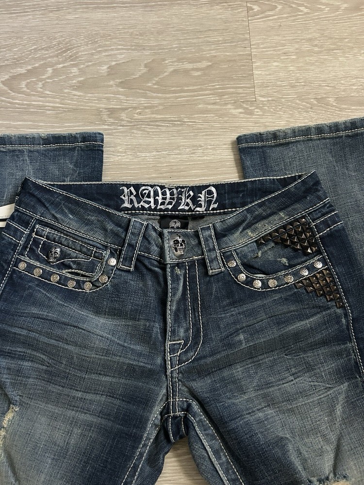 studded rawkn jeans, studs and buttons, and spider design!!! new with tag. unknown brand called rawkn , size 2 / size 26inches in waist. these jeans are seen on pinterest Cybergoth mallgoth affliction emocore draingang haunted mound fairycore fairygoth scene cybergoth gothic streetwear skater punk cyberpunk tattoo tribal baggy jessepinkman distressed × sinister carbon black thermal cyber y2k thermal tapout goth scenecore semetary girly 2000s new brand designer y2k stylish archive keycloset designer