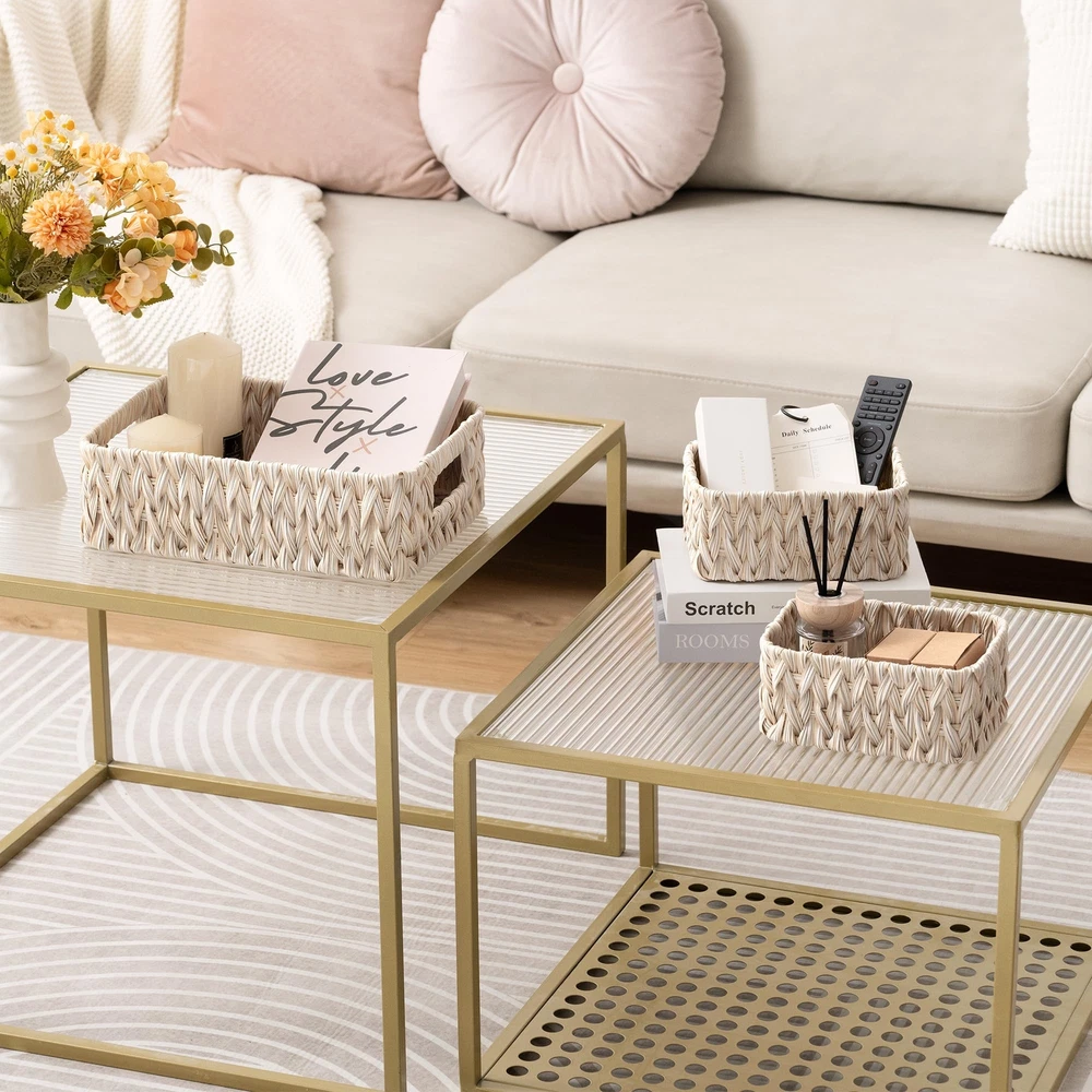 Sturdy Structure:Handwoven with high-quality PP materials on a durable metal frame, this basket combines craftsmanship with durability, making it perfect for your long-term storage needs. Set of 3: These baskets come in a set of 3, with sizes of 13 x 9 x 4 inches and 7¾ x 5¾ x 3½ inches respectively. The varying sizes make them suitable for different home spaces, catering to your diverse storage needs. Basket for Decor: Available in multiple colors, this decorative basket complements various decor styles, making it a perfect addition to any room in your home. Convenient Handles:With convenient side handles for easy portability, this woven basket is the ideal solution for keeping your home neat and tidy. Versatile Storage:With durable construction and dual-sized design, this wicker baskets offers multi-functional storage, perfect for organizing towels, clothes, documents and more in the bathroom, pantry, laundry, living room, bedroom, or office.