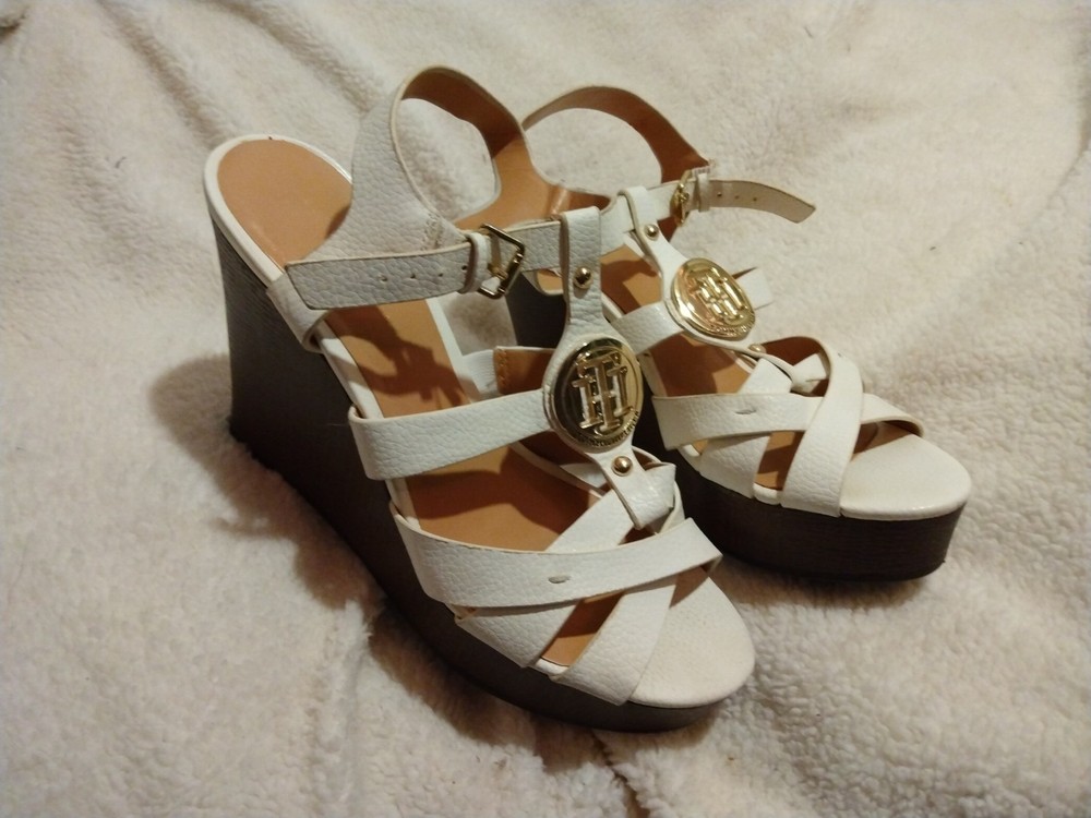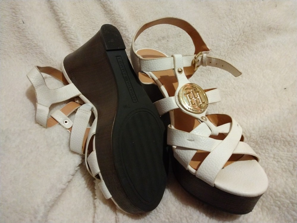 The product is a pair of Tommy Hilfiger women's heels in size 7. These strappy heels are designed in a stylish white color, featuring a faux leather upper material. Perfect for adding a touch of elegance to any outfit, these heels are a versatile choice for various occasions.