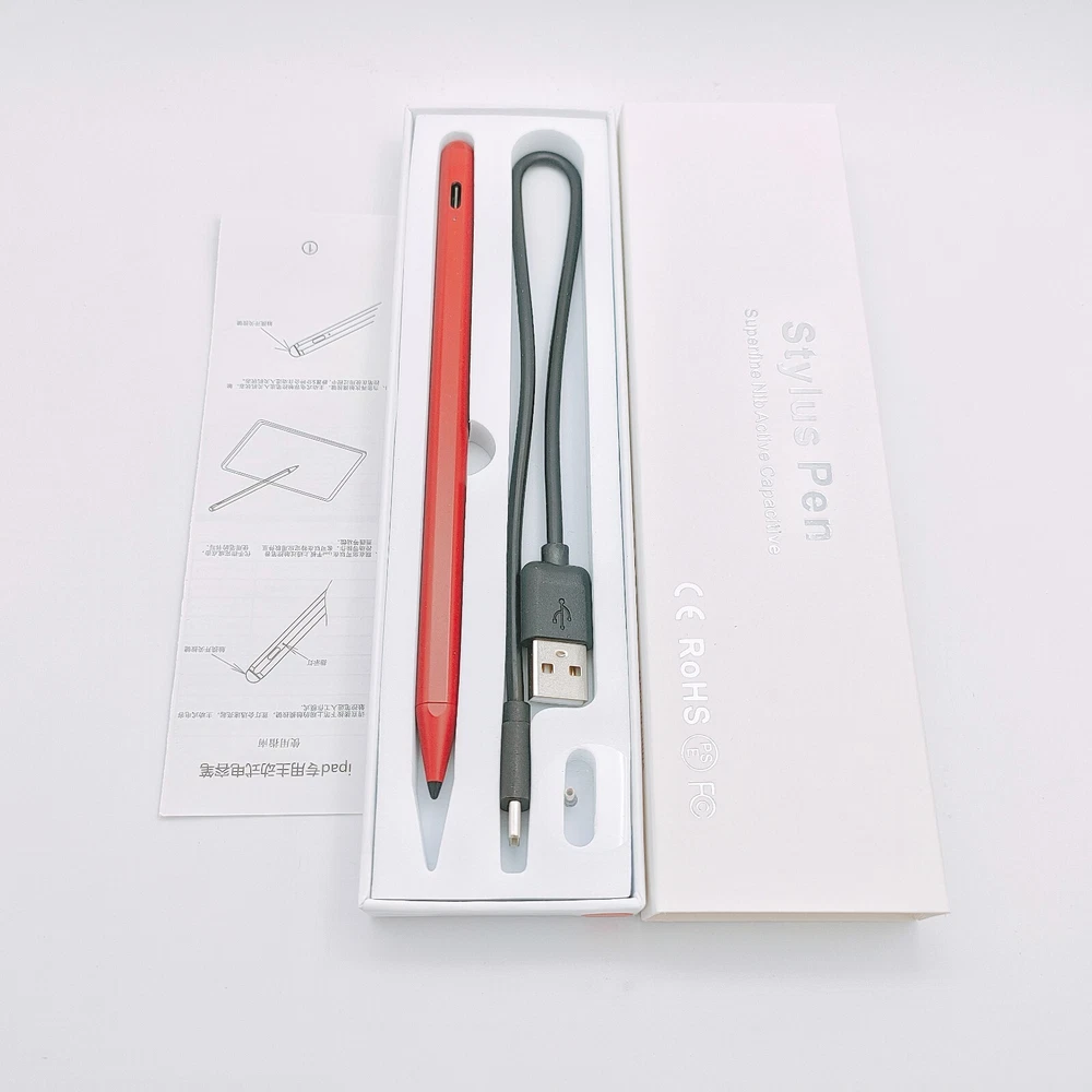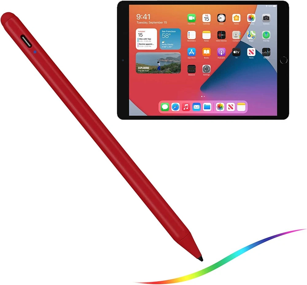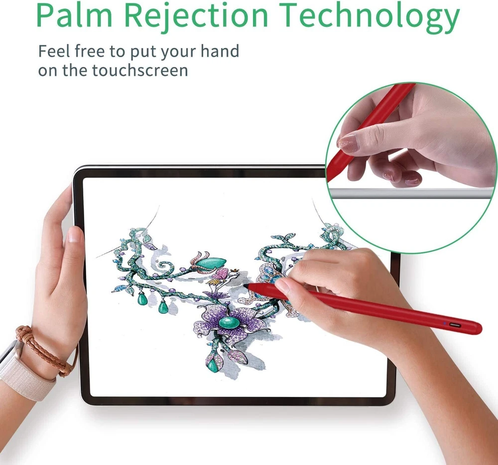 Stylus Pencil with Palm Rejection Active Draw and Write for iPad 2018-2024 Red Compatible models: iPad 6th iPad 7th iPad 8th iPad 9th iPad 10th iPad Mini 5th iPad Mini 6th iPad Air 3rd iPad Air 4th iPad Air 5th iPad Pro 11-inch 1st/2nd/3rd/4th iPad Pro 12.9-inch 3rd/4th/5th/6th Compatible with 2018-2024 iPad & iPad Pro】The stylus supports for iPad series 2018-2023 model: iPad 10th/9th/8th/7th/6th Gen, iPad Air 3rd/4th/5th Gen, iPad Pro 11 inches,iPad Pro12.9 inches 3rd/4th/5th,iPad Mini 5th/6th Gen. Please confirm your devices before you place an order, other model is invalid. 【Not compatible with models before 2018】The stylus doesn't support iPad pro 1st&2nd, iPad pro 10.5", iPad pro 9.7", iPad 1 to 5 Gen, iPad mini 1 to 4 Gen, iPad Air 1st/2nd Gen versions of iPad. Not Compatible With iPhone, Android, Microsoft devices. How to use it: 1)Gently Press the top to turn on the pen, and the indicator light becomes blue; 2) Then you can use the pen to write and draw on your ipad freely. How to charge the pencil: Charge the pencil by the usb charger cable 【Precise and Smooth】1.5mm pen tip can replace your finger to execute finer instructions, it easy to install and tear off the tips on your stylus pen without any tool. No lag/offset/breaking point!Compared with the ordinary stylus pen, it has higher sensitivity, more accurate signal, more comfortable hand. Not easy to break!【 Note 】The stylus pen no pressure-sensitive design. 【Palm Rejection Design】Stylus pen with palm rejection technology provides a natural writing feeling and quick, effortless interaction with your screen, gives you more accuracy and control against the screen. We commend you to use this pen on the iPad with a glass screen protector. 【Easy to Use and Extra Long Standby 】 No need to install Apps, just turn on this active digital pen by simply touching the cap button, it will automatically turn in "Sleep Mode" after idle for 5 minutes to save power. 20 hours continuous working, 90 mins charge, 365 days standby time. The package includes 1* Stylus Pen, 1* Replacement Tips, 1* USB C Charge Cable, 1* User manual.