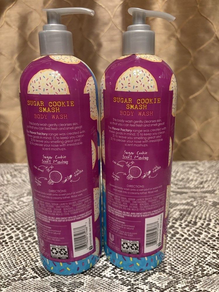 Suave flavor factory sugar cookie smash body wash, 2 large bottles , new Caramel, Brown sugar and rich vanilla ! This is the favorite among fans of the flavor factory This body wash gently cleanses skin, so that you can feel fresh and smell great! You will receive the two bottles pictured all sales final no returns Retail 6.49-9.99