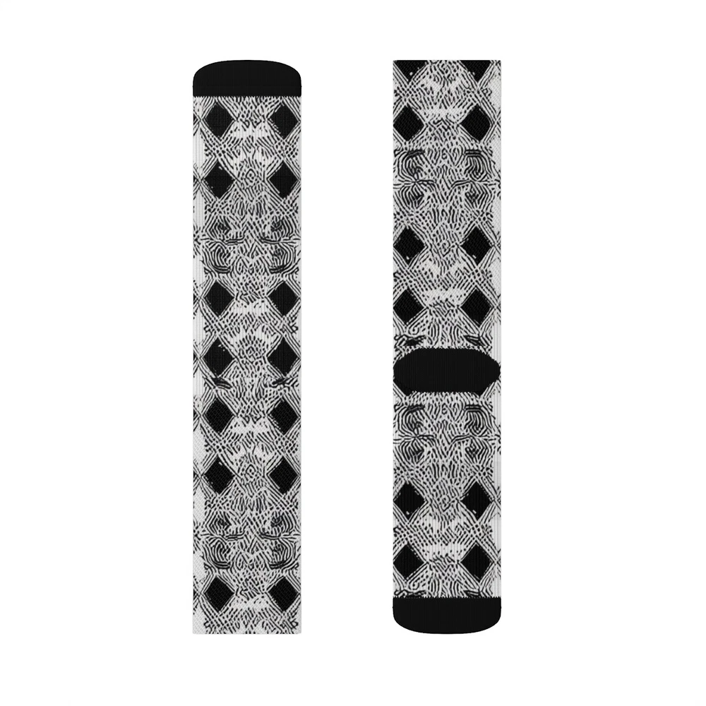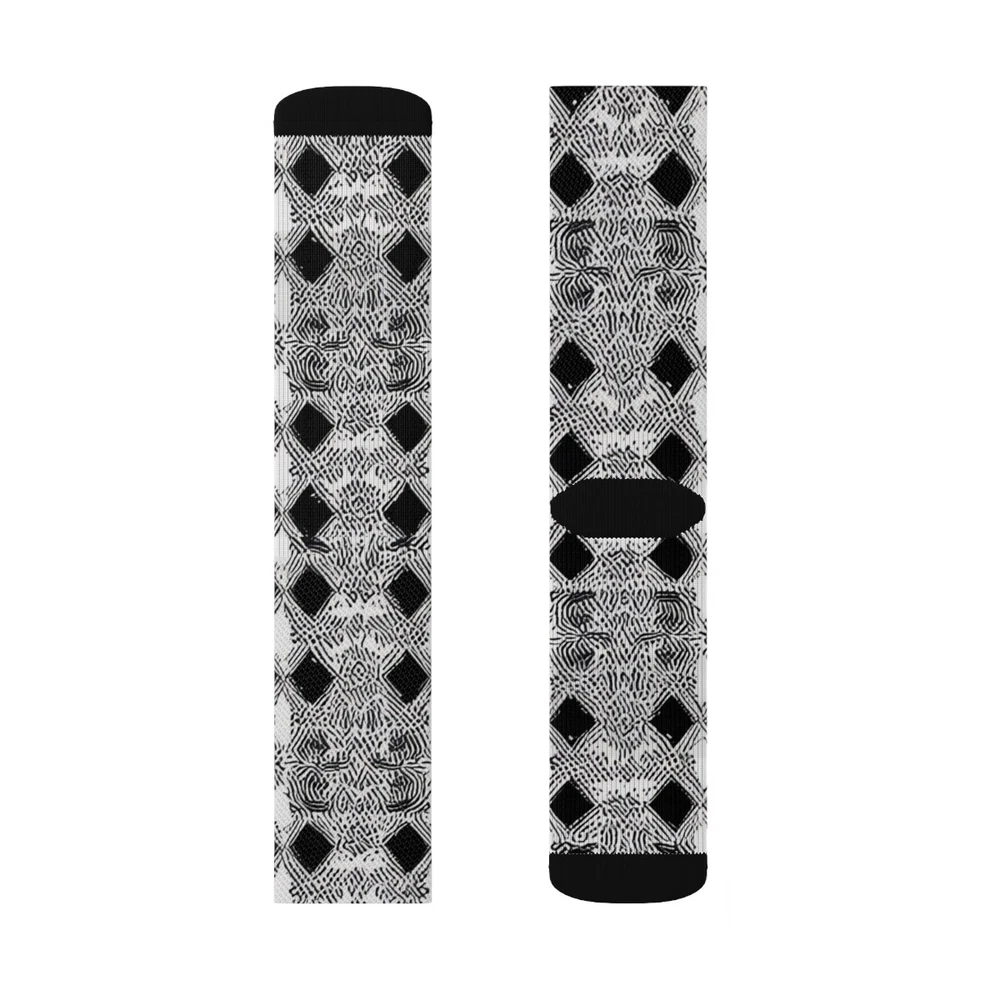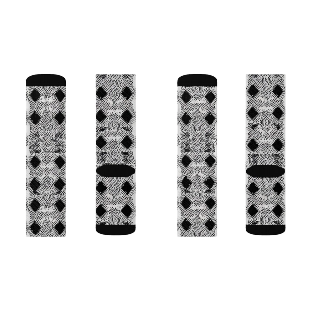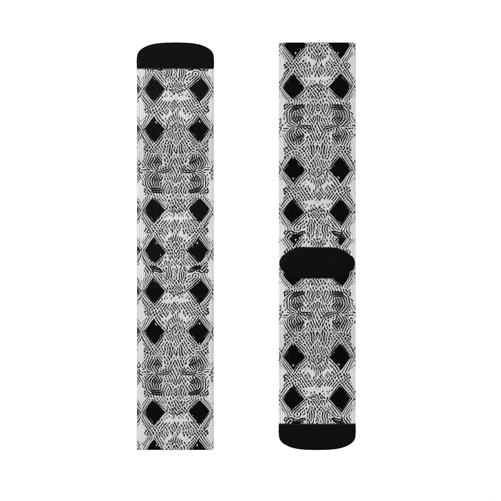 These high-quality socks with sublimated print provide optimum comfort with style wherever one might go - a subtle accent to complement an office look or an eye-catching statement for an extravagant outfit. NB! Dark color prints tend to make the side-seams more noticeable. .: 95% Polyester, 5% Spandex .: 3 different sizes .: Ribbed tube .: Cushioned bottoms .: NB! Printed with flat sublimation method. Color discrepancy can be seen on side seams