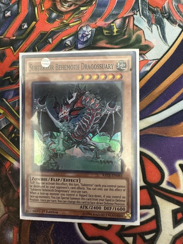 When a face-up monster you control is flipped face-down, if you control no face-up monsters: You can Special Summon this card from your hand in Defense Position. Once per turn: You can change this card to face-down Defense Position.Manufacturer:KonamiAttack/Power:2400Creature/Monster Type:Zombiebrand:KonamiCard Name:Subterror Behemoth DragossuaryCard Number:RATE-EN083Game:Yu-Gi-Oh! TCGFeatures:1st Edition