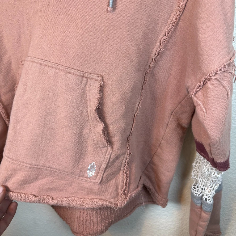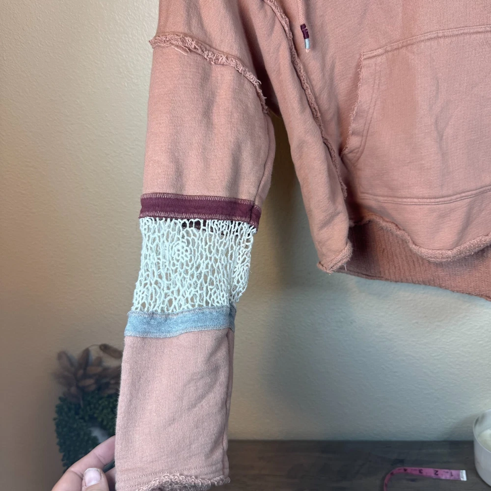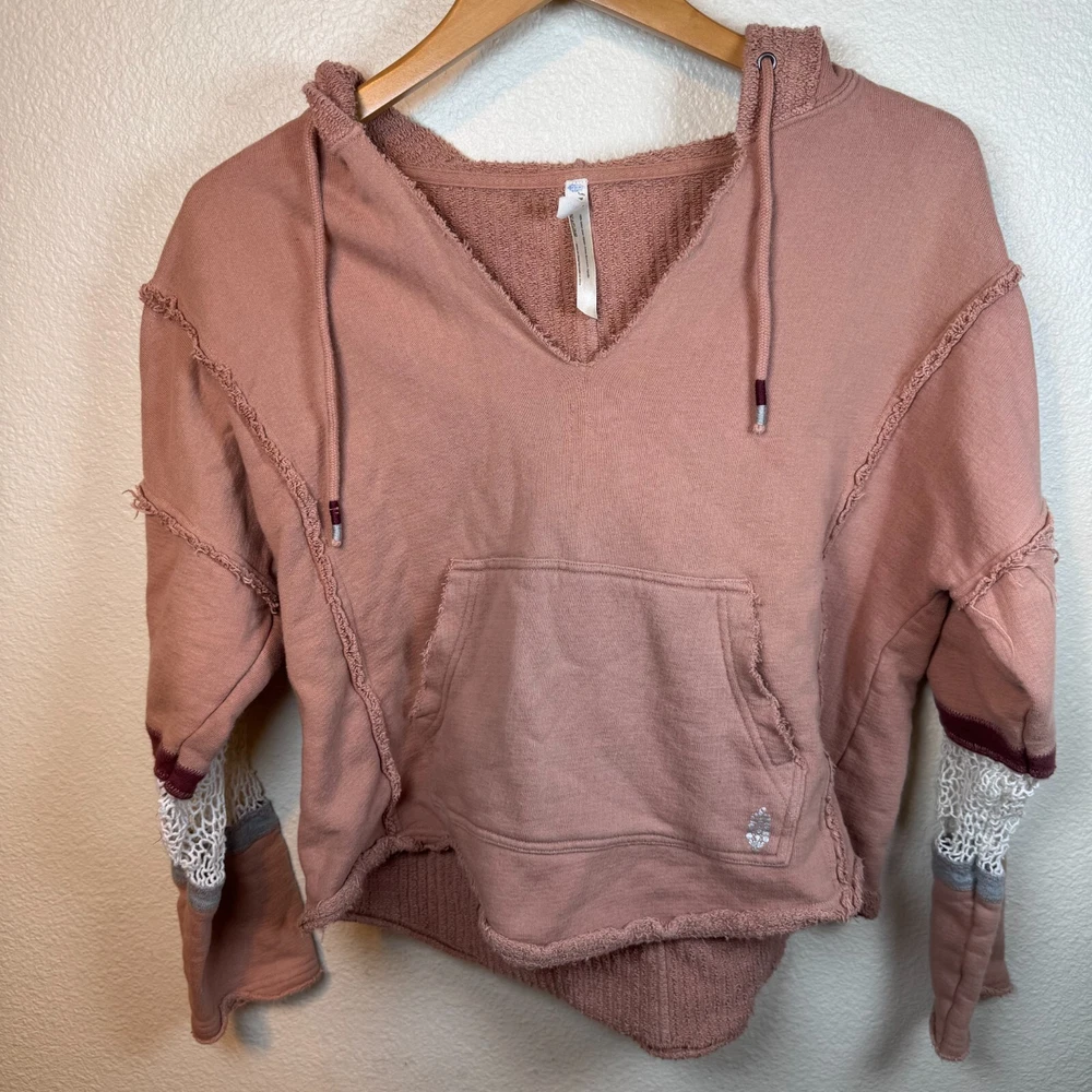 Brand: Free People Movement Size: XS Features: Drawstring Hood Lace crochet detail on sleeves Cropped Length Distressed Look Slightly oversized. Probably could fit a small V-neck cut out detail Condition: Preowned excellent condition. Just a little discoloration on inside of sleeves. See picture. Not noticeable from the outside. Approximate Measurements pictured in the last photo. Please compare these to similiar items you own to ensure proper fit. Preowned items are cleaned to industry standards. They may have smell of detergent/fabric softener All new items may be stored with preowned items that have been washed or have a scent. New items may have a scent of other items/detergent *Items stored in a non smoking environment but pet friendly home