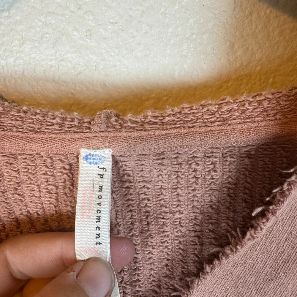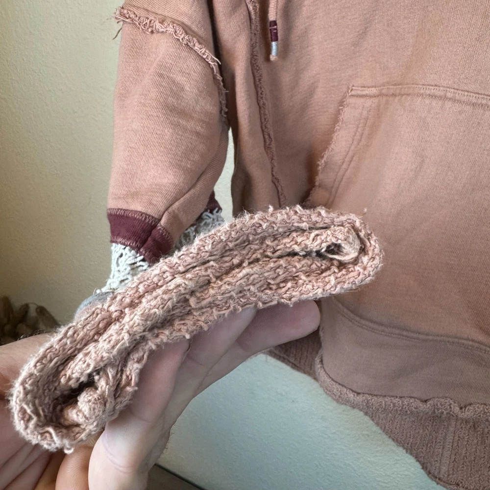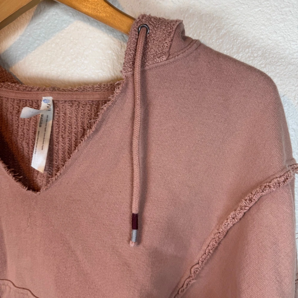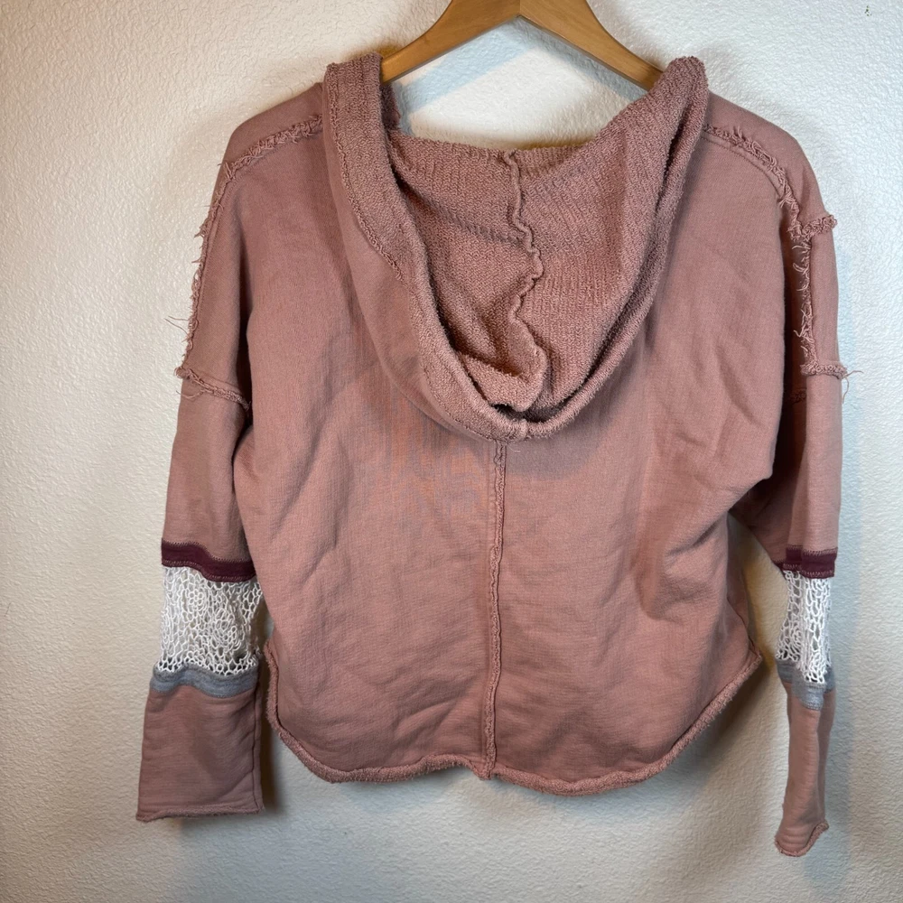 Brand: Free People Movement Size: XS Features: Drawstring Hood Lace crochet detail on sleeves Cropped Length Distressed Look Slightly oversized. Probably could fit a small V-neck cut out detail Condition: Preowned excellent condition. Just a little discoloration on inside of sleeves. See picture. Not noticeable from the outside. Approximate Measurements pictured in the last photo. Please compare these to similiar items you own to ensure proper fit. Preowned items are cleaned to industry standards. They may have smell of detergent/fabric softener All new items may be stored with preowned items that have been washed or have a scent. New items may have a scent of other items/detergent *Items stored in a non smoking environment but pet friendly home
