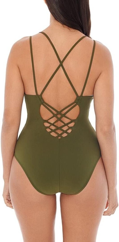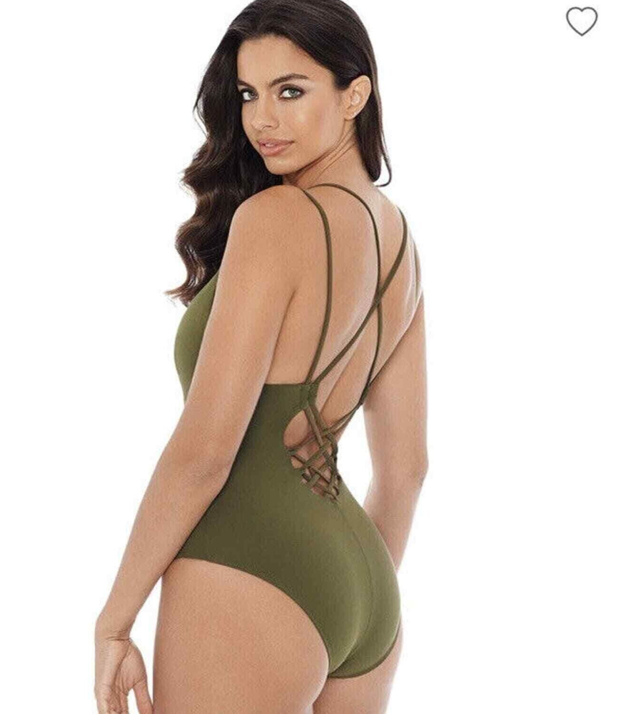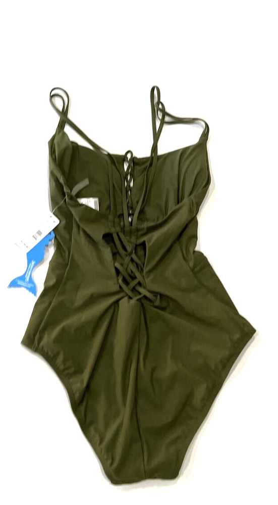 Skinny Dippers Jelly Beans Suga Babe Lace Up One Piece Swimsuit size: XL color: Clover Green Lace up plunge with adjustable front tie, strappy back detail Light shaping and control in all the right places Removable soft cup adds shape and contouring Extra tummy control By Miraclesuit retail $120 K69