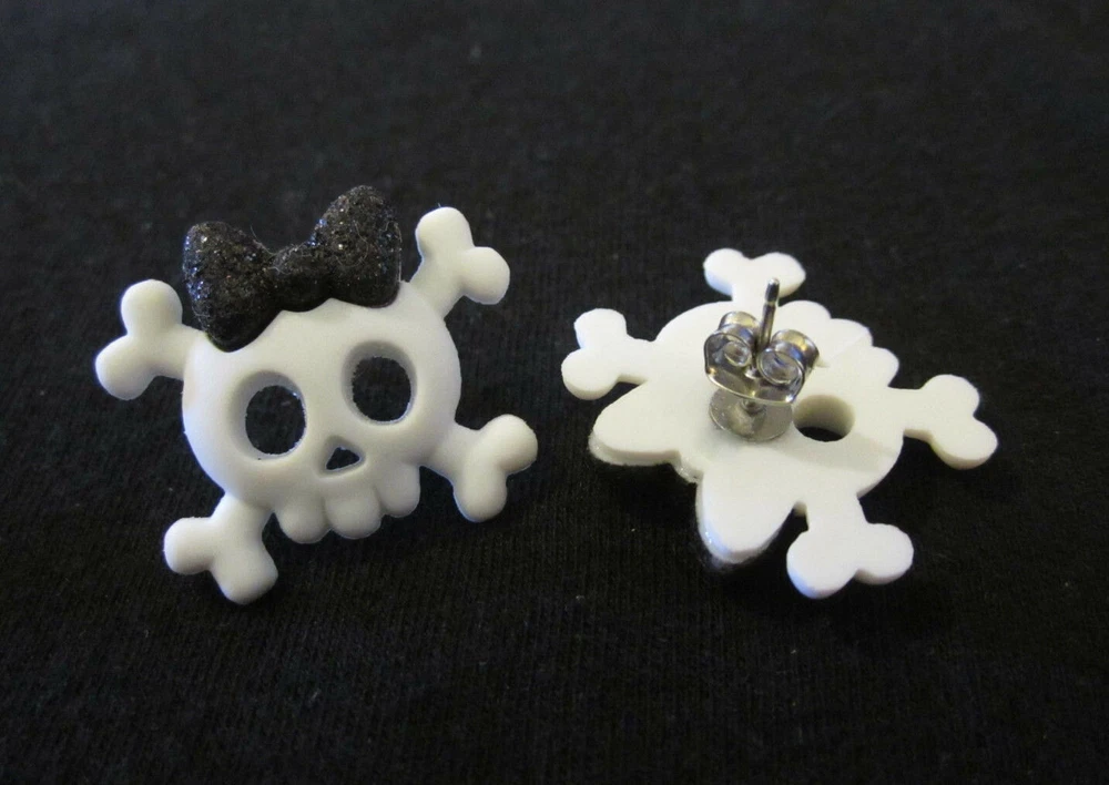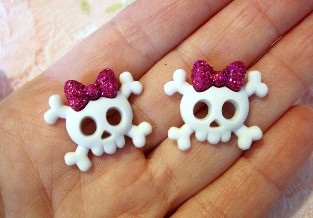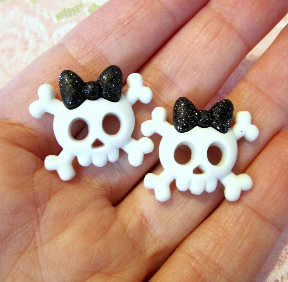 DETAILS ***PLEASE NOTE~these are made upon order so please allow 2-3 days for shipping.*** This listing is for an adorable pair of skull / skullette stud earrings handmade by me! They are white skulls with glitter bows. These earrings are very light weight and measure approx. 7/8 inch long by 7/8 inch wide. I attached them to surgical steel hypoallergenic ear posts with nuts. These earrings are truly gorgeous and handmade with care by me using only the highest quality products!!! FEEDBACK POLICY DUE TO A LARGE NUMBER OF BUYERS THAT NEVER RETURN FEEDBACK...I WILL ONLY GIVE IT AFTER THE BUYER DOES. WHEN THE BUYER RECEIVES THEIR ITEM AND LEAVES ME POSITIVE FEEDBACK, I PROMISE TO RETURN THE FEEDBACK TO THEM. SOMETIMES IT TAKES ME A FEW DAYS BUT I WILL GET IT TO YOU!! IF THE BUYER IS NOT HAPPY WITH SOMETHING I ASK THEM TO PLEASE CONTACT ME BEFORE LEAVING FEEDBACK AND GIVE ME THE FAIR CHANCE TO MAKE THINGS RIGHT!! I HOPE THAT MY BUYERS WILL UNDERSTAND AND I THANK YOU!! QUESTIONS Ask any question that you may have. If you are not happy with this item when you receive it.... please contact us instead of leaving a negative feedback. We are always willing to work anything out. Our customers come first and we want them to be happy. We always promise excellent customer service. A happy customer comes back!! We stand 100% behind our products and 100% guarantee all of them!! PAYMENT DETAILS USA and OUTSIDE USA: We accept PAYPAL payments. We do combine shipping on multiple items IF all items are paid within one payment. PLEASE WAIT FOR COMBINED SHIPPING INVOICE!! If you cannot pay with Paypal immediate, please let us know right away. This will keep us from bothering you with tons of invoices because we will know when to expect your payment!! Items MUST be paid for within 4 days. If not, We will relist the item and file a Non-Paying Bidder complaint. We truly hope that all transactions can be smooth and pleasant!! PLEASE understand that shipping is more than just stamps or postage. We do combine shipping on multiple items IF all items are paid within one payment. PLEASE WAIT FOR COMBINED SHIPPING INVOICE!! I try and ship items out within 24-48 hours after payment is received. I am very careful to package items extremely well which requires alot of high quality packing materials. Please also understand that no matter how fast I ship...the postal service is out of our control. Thank you! FOR RETURNS If you feel that you are not happy with an item, please CONTACT ME before leaving feedback. If the item is broken...I require return and will refund your payment in full when the item gets back to me. If you just dont want the item and choose a REFUND please understand that I cannot issue it until I have the item back in my home and it is in the EXACT shape as when it left. You will need to return the item at your own expense and refunds do not include shipping unless the item is broken or not as described. This is the only way that I can recover some of my costs that I would otherwise lose. THANK YOU!!