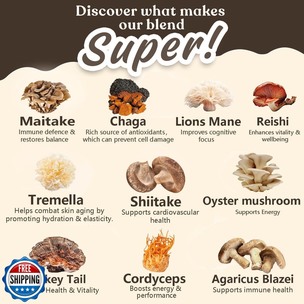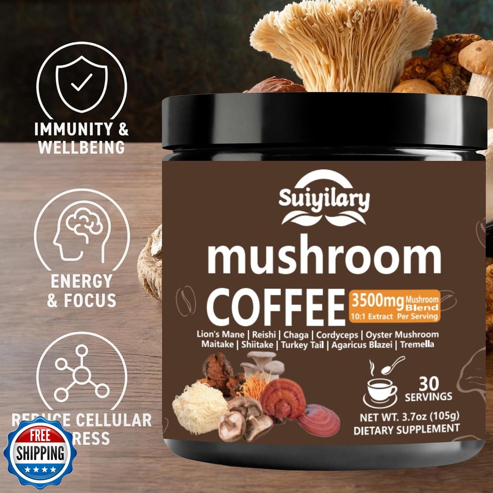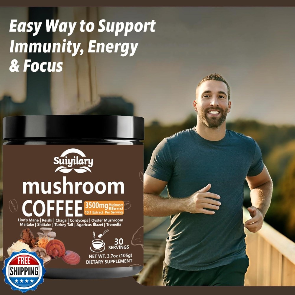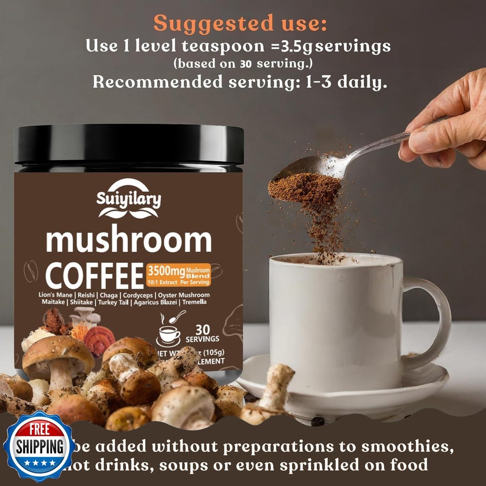 Suiyilary 10 Mushroom Coffee with Arabica w, Lion's Mane, Reishi, Mushroom Polysaccharides and More, 3500mg(10:1) Extract Instant Mushrooms Powder for Focus, Immunity Boost Features Premium Ten Mushroom Powder Blend: Elevate your daily routine with mushroom coffee powder. Our Mushroom Coffee blend is formulated with a 10:1 extract ratio of ten mushrooms: Turkey Tail, Lion’s Mane, Cordyceps, Reishi, Oyster Mushroom, Shiitake, Maitake, Chaga, Tremella, Agaricus blazei. Mushroom Extract Content: Mushroom powder uses a 10:1 concentrated mushroom extract, meaning that 1 gram of extract is derived from 10 grams of raw mushroom. The 350mg of mushroom extract in each scoop is equivalent to 3.5 grams (or 3500mg) of raw mushroom material. This extraction process ensures that you receive a more potent and bioavailable form of the active compounds found in mushrooms. Natural Energy Boost: Swap your traditional coffee for the nourishing benefits of Mushroom Coffee with 10mg of caffeine. This blend provides a smooth, sustained energy lift while reducing jitters and crashes. Offering a healthier, more balanced alternative to your usual coffee routine. Enhanced Brain Function & Memory: Combined with Cordyceps and Reishi, our mushroom supplement complex supports overall cognitive performance, sharpening memory, increasing concentration, and boosting focus. Perfect Mushroom Instant Coffee Experience : Our coffee combines the bold taste of Arabica beans with the powerful benefits of 10 functional mushrooms. Mix 3.5 g into your favorite chocolate drink, smoothie, or morning meal to enjoy a flavorful, nutritious boost any time of day.This mushroom coffee is smooth, and makes you feel like you am drinking something healthier than just a cup of coffee. Mushroom Polysaccharides Benefits: Beta-glucans support digestive health and gut flora balance, enhance immune function, and help boost energy for overall well-being. Mushroom Coffee is finely ground for optimal flavor and nutrition. Enjoy a perfect, low-calorie addition to your daily wellness routine. Shipping Free & Fast Shipping: We offer free shipping to most of the USA with a normal delivery time of 3-7 days. However, due to the current situation, additional delivery time (up to 3 weeks) may be required for some items. Alternative Carriers: We may use alternative carriers (e.g., USPS, FedEx, UPS) to ensure your package arrives safely and on time. Due to the use of multiple carriers, we are unable to provide a tracking number automatically. Handling Time: Orders are processed and shipped within 1-2 business days of receiving cleared payment. Shipping Restrictions: Shipping to Alaska, Hawaii, Puerto Rico, Guam, and other US territories may incur shipping charges or delivery restrictions. Please contact us before ordering, or your order can be refunded/cancelled. State Restrictions: Certain items may not be shipped to California due to state regulations. Contact for Tracking Updates: If you require tracking updates or have any concerns about the delivery of your order, please feel free to contact us, and we will be happy to assist you. Return Policy 30-Day Hassle-Free Returns: If you are not completely satisfied with your purchase, you can return the item for free within 30 days of receiving it for a full refund or exchange. Easy Return Process: Contact us, and we will provide you with a prepaid return shipping label and detailed instructions. No Restocking Fee: There are no restocking fees for returns. However, the buyer is responsible for return shipping costs if the return is not due to a seller"s error. Refund Processing: Refunds will be processed within 1 business day of receiving the returned item in its original condition. Feedback Your feedback is extremely important to us. We strive to provide the best products and customer service possible. If you are satisfied with your purchase, please take a moment to leave us a positive review. If you have any concerns or issues with your order, please contact us before leaving negative feedback. We are committed to resolving any problems and ensuring your satisfaction. Contact Us If you have any questions or concerns, please feel free to reach out to our customer support team. You can contact us through the eBay messaging system. We are available Monday to Friday, 9:00 am to 5:00 pm EST, and we will do our best to respond to your inquiry within 24 hours. Thank you for supporting our small family business!