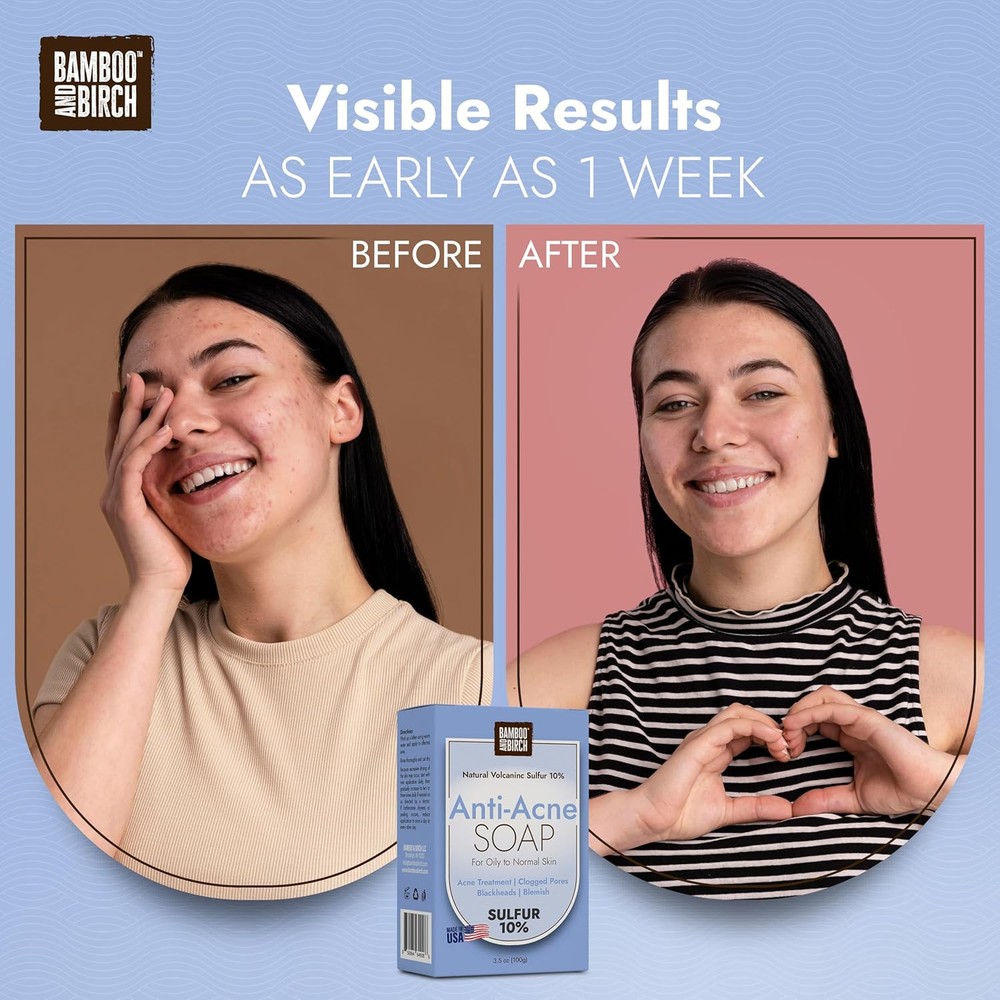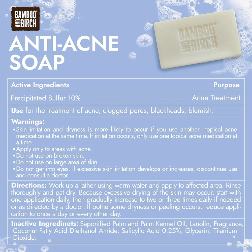 Sulfur Soap Bar, Face and Back Acne Treatment, 3.5 Ounce (Pack of 1) Product Details Package Dimensions : 4 x 3 x 1.5 inches; 0.81 ounces Manufacturer : Bamboo and Birch Brand: BAMBOO AND BIRCH Scent: Fresh Breeze Age Range (Description): Adult Skin Type: All Special Feature: Not Tested On Animals, Natural Ingredients Effective Acne Treatment: Formulated with 10% sulfur, this sulfur soap bar helps reduce breakouts by targeting excess oil and unclogging pores. Experience clearer skin and fewer blemishes with this sulfur soap for acne. Dual Action Formula: Infused with salicylic acid, this acne soap bar gently exfoliates dead skin cells and promotes a smoother, clearer complexion. Say goodbye to rough texture and hello to radiant, healthy skin with this sulfur face wash. Deep Cleansing Power: This sulfur face cleanser provides a thorough cleanse without over-drying, making it ideal for acne-prone skin. Enjoy the confidence of a refreshed, purified complexion with this antifungal soap. Natural Ingredients: Crafted by Bamboo and Birch, this sulfur cleanser uses natural ingredients to refresh and rejuvenate your skin. Trust in a product that combines nature's best with expert formulation when you use this sulphur soap bar. Balanced Skin Care: Achieve a healthy, balanced complexion with a sulfur acne treatment soap that leaves your skin feeling clean, soft, and revitalized. Maintain your skin's natural moisture while effectively addressing acne concerns with this antibacterial bar soap.