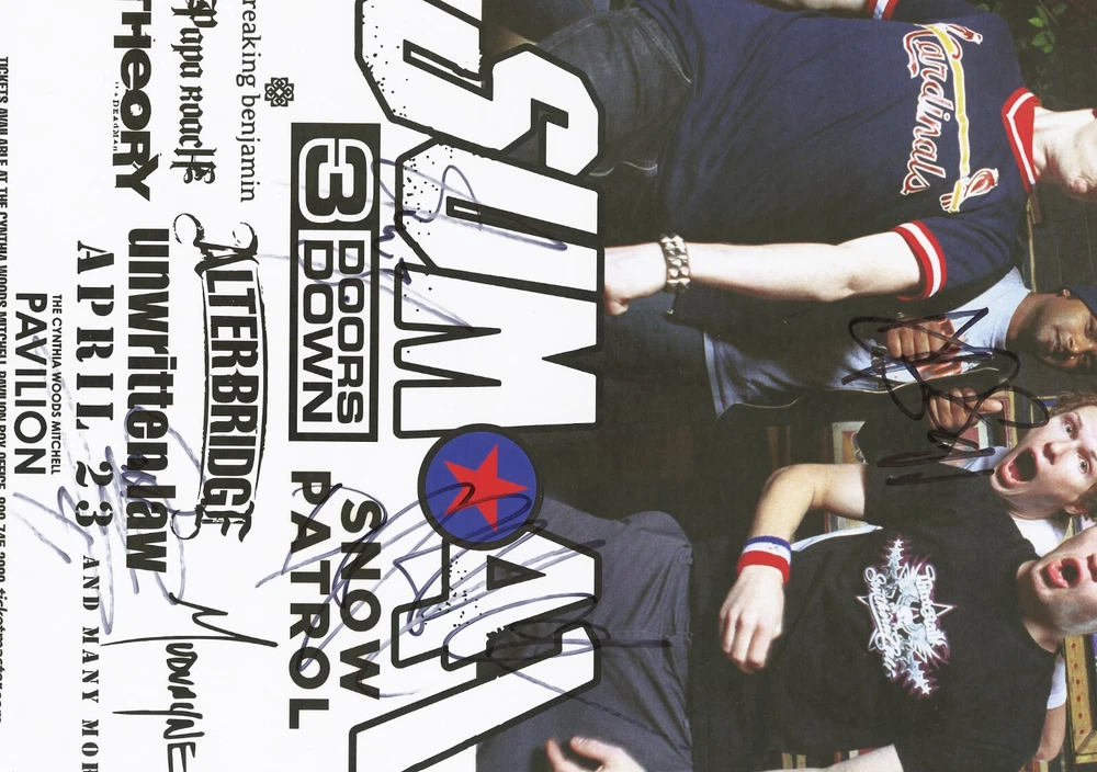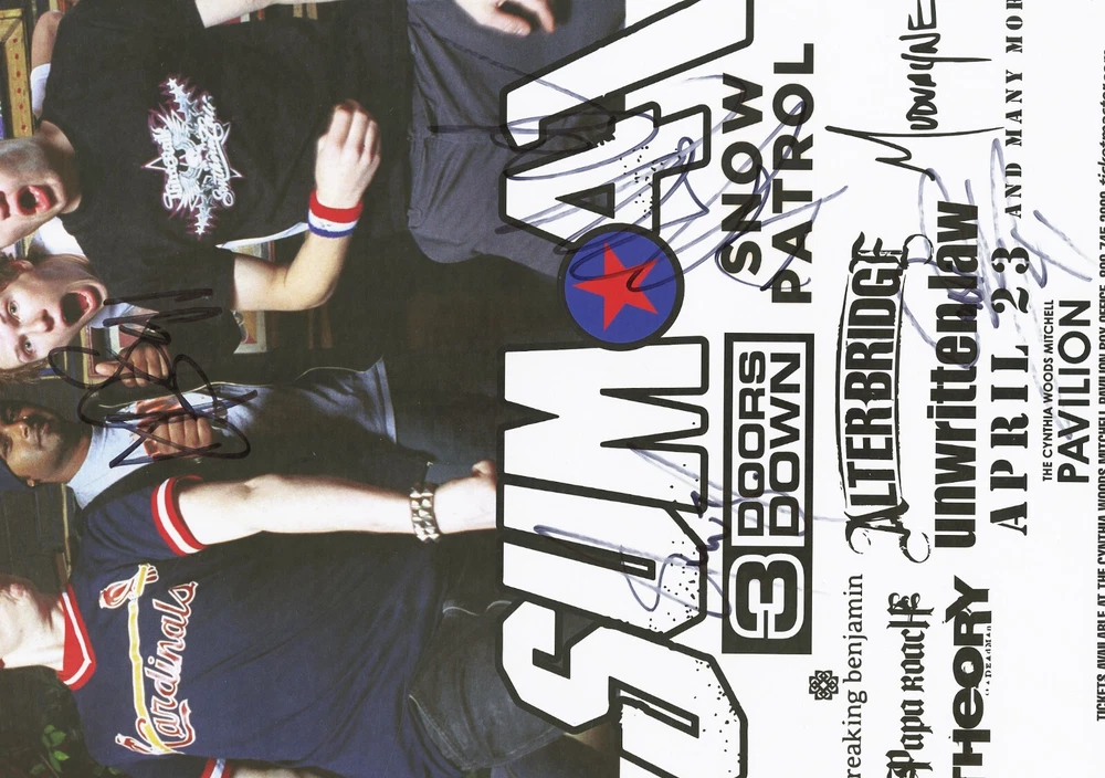 Sum 41, 3 Doors Down, Snow Patrol, Breaking Benjamin, Alter bridge, Mudvayne, Theory of a Dead Man, Unwritten Law 2005 concert poster Woodlands, TX Signed by Steve Jocz, Deryck Whibley, Dave Baksh and Jason McCaslin after the show Size 11" x 17"