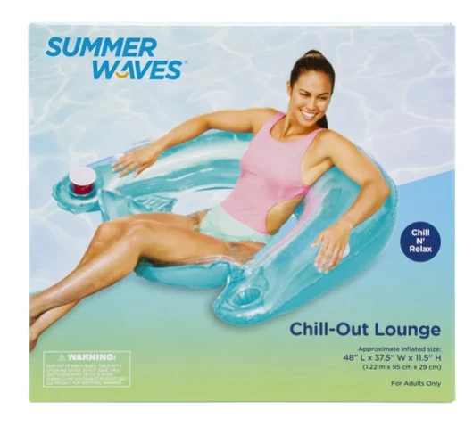 The Summer Waves Chill-Out Lounge Pool Float offers the perfect way to recline on water. This easy-to-inflate floatie features a comfortable back support, and 2 heavy-duty grip handles for a secure ride. It also comes with 2 convenient cup holders to keep your refreshments right by your side. The inflatable lounge is made for all genders, and is suitable for adults. You will never want to leave the pool while being on this exclusive lounge. Summer Waves Inflatable Chill-Out Lounge Pool Float, Blue, for Adults, Unisex: Inflatable water chair float for pools, beaches and lakes 2 heavy-duty handles for secure lounging Comfortable cushioned backrest and armrests 2 cup holders to keep your drink handy Attractive transparent top and tropical colors Durable, puncture-resistant materials Repair patch included Approximate deflated size: 60" x 39" (1.5 m x 99 cm) Approximate inflated size: 48" L x 37.5" W x11.5" H (1.2 m x 95 cm x 29 cm) Age: Adults