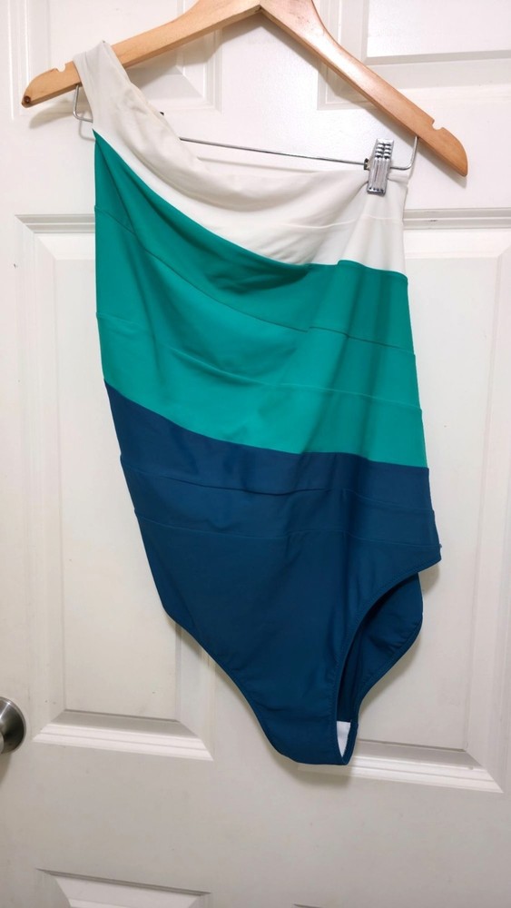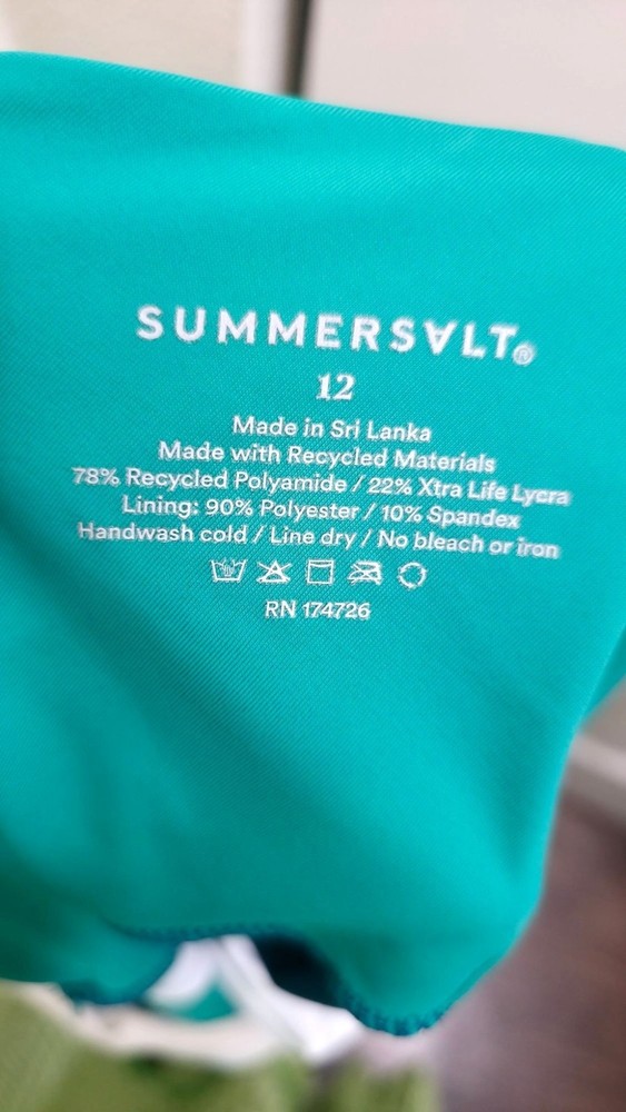 This one-shoulder swimsuit by Summersalt combines style with sustainability. Made from recycled materials, it offers a flattering fit in vibrant teal and blue tones. • Recycled materials: 78% recycled polyamide, 22% extra life Lycra • Lining composition: 90% polyester, 10% spandex • Handwash cold; line dry • Colorblock design with teal, blue, and white • One-shoulder style for modern elegance CONDITIONS pre owned, minor wear, no visible flaws, great conditions. see photos for more details.