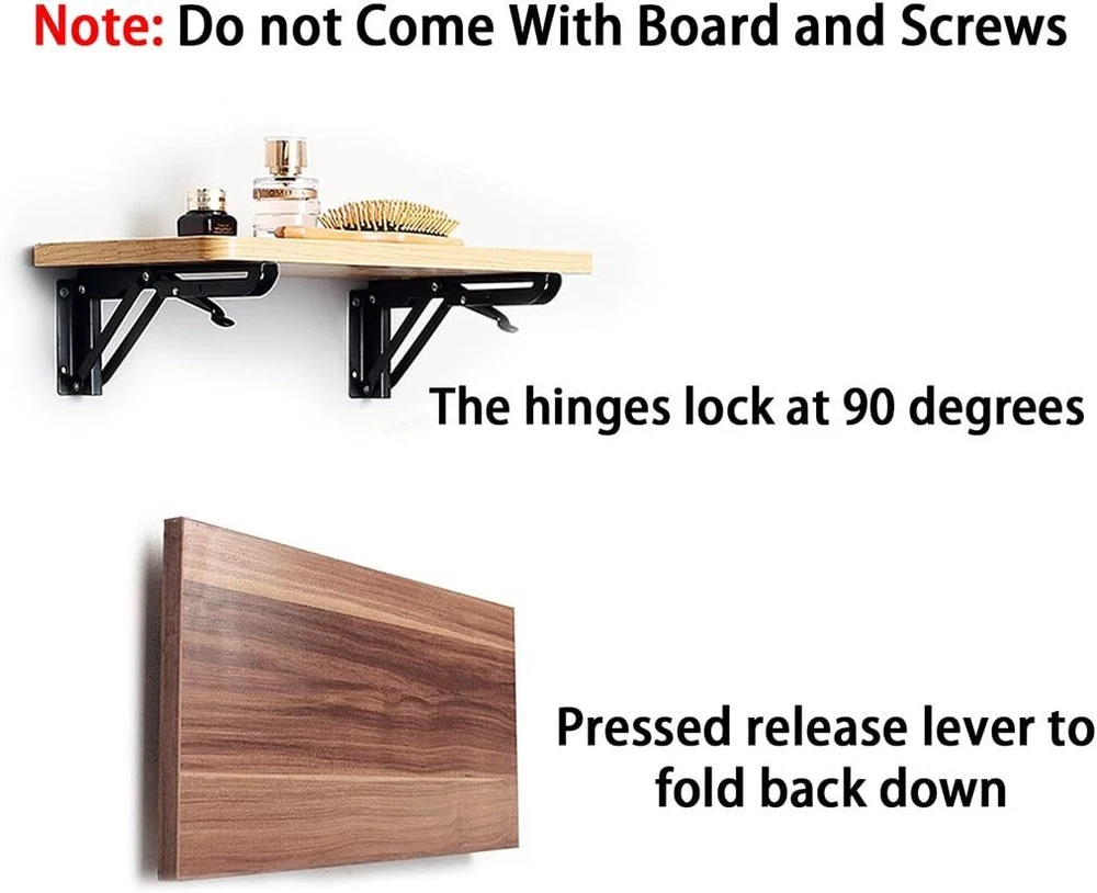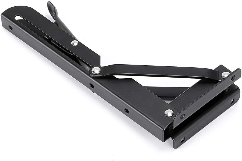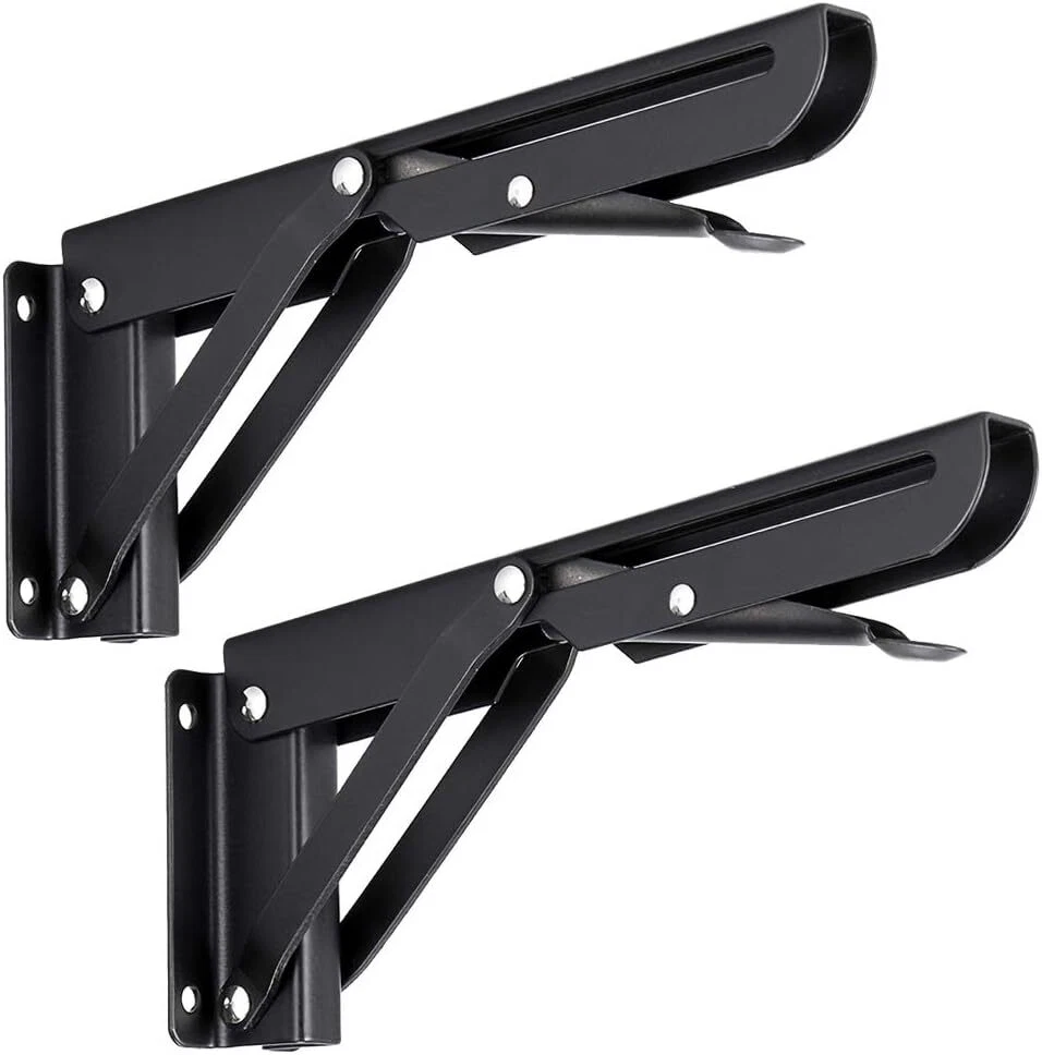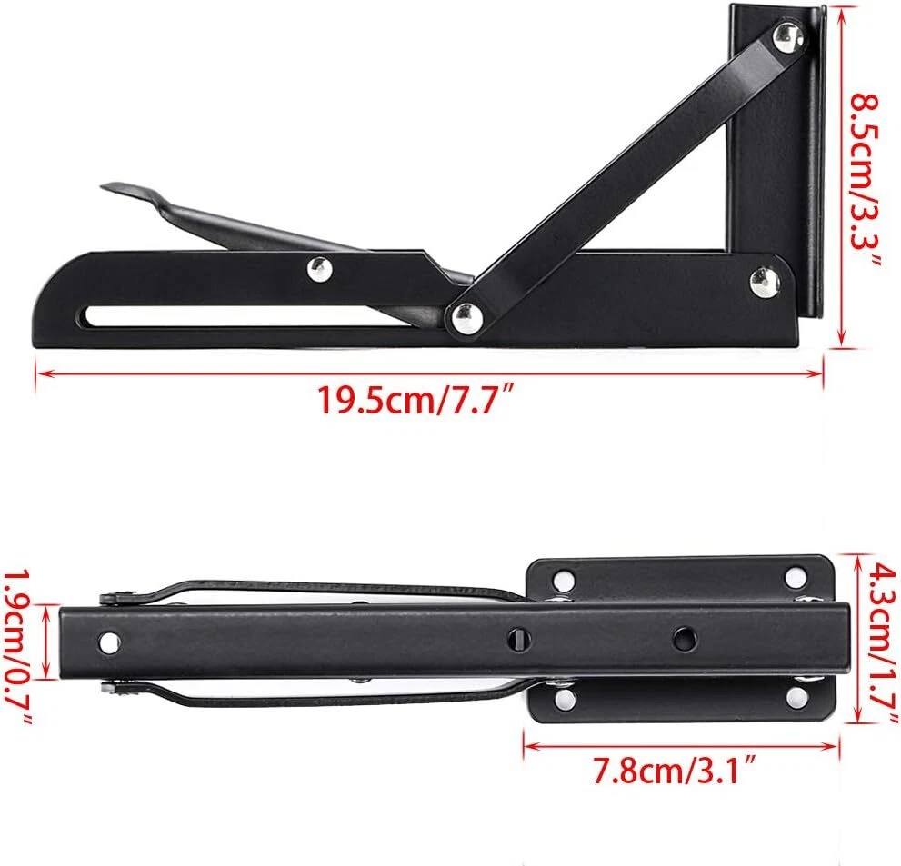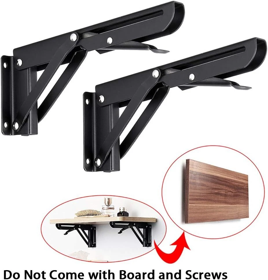 Sumnacon Sturdy Folding Shelf Brackets - Heavy Duty Black Metal 8 Inch, Product Details Manufacturer: Sumnacon Part Number: ULSMC00465 Item Weight: 14.9 ounces Package Dimensions: 8.07 x 2.72 x 1.57 inches Is Discontinued By Manufacturer: No Size: 8 Inch Finish: Coated Shape: Triangular Included Components: No Batteries Included?: No Batteries Required?: No Color: Black Brand: Sumnacon Material: Steel Finish Type: Coated Mounting Type: Wall Mount Sturdy Material - Made of quality steel with Strong Smooth surface& Precise Action. Max. load approximately 45KG/ 99lb; Size: 9cm*24cm(3.5"*9.5"); Hole: approximately 5mm. Note: Folding Shelf Brackets do not come with hardware, you can purchase suitable screws according to your special needs. Widely Application - These folding brackets are ideal for many do-it-yourself jobs around the house. You can use steel Folding arms to built a collapsible bench on your backyard fence for additional seating; Use to make a collapsible table for your room; Installed a folding counter in your BBQ trailer; Build a table that folds up from the wall,and so on. Space Saving: The hinges lock at 90 degrees. When you want to collapse the table simply press the release arm. Excellent performance suitable for limited spaces when you want a work surface that can be folded down and out of the way. Helps keep your room organized. Suitable for shop,stores,workshops,boats,motorhome,backyard,trailer,room,kitchen,blacony,bathroom and household as a support bracket. Better Living Environment - It can make your home more clean and tidy after you place a piece of wood board on this Brackets. Meanwhile, it can bring artistic feeling to your house. Features: .If you mount your own table THIS is the product. It is PHENOMENALLY strong. The arms fold and stay put so you won't need to bungee the bottom of you table to stop it from moving around. .They click into place when extended and easliy fold back down when release lever is pressed. .Add s fold-down counter top extension for your RV. .Use these hingers in your motorhome to built a folding table, will be allows you more room when needed. .Built a small workstation table in your garage using two of these. Easy to lift and unlock to fold down. .Very stout, easily operated with a very positive locking action. .Bracket bolts to the wall and hinges outward providing an extremely sturdy support for your table or bench. .These brackets bolts to the wall and hinges outward to provide an extremely solid support for your bench or table. .When you want to collapse the table you release a small catch and the arm folds back into the channel which is mounted to the wall. Specifications: Maximum Load Weight Can Reach 45kg. Color: BlackHole: approximately 5mm Material:Steel + Baked Black Paint Angle Degree : 90 Degree Package included 2 x Triangular folding bracket ( Not including Board and screws )