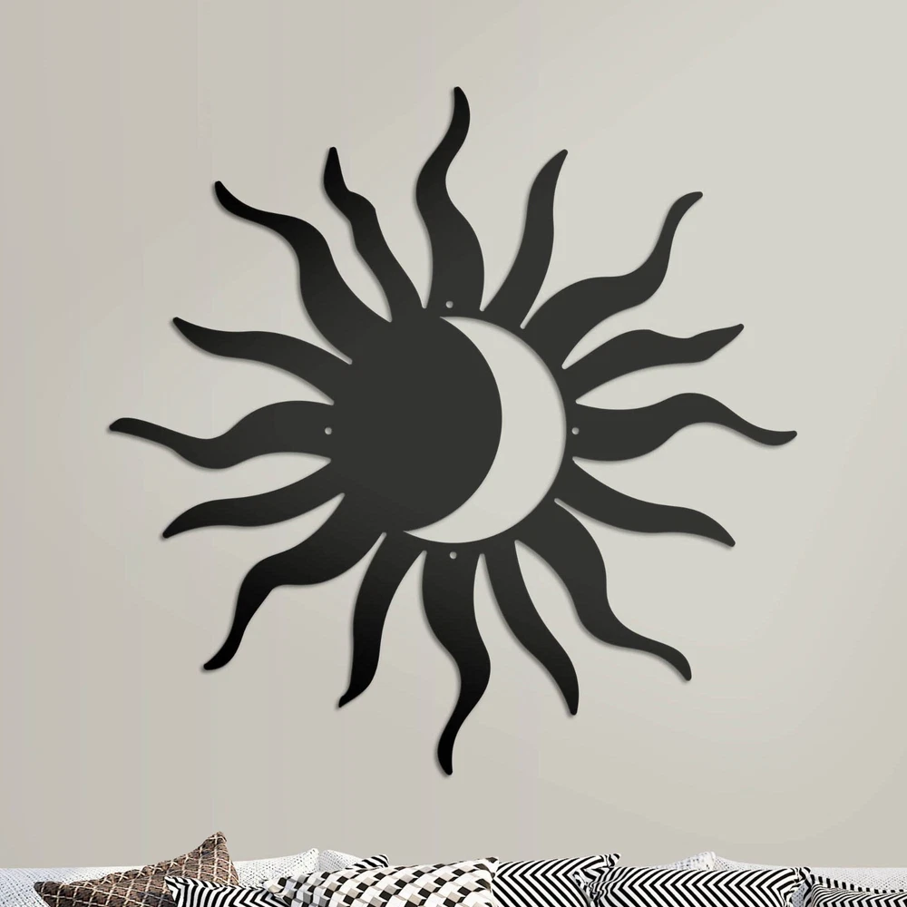 Design concept: This design seeks to capture the essence of this cosmic interplay, a harmonious blend of opposites. The sun, a symbol of vitality and energy, radiates its fierce intensity, while the moon, with its gentle crescent shape, suggests tranquility and mystery. As a designer with a decade of experience in ironwork, I aimed to create a piece that not only celebrates the celestial beauty of our universe but also provokes contemplation about the balance between opposing forces. When you gaze upon this artwork, you're invited to ponder the intricate relationship between day and night, light and shadow, in a way that is both striking and thought-provoking. It's a testament to the power of design to capture the wonder and complexity of our world, one metal curve at a time. We can customize anything by design. If you would like some changes made, please let us know. Material: High quality steel. Sizes: 12 inch, 16 inch, 18 inch, 24 inch, 30 inch, 36 inch. Color: Black, Silver, White, Gold, Blue, Brown, Green, Orange, Red, Pink, Purple, Yellow, Other colors (please tell us the serial number of the color you need). Easy mountin: screws are included so you can easily mount it to your wall or door, inside or on the exterior of your house,hang it on a wall of any room or outside on your porch. Gift: Birthday Gift,Graduation Gift,Anniversary Gift,Engagement,Marriage Gift,Divorce Gift,Anniversary Gift,Bar Mitzvah Gift,Father's Day Gift,Mother's Day Gift,Valentine's Day Gift,Festivals Gift,Housewarming Gift,Opening Gift,Commemoration Gift,Promotion Gift. Crafted from high-quality materials, our metal signs are laser cut in our modern production facility using Powder Coating Technology for durability and outdoor use. Pre-designed holes are included for easy hanging. Our metal signs without LED lights can be used both indoors and outdoors without a roof, and can withstand weather changes. However, metal signs with LED lights must be used indoors or outdoors with a roof near electrical outlets, as the LEDs require a power source. At any time, our team is ready to assist you with any questions you may have about our product. CAUTION: Handle the metal plate with care as the edges of the metal plate may be sharp. Keep signs out of the reach of children and pets. Also, pay attention to the location of the signage and make sure it is not in direct contact with water or other liquids to prevent damage. Personalized Sign, Metal Sign, Custom Metal Sign, Personalized Metal Art, Customized Sign, Metal Wall Art, Custom Metal Artwork, Personalized Home Decor, Custom Metal Decor, Personalized Gift, Metal Gift, Custom Gift, Personalized Name Sign, Custom Name Sign, Metal Name Sign.