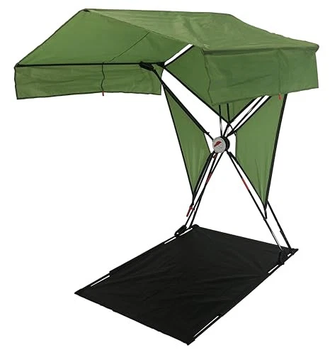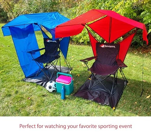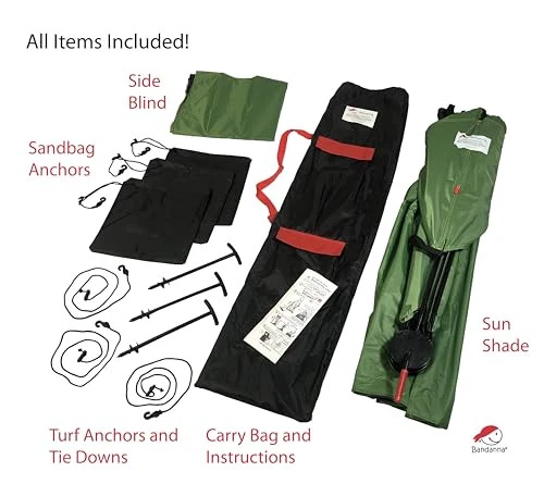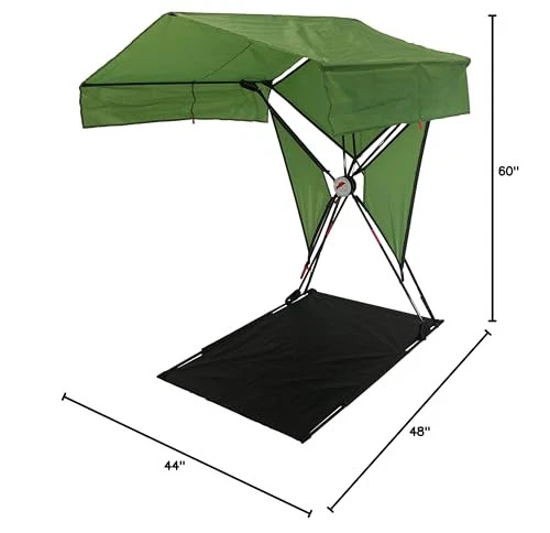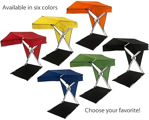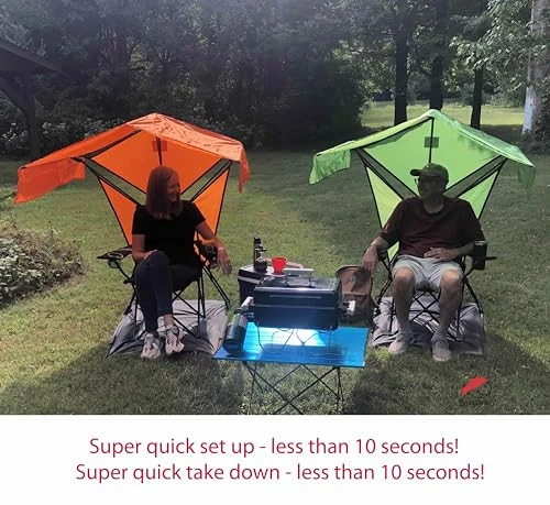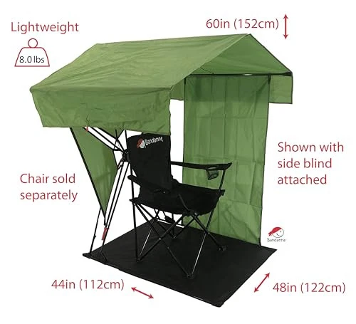 Sun shelter that is fast and easy to set up and take down for use on the beach, during outdoor sporting events such as soccer, while camping, and many other uses. SUPER FAST AND EASY SET UP AND TAKE DOWN: Sets up for use in less than 10 seconds AND can be taken down for storage in our carry bag is less than 10 seconds. LIGHTWEIGHT AND EASY TO CARRY: Weighs only 8 pounds or so and folds up into a compact size for storage in our custom carry bag. DURABLE CONSTRUCTION: Constructed from high-quality durable, waterproof nylon and has a stable fiberglass frame that can withstand all the environmental elements. POWERFUL UV PROTECTIVE MATERIAL: Features a large top cover and rear screen for sun protection. Further, our side blind accessory attaches to either side of the shade to provide additional protection even when the sun is low on the horizon. Our shade also comes with a large floor that provides a comfortable and clean base for your feet and personal belongings. LOTS OF USES: A must-have for a day at the beach, soccer games, tailgating, camping, baseball, softball, and the like. CHAIR NOT INCLUDED.