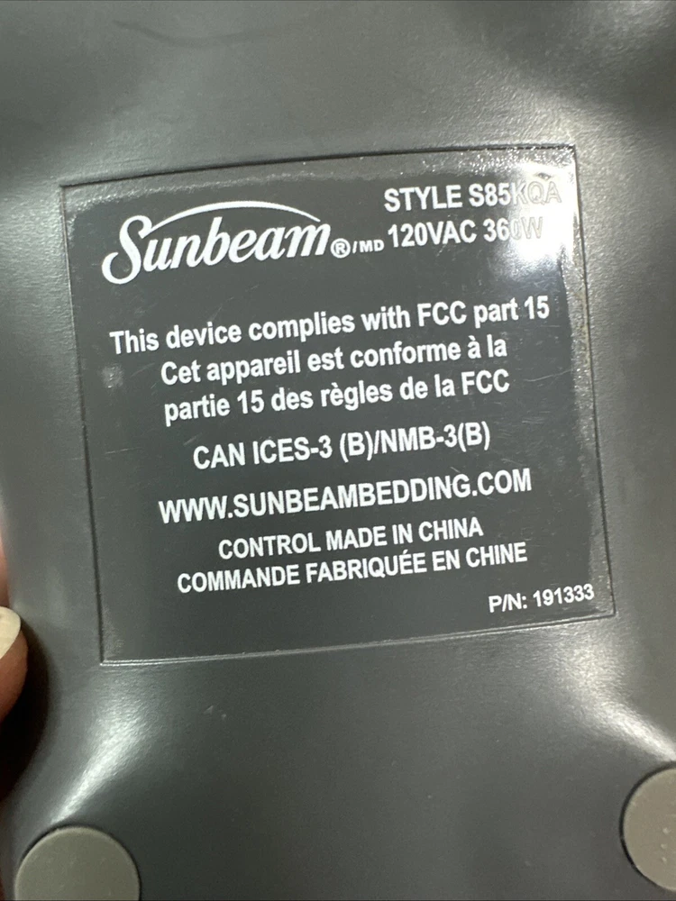 UPC:Does not applyFeatures:ElectricStyle:ModernSize:ALLRoom:BedroomColor:Graygtin13:Does not applyCountry/Region of Manufacture:ChinaMPN:S85KQABrand:SunbeamPattern:Solid ColorType:Blanket Control