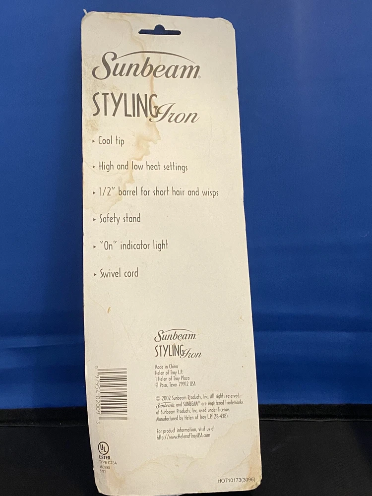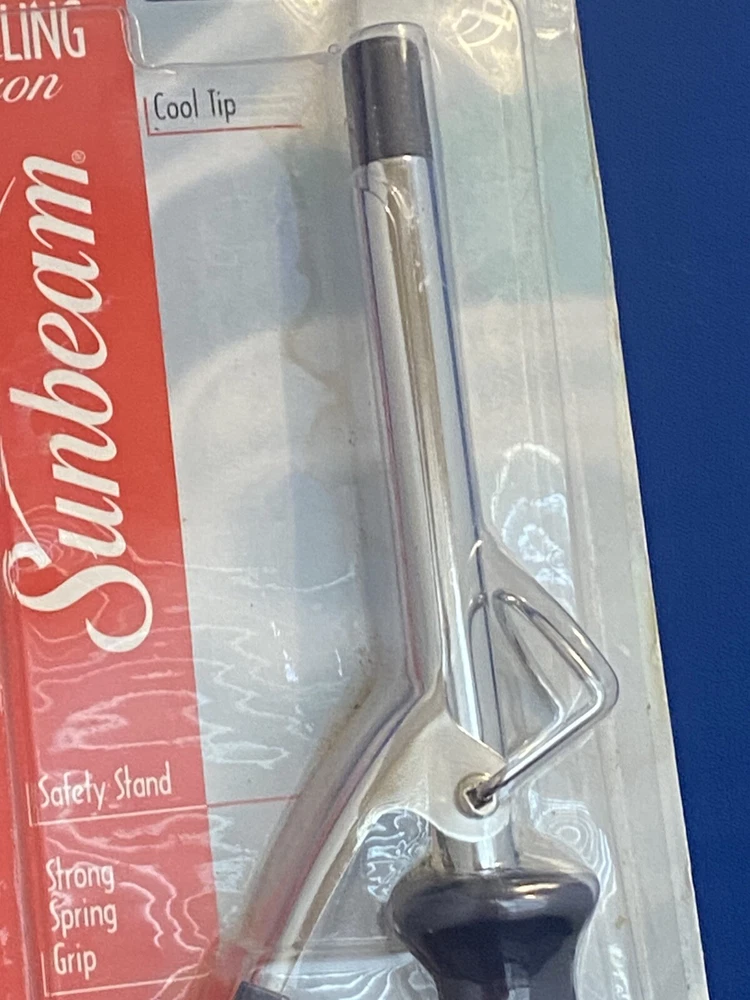 Sunbeam Styling Iron 1/2'' Barrel with Cool Tip New Get the perfect curls and sleek styles with the Sunbeam 1/2" Styling Iron! Designed for precision and ease, this classic 2002 model is ideal for creating defined waves, tight curls, or adding volume to your hair. The 1/2-inch barrel allows for versatile styling, while the swivel cord ensures tangle-free maneuverability. With a cool tip for safe handling and a built-in safety stand for secure storage, this styling iron is both convenient and reliable. Whether you're looking for everyday elegance or a glamorous touch, the Sunbeam styling iron delivers salon-quality results right at home. Don't miss out—get yours