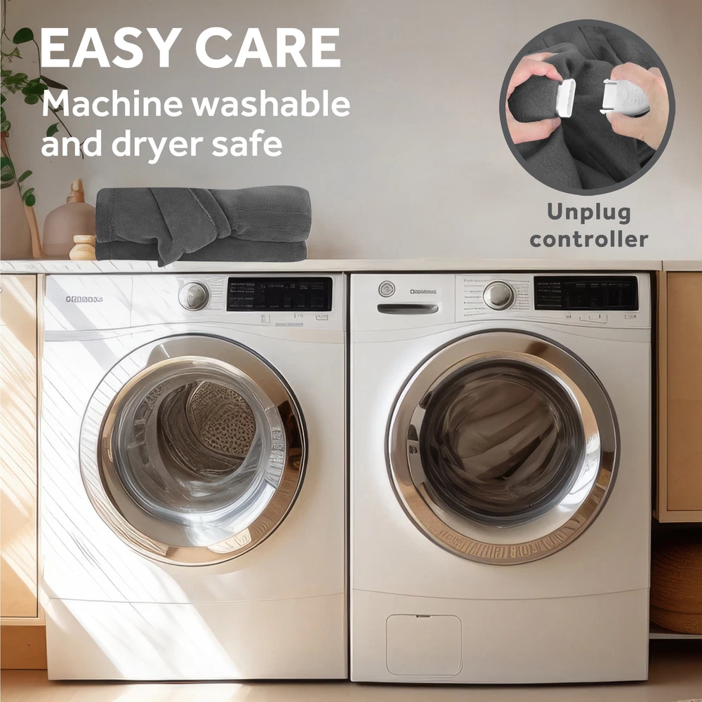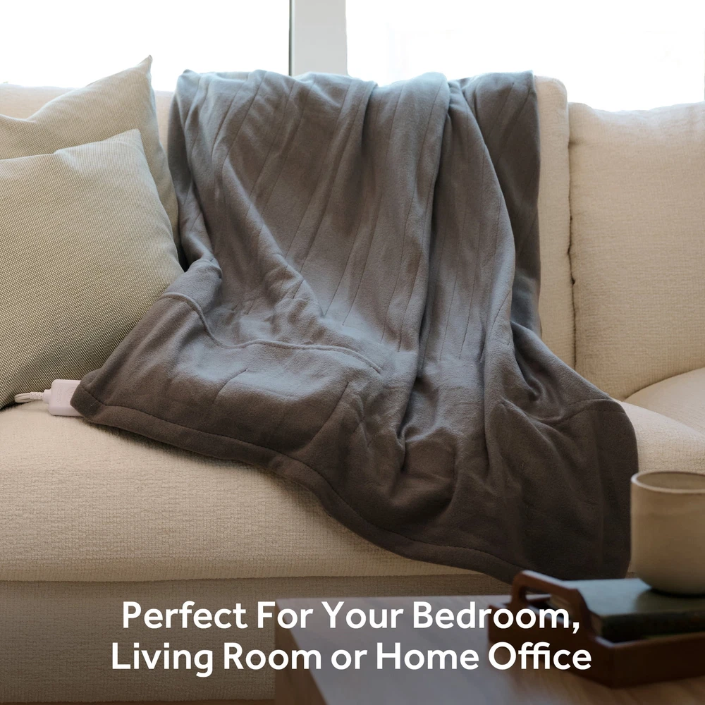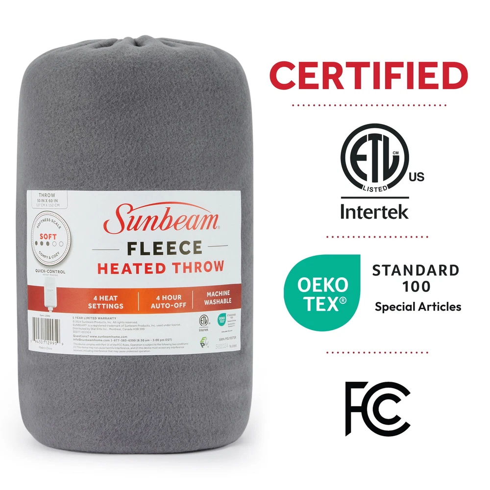 Sunbeam Gray Fleece Electric Heated Throw wraps you in comfy, cozy warmth on chilly nights. Indulge in the cozy fleece fabric that keeps you toasty while you runwind. The stylish 50" x 60" electric blanket makes a great accessory while relaxing on the couch, bed or your favourite chair and the gray color complements any décor. The throw features an easy-to-use push-button controller with 4 adjustable heat settings, letting you find the perfect temperature. Plus, the 4-hour auto shut-off function for added safety and peace of mind. The premium heated wires are equipped with advanced technology to ensure continuous even heat distribution. For easy care, simply detach the controller and machine wash and dryer safe. It remains soft wash after wash. Sunbeam is an American brand trusted for over 125 years in electric home appliances. All Sunbeam electric bedding products are ETL certified. Warm up with ease: Simple push-button controller Customizable comfort: 4 heat settings: warm, low, medium, high Safety first: 4-hour auto shut-off, overheat protection, certified: cETLus, OEKO-TEX Comfy and cozy material: Soft fleece fabric, ideal size to snuggle, 50" x 60" Multi-Colors Available: Grey, Poseidon Easy Care: Machine washable, dryer safe, 100% high-quality polyester