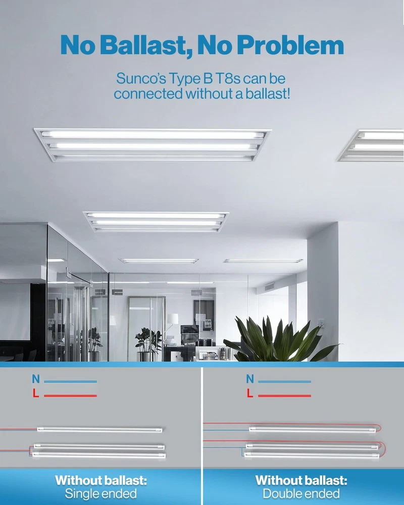 Store New Arrivals Add to Favorite View Feedback Contact Sunco 30 Pack 4Ft LED T8 Frosted Lens Ballast Tube for Fluorescent, 18W 2200 LM, Daylight 5000K CCT, Non-Dimmable, Type B 100-277V, 50,000 Hour UL Description Item model number T8_BY_F-18W-5K-30 Light Source Type LED Style Modern Number of Items 30 Power Source Corded Electric Incandescent Equivalent Wattage 40 Watts Country of Origin China Light Direction Adjustable Batteries Included? No Specification Met UL Listed, DLC Listed Controller Type Push Button Unit Count 30.0 Count Batteries Required? No Light Type LED Bulb Shape Size T8 Material Glass Tube, Aluminum and Polycarbonate Housing Efficiency 122.22 lumens/watt Specific Uses For Product Garage, Workshop, Basement, Warehouse, Office White Brightness 2200 Lumens Indoor/Outdoor Usage Indoor Light Source Wattage 18 Watts Brightness 2200 Lumen Control Method App Light Color Daylight White Item Weight 15.77 pounds Connectivity Technology Normal bulb Special Features Instant On, Ballast Bypass, Single Ended Power (SEP), G13 Base, T8/T10/T12 Compatible Special Feature Instant On, Ballast Bypass, Single Ended Power (SEP), G13 Base, T8/T10/T12 Compatible Color Rendering Index 85 Bulb Base G13 Color Temperature 5000 Kelvin Color 5000k Frosted Wattage 18 watts Beam Angle 160 Degrees Shape Tubular(T) Power Consumption 18 Watts Voltage 120 Volts Finish types Frosted Product Dimensions 48"W x 1.12"H Size 30 Count (Pack of 1) T8 LED Tube Single Sided Ballast Bypass Type B BRIGHT LIKE DAYLIGHT - Replace your old fluorescent tube lights and instantly double the brightness of your garage or workshop by switching to our LED Type B T8 Tube Lights. VERSATILE - Install in garages, workshops, warehouses, offices, or more. COMMERCIAL GRADE - We test each product for optimal performance and safety. Certification: UL. SUNCO BENEFITS - 7 Year Protection! Sunco is proudly based in the USA, offering quality products at affordable prices backed by industry-leading warranties and knowledgeable support specialists. Product Description Similar Products Add to Cart Customer Reviews 4.4 out of 5 stars 547 3.9 out of 5 stars 88 4.4 out of 5 stars 1,061 4.5 out of 5 stars 421 4.7 out of 5 stars 448 4.5 out of 5 stars 626 Price — — $124.99 $ 124 . 99 — — — Lumens 2200 Lumens 2200 Lumens 1800 Lumens 6500 Lumens 7200 Lumens 8500 Lumens Wattage 18W 18W 15W 50W 60W 72W Moisture Rating Damp Rated Damp Rated Damp Rated Damp Rated Damp Rated Damp Rated G13 Base ✓ ✓ ✓ - - - Voltage 120/277V 120/277V 120/277V 120V 120V 120V Compatibility T8, T10, T12 T8, T10, T12 T8, T10, T12 - - - Lens Style Frosted Clear Clear Prismatic Prismatic Prismatic Ballast Bypass ✓ ✓ ✓ - - - 50,000 hours 50,000 hours 50,000 hours 50,000 hours 50,000 hours 50,000 hours ABOUT US We offer the best prices around on high quality products. Our E-store includes media such as books, movies, music and games while offering electronics, toys, sporting apparel, clothing, tools, general home, garden items and more. SHIPPING We are always working hard to ensure your package arrives as soon as possible. Please understand that some factors like weather, high postal traffic, and the performance of shipping companies are outside of our control. We offer free shipping to the lower 48 states and ship within 2 business days of payment, usually sooner. We do not accept P.O. Boxes. Please provide a physical address. For shipping outside of the continental USA, we only use eBay's Global Shipping Program.The item is shipped to KY and then sent to the rest of the world. International customers are responsible for all duties and taxes. Continue to check out in order to calculate costs for shipping the item to your country. Messages regarding eBay's Global Shipping Program MUST be directed at eBay EXCLUSIVELY. RETURNS We offer a 30-Day Return Policy on items which you are not completely satisfied with. You have the option for a full-refund or an exchange of the item. No returns are available on items shipped outside of the USA. PAYMENT We accept PayPal. CONTACT US This page content is yet to come Please ad us to your favorite seller and visit again later Thank You CUSTOMER SATISFACTION We try our very best to make sure every customer is completely satisfied. If there's a problem, message us! We're happy to help. WE ACCEPT Copyright © 2021 AutoDS. | All Rights Reserved