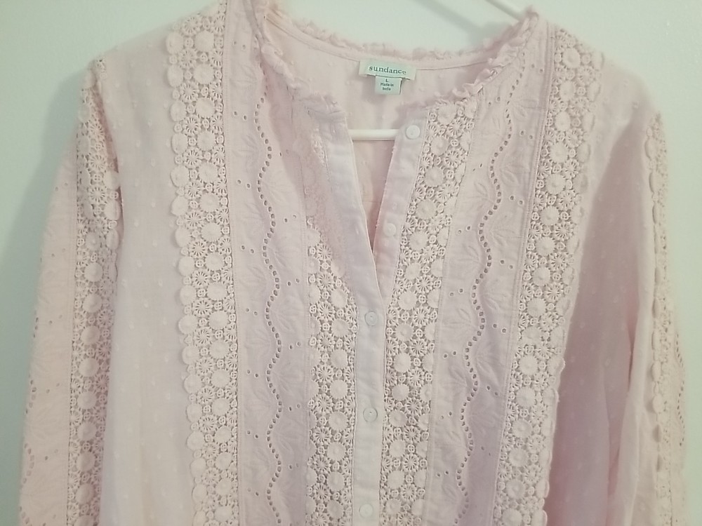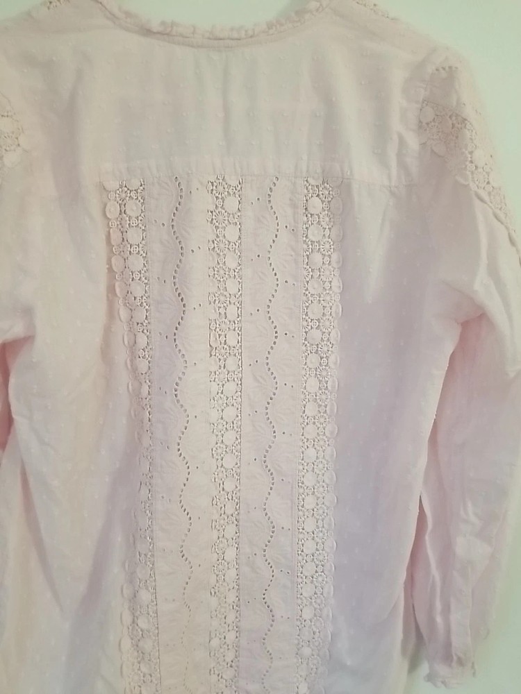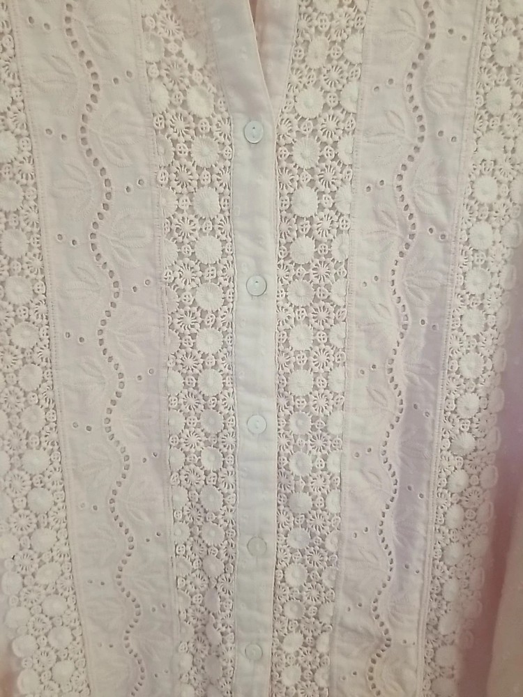 Excellent condition pretty Dots crochet and eyelet. It measures 22 inches across the chest and 25 inches from top of shoulder to bottom. THANK YOU.